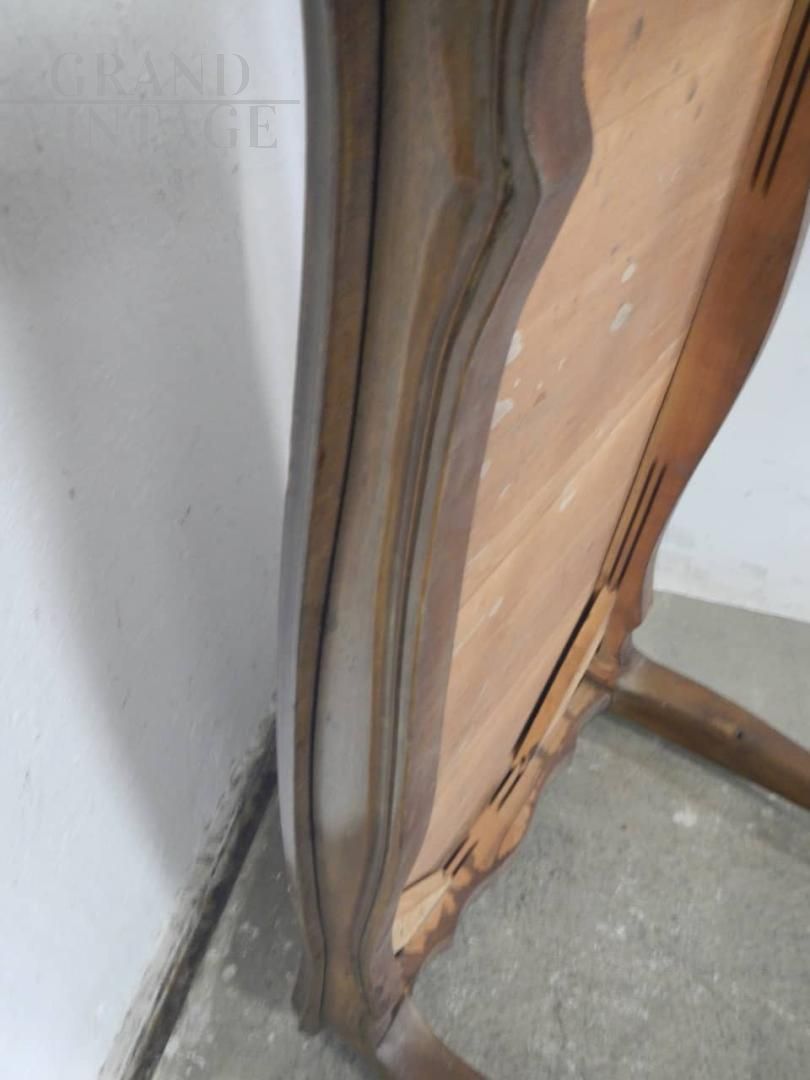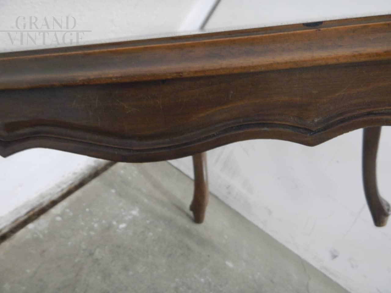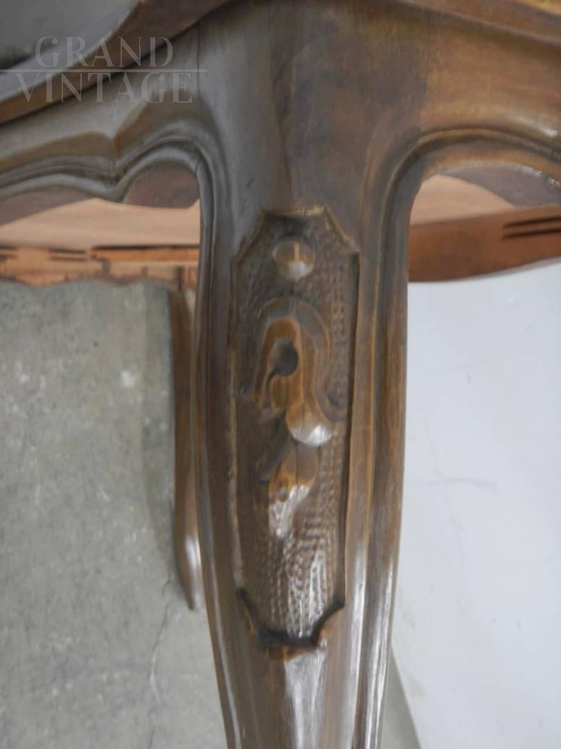 Tavolino da salotto vintage stile antico in legno di noce con piano in listellare di noce e gambe mosse con intaglio floreale. In buone condizioni.