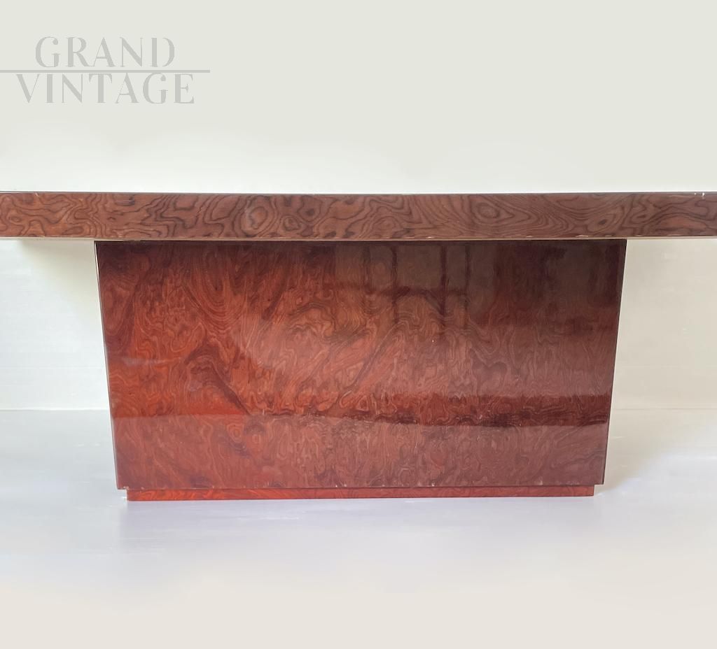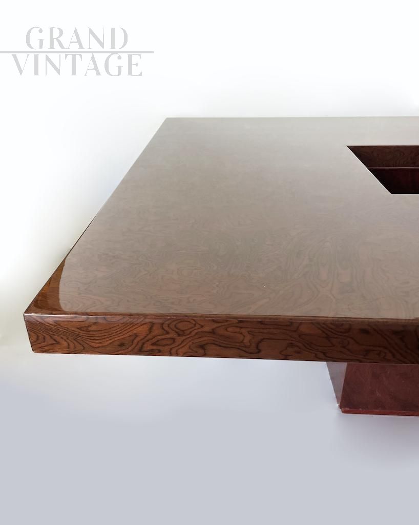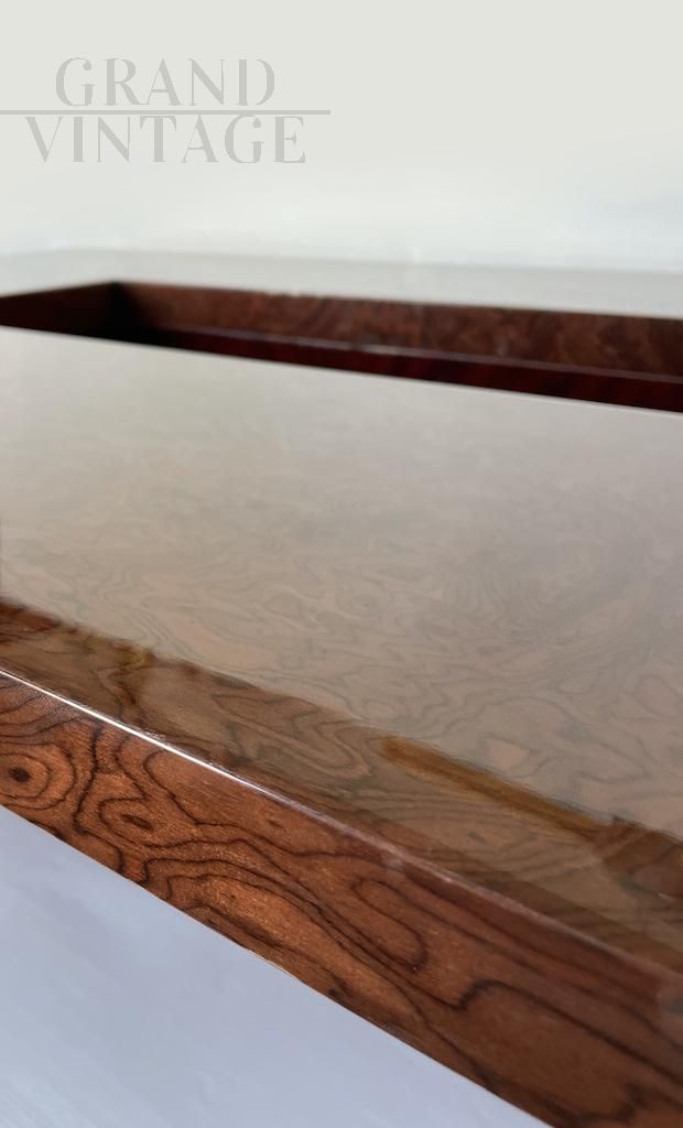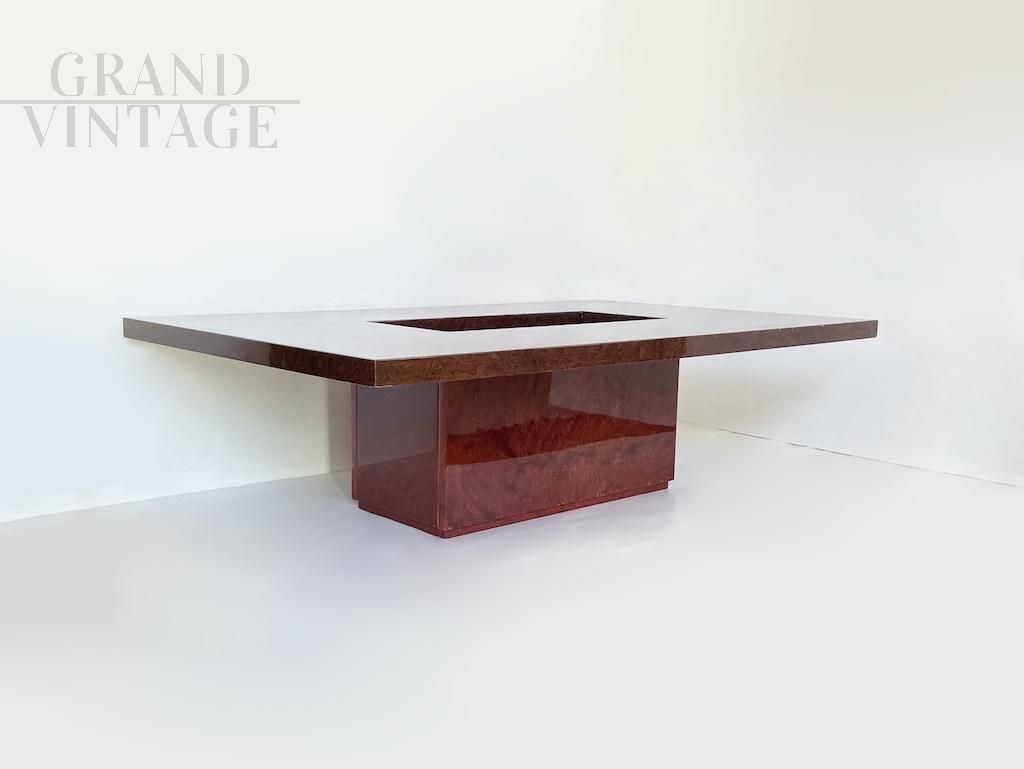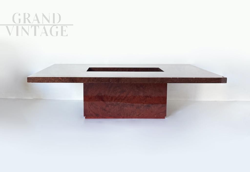 Particolare tavolino da salotto in stile Aldo Tura e Willy Rizzo, realizzato interamente in radica e con utile fessura rettangolare al centro.