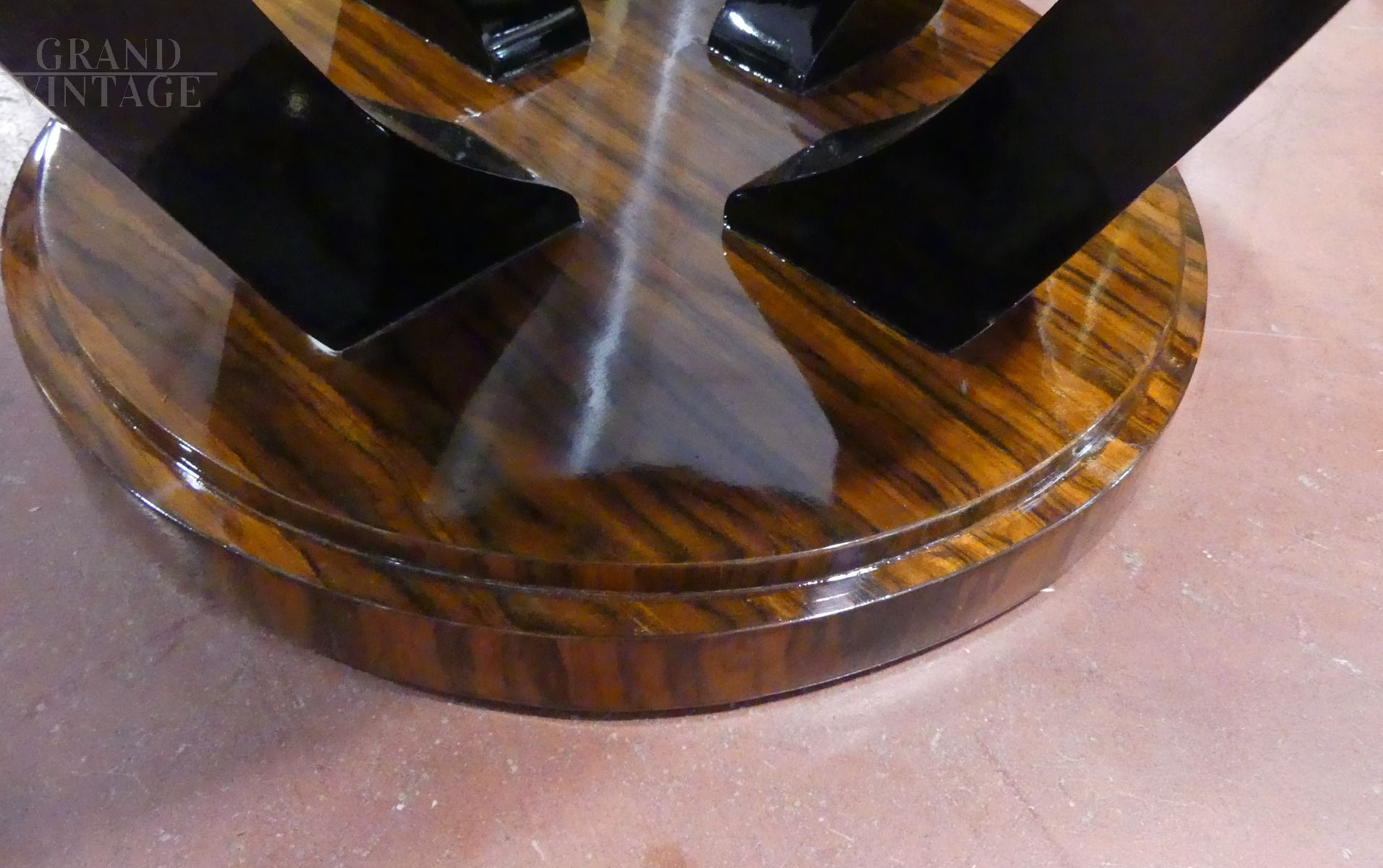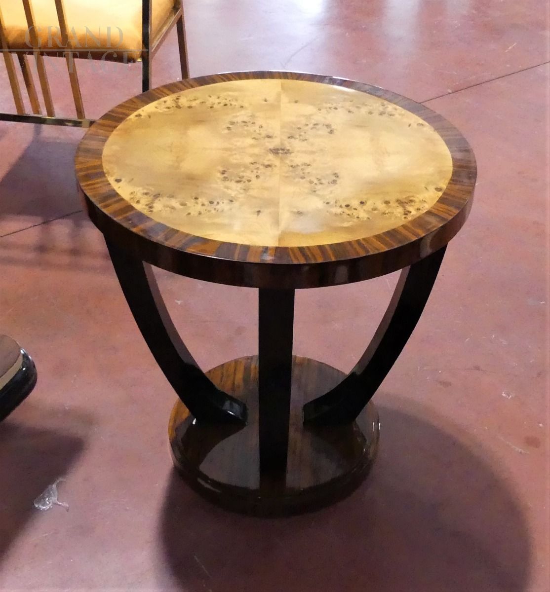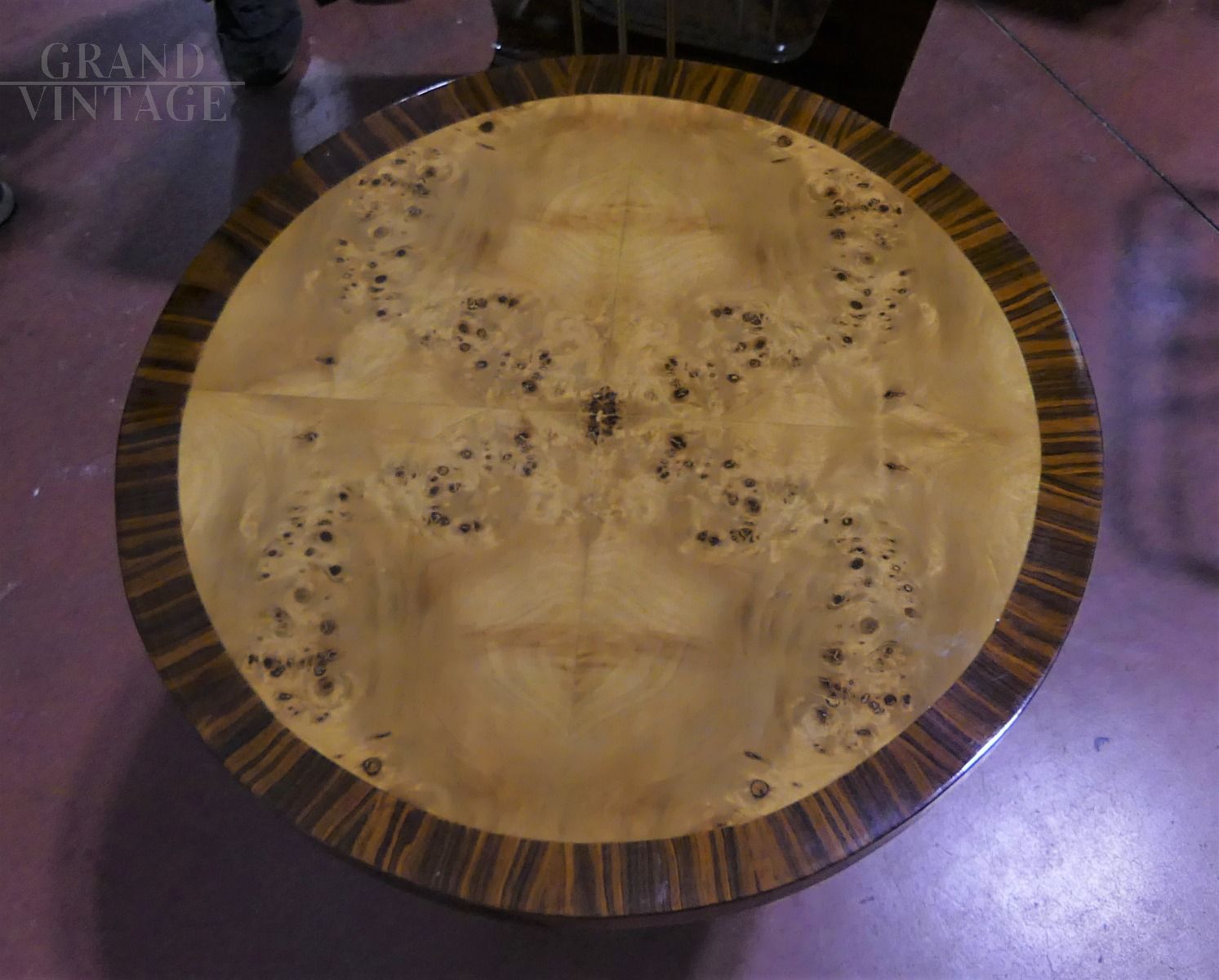 Tavolino in stile Art Déco di recente realizzazione, il piano è in una bellissima radica di betulla, e la struttura è in radica di palissandro e legno ebanizzato.