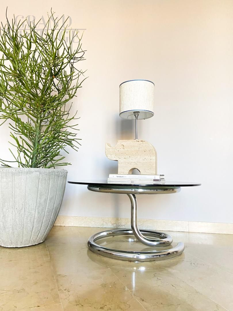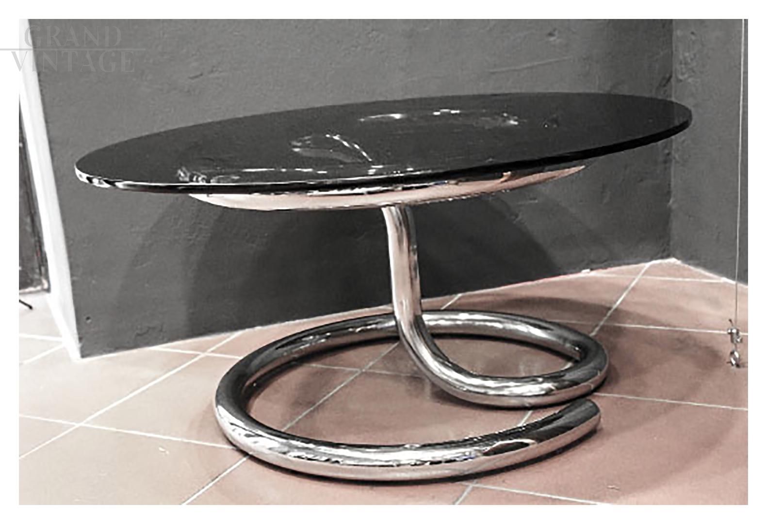 Tavolino design di Giotto Stoppino in tubolare metallico cromato con piano rotondo in vetro fumé, Italia 1970. In ottimo stato di conservazione.