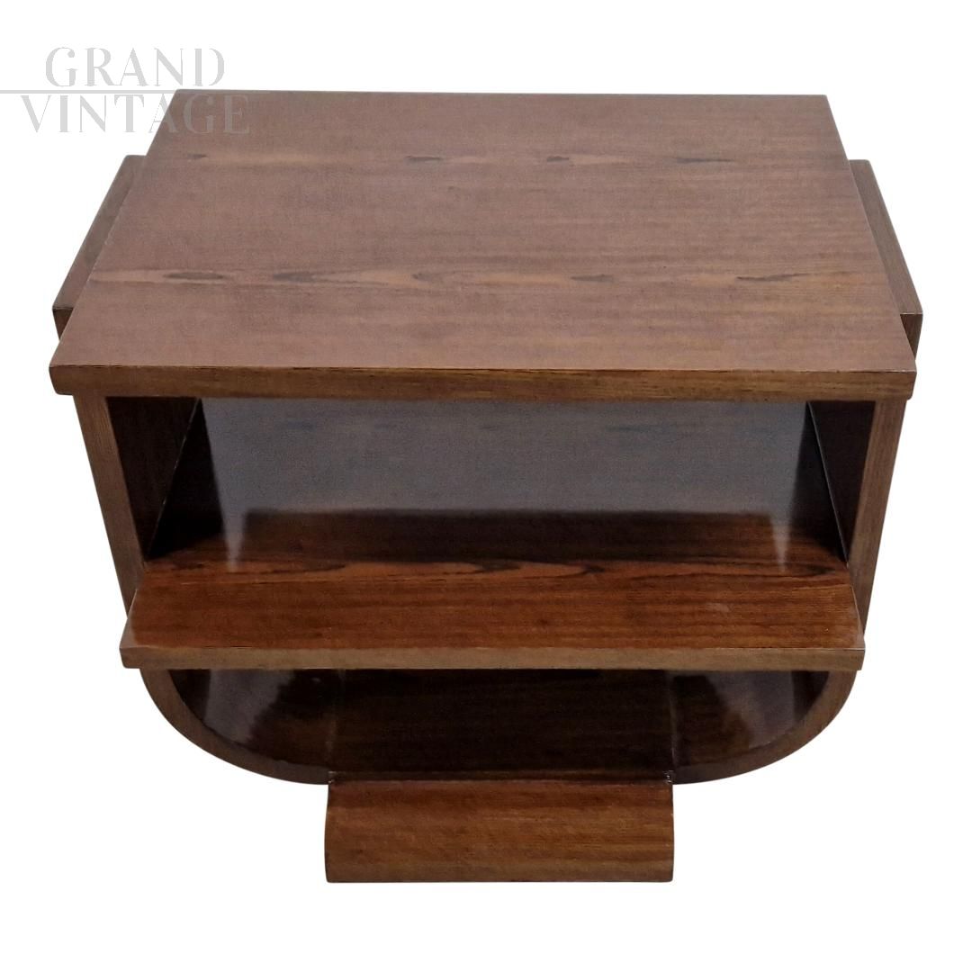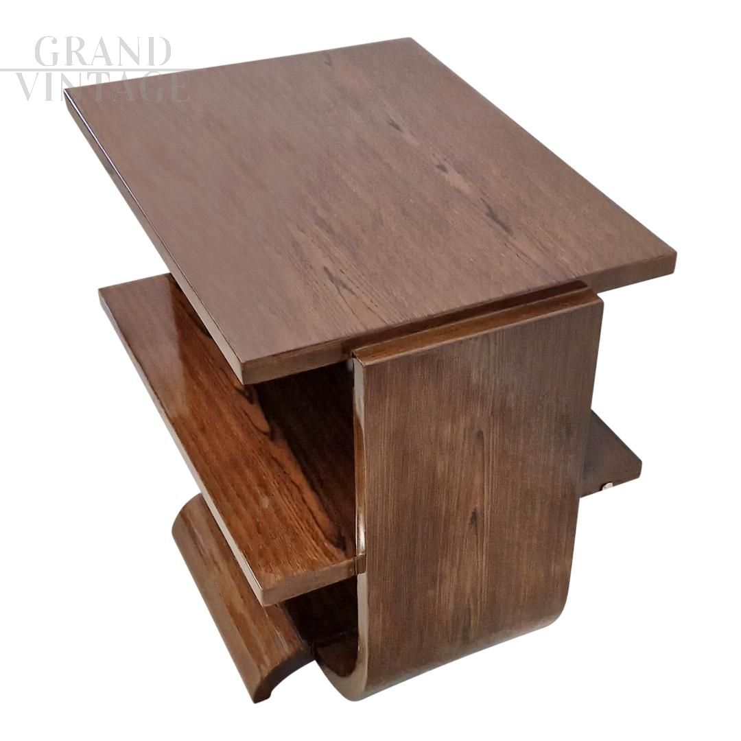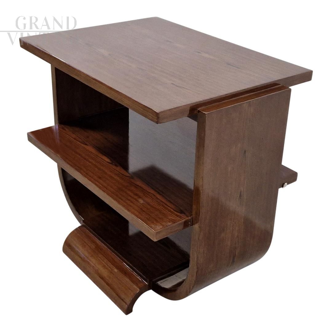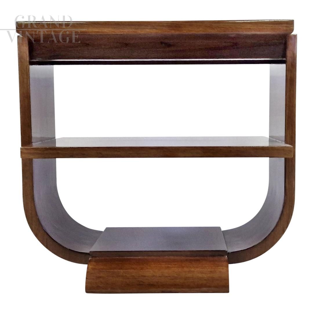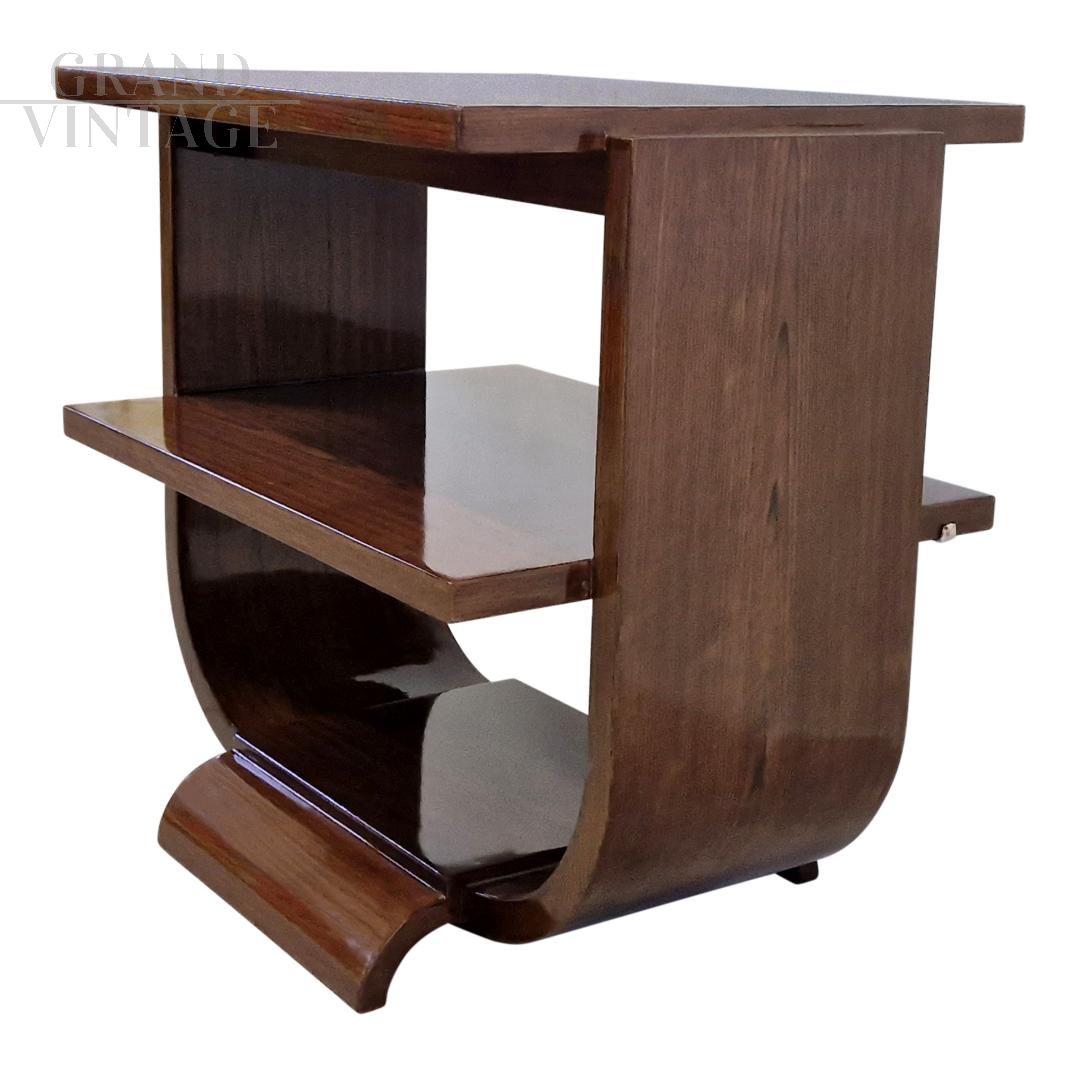 Tavolino geometrico di linea Art Déco in legno di mogano, con mensola centrale.