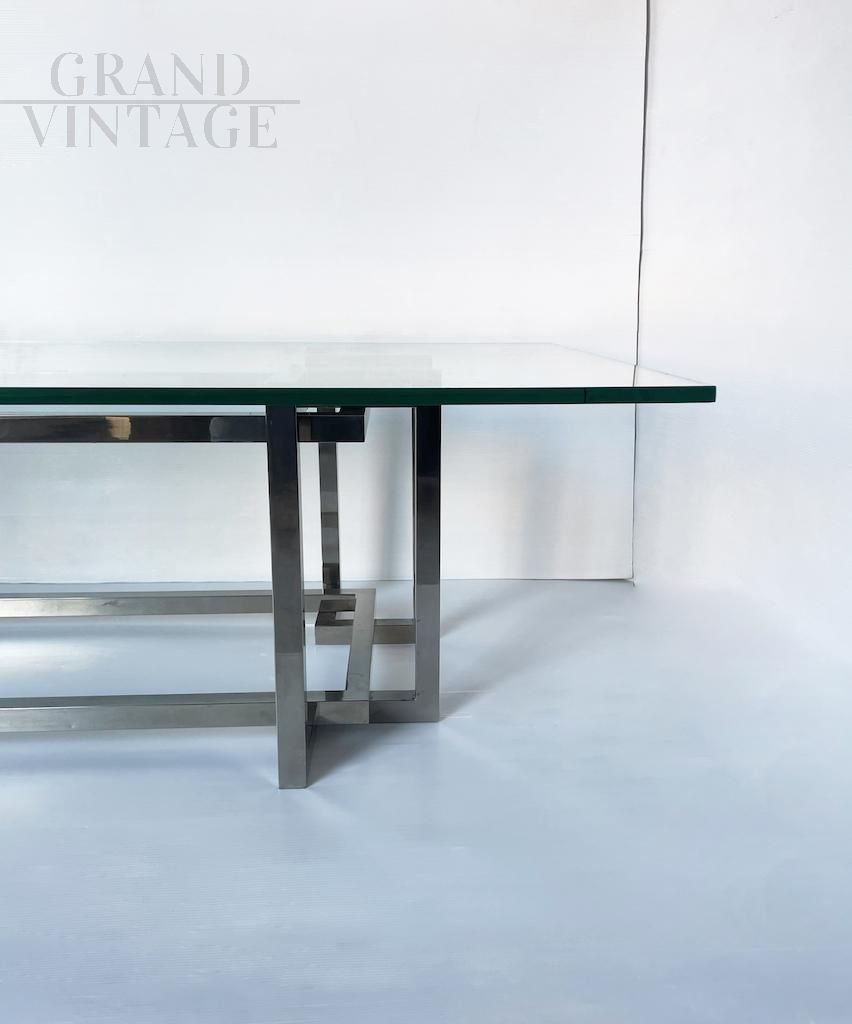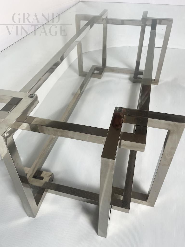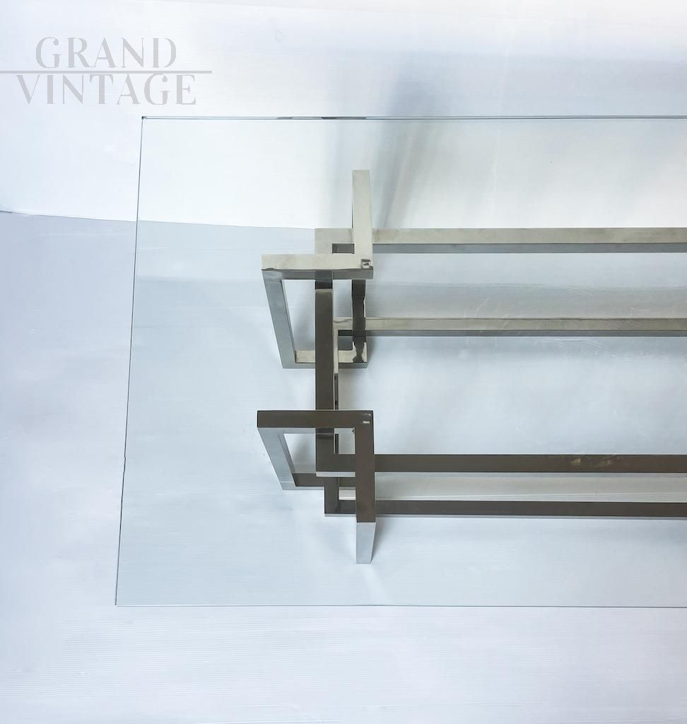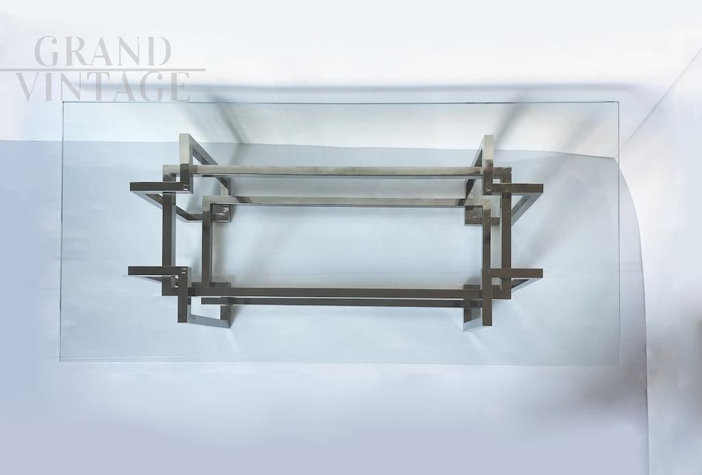 Elegante tavolino design di Romeo Rega con piano interamente in vetro e struttura in acciaio lucido caratterizzato da particolari intrecci geometrici, Italia anni '70.