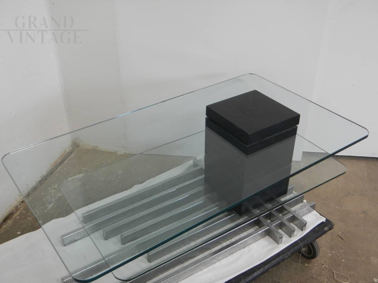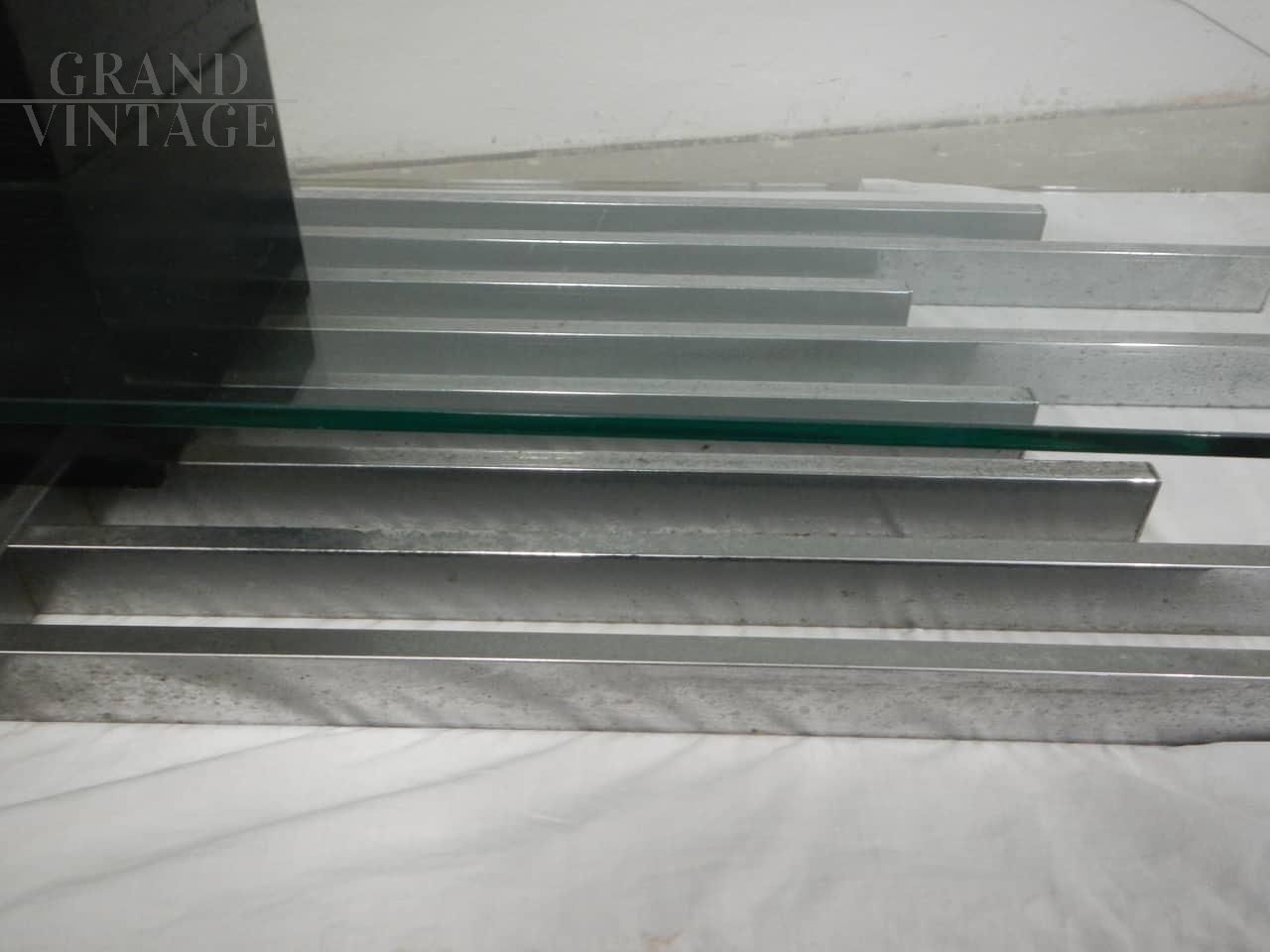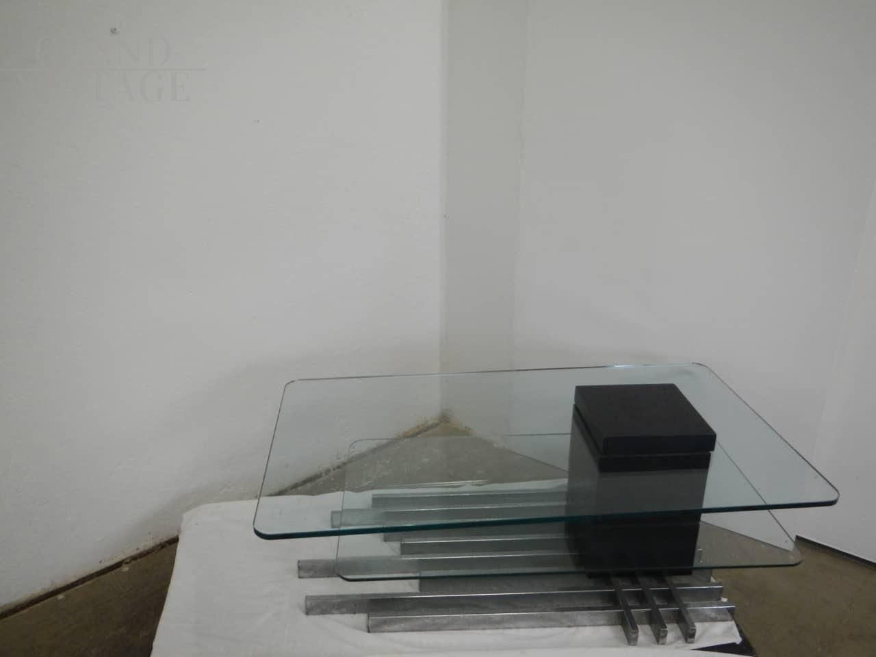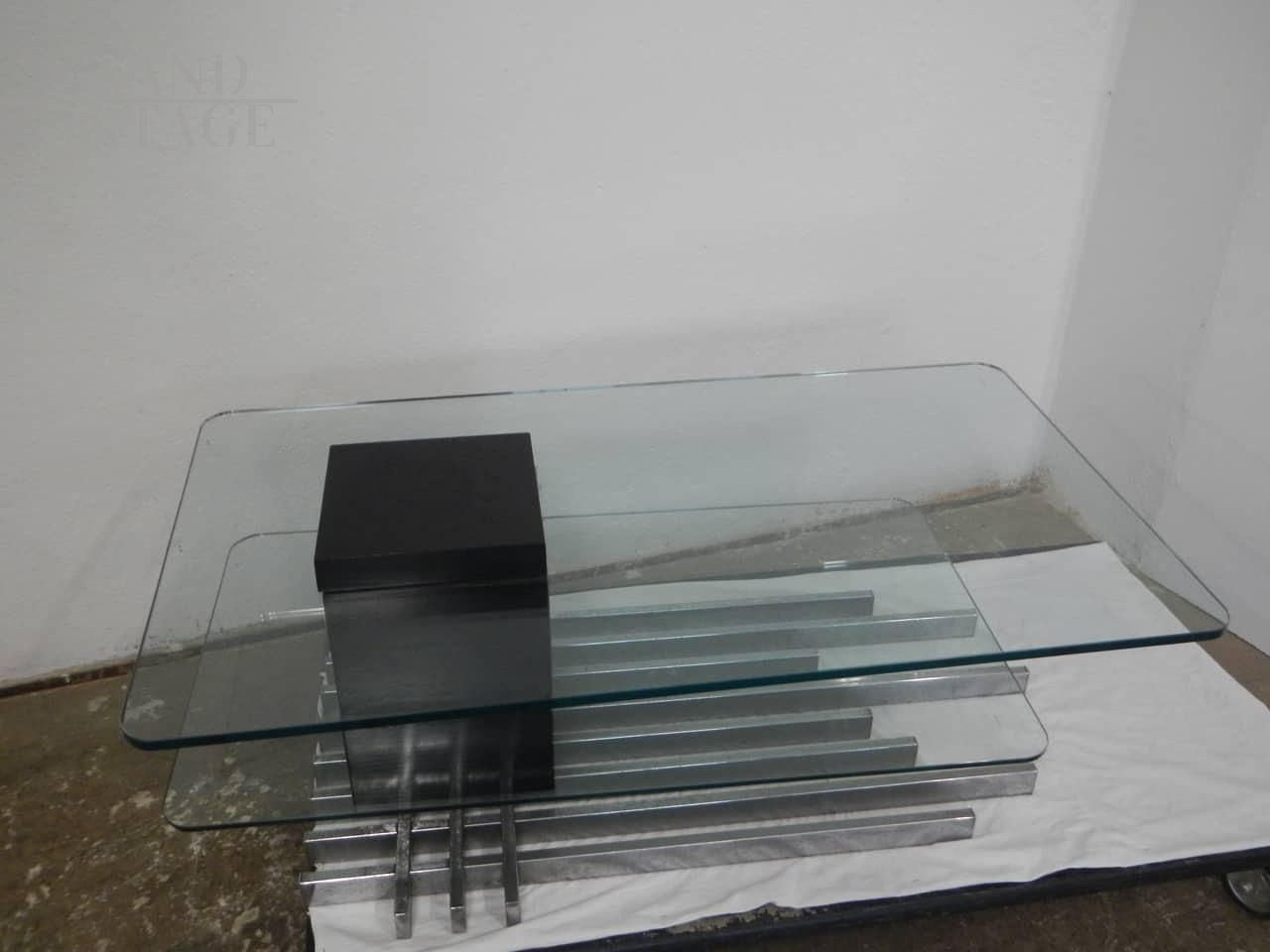 Tavolino in stile Dassi con base geometrica in metallo cromato e doppio piano in vetro temperato. La distanza tra i ripiani è di 16 cm. Il piano inferiore ha una lunghezza di 92 cm. Il vetro in alcuni punti presena i segni del tempo e dell'uso.