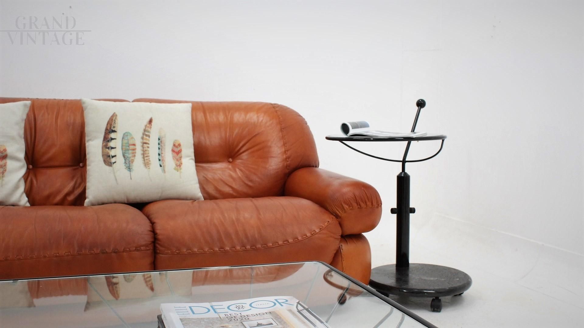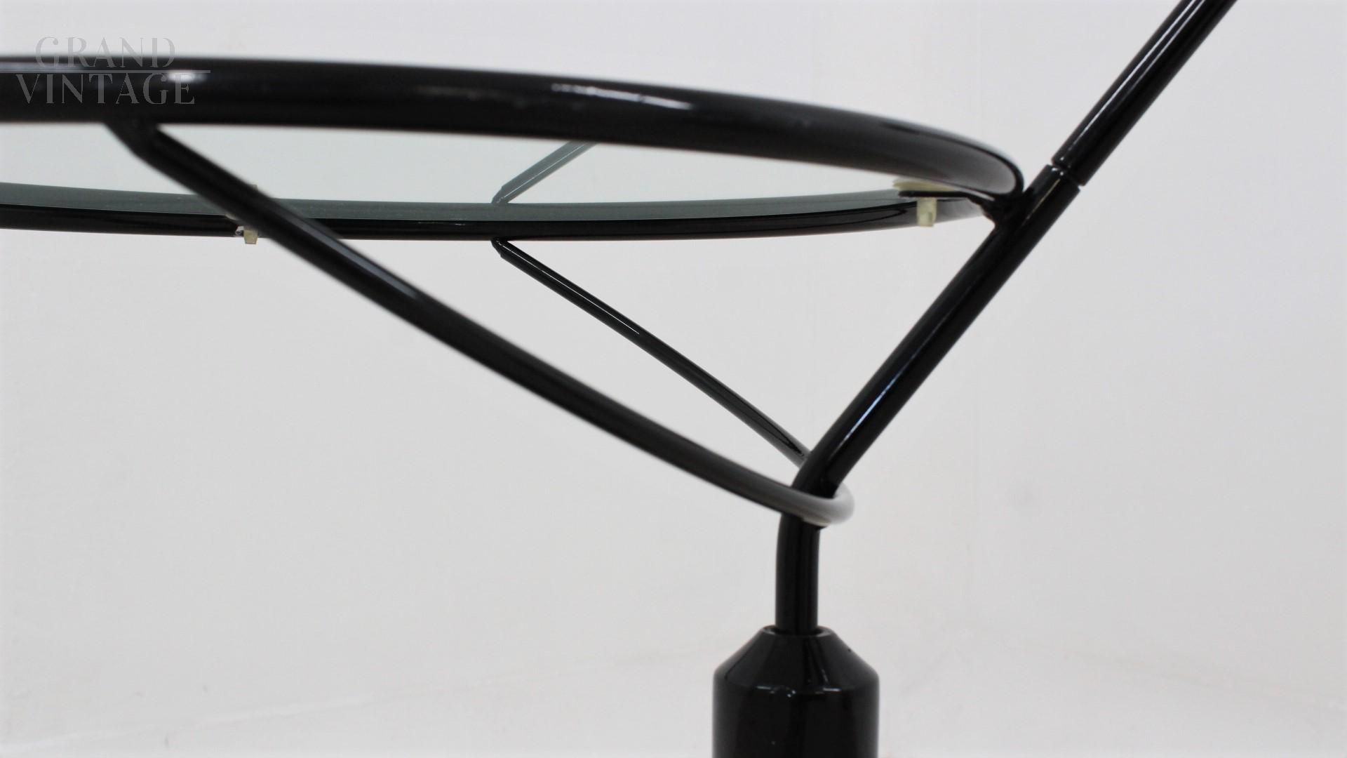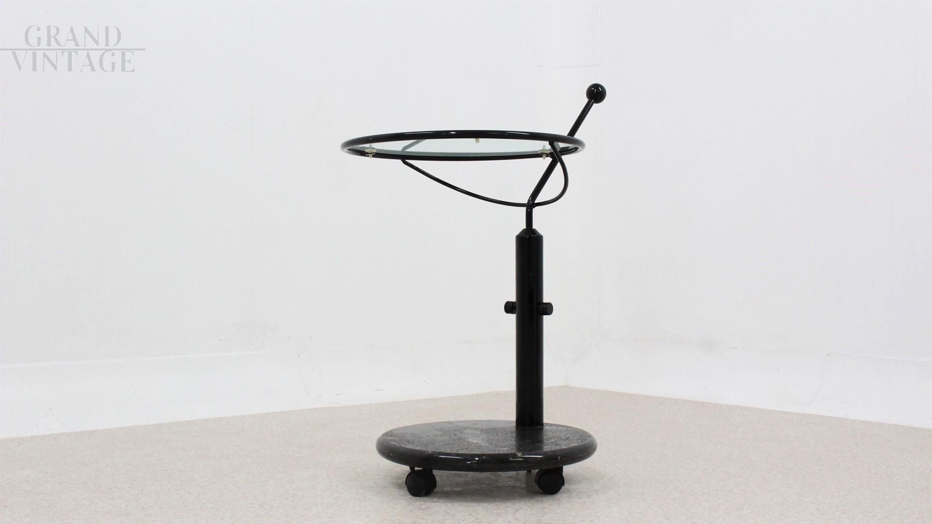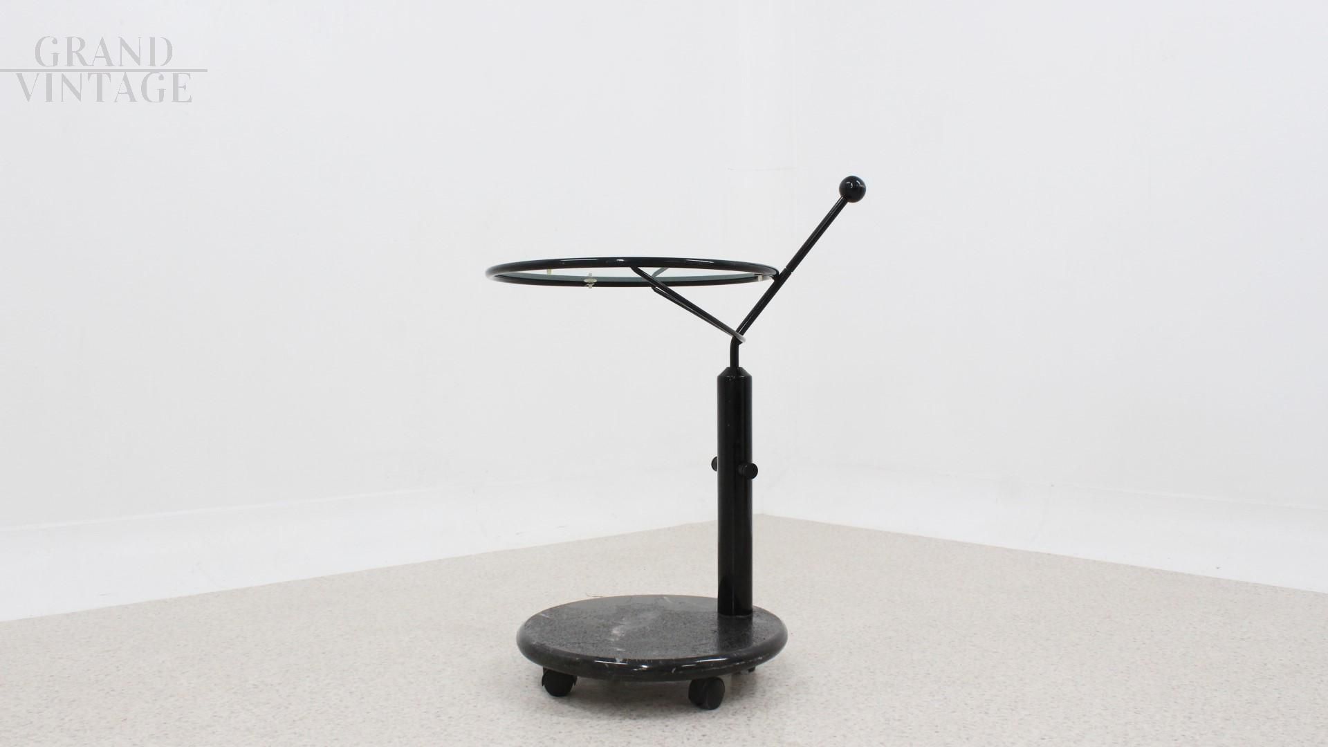 Design elegante e pop per questo carrello tavolino rotondo girevole e regolabile in altezza, modello Colleoni disegnato da Tarcisio Colzani per Porada, Italia anni '80. La struttura è in metallo laccato con base in marmo e piano in vetro. Il tavolino ha altezza regolabile e ripiano superiore girevole. In ottime condizioni vintage, coerenti con l'uso e l'età. Il tavolo è pronto per arredare la vostra casa-living, studio o Galleria!