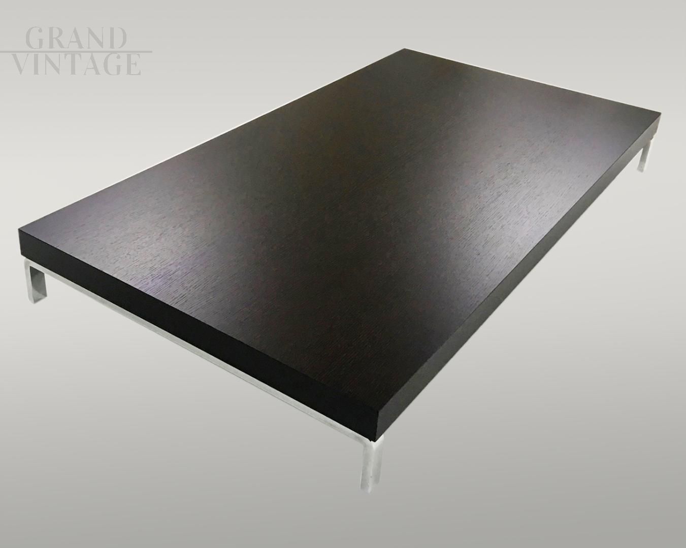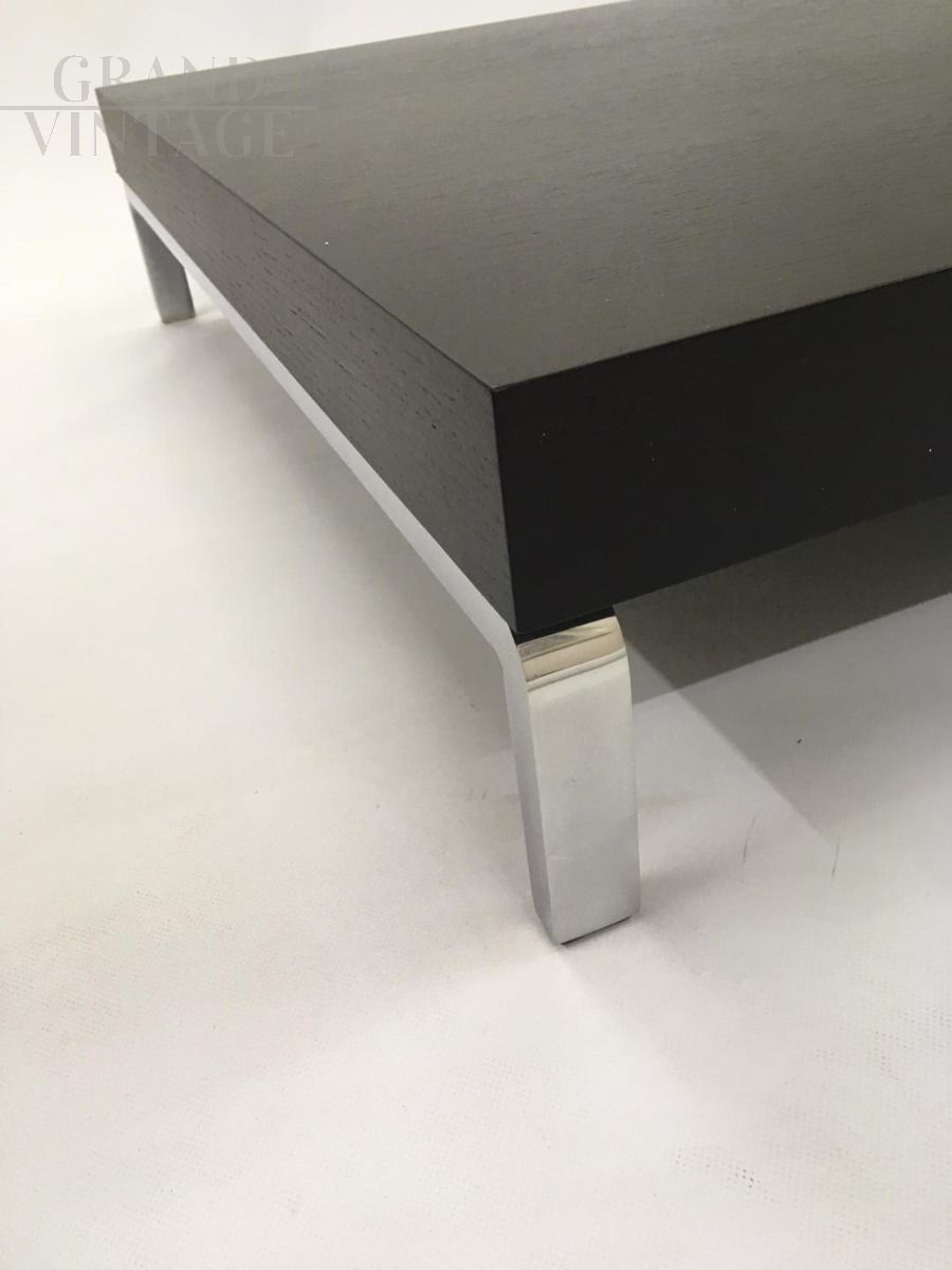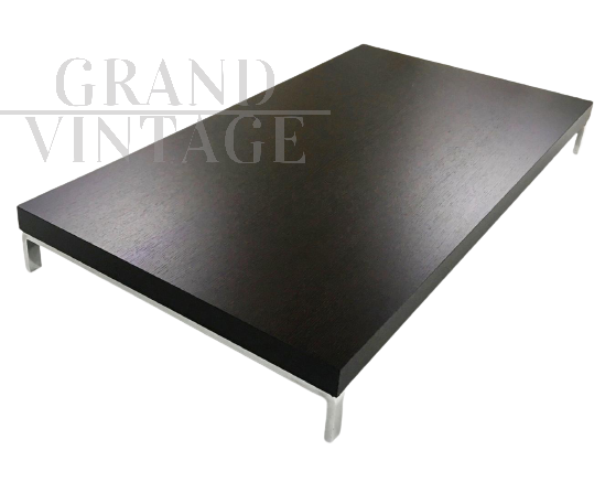 Questo tavolino è caratterizzato da piedini in lega di alluminio lucidato e piano in legno tamburato impiallicciato in tranciato precomposto, colore wengé.