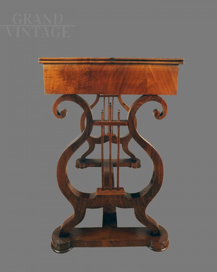 Tavolino epoca Impero, inizio del XIX SECOLO; interamente lastronato in noce, piuma di noce e radica di noce. Un cassetto con scomparti con eleganti gambe "a lira".