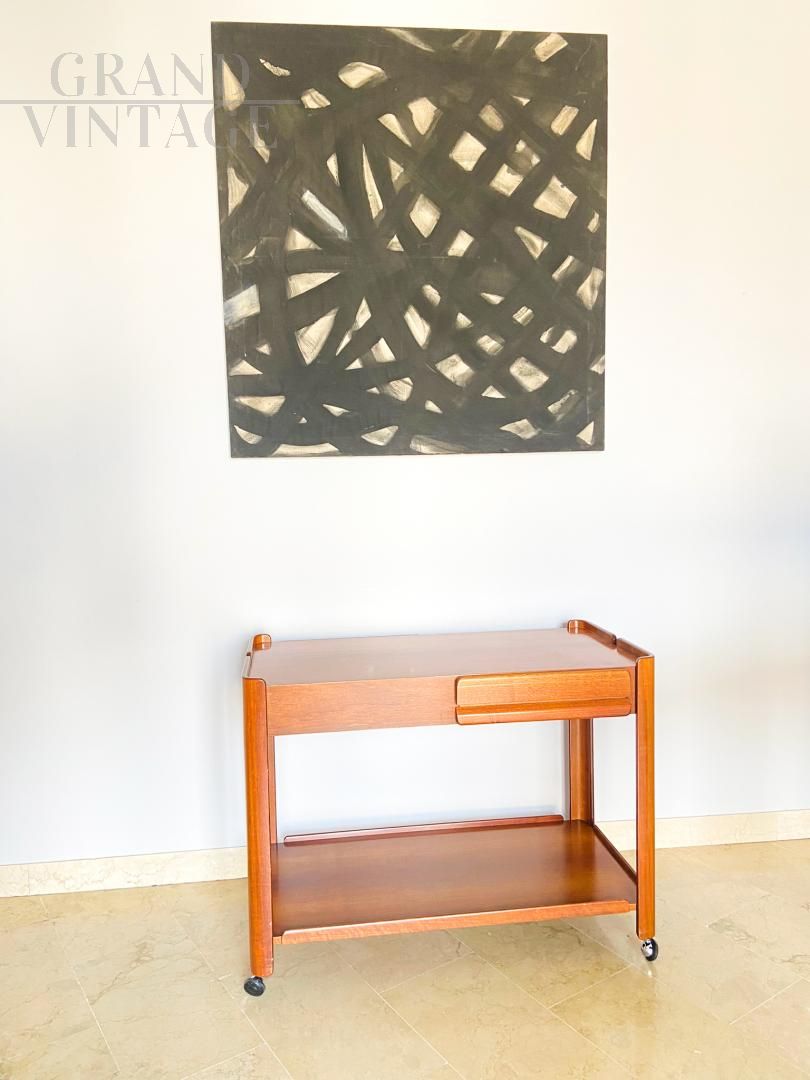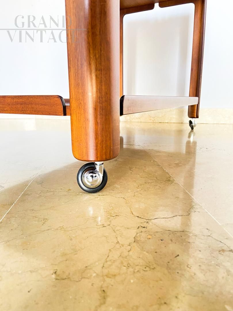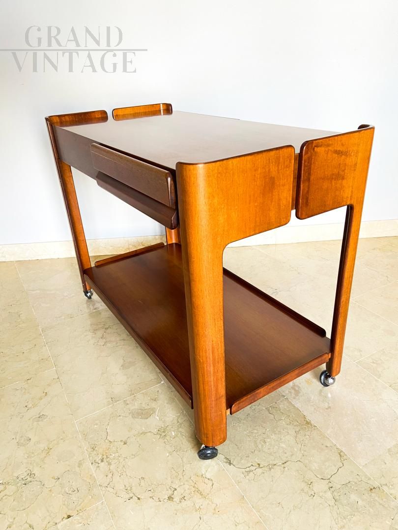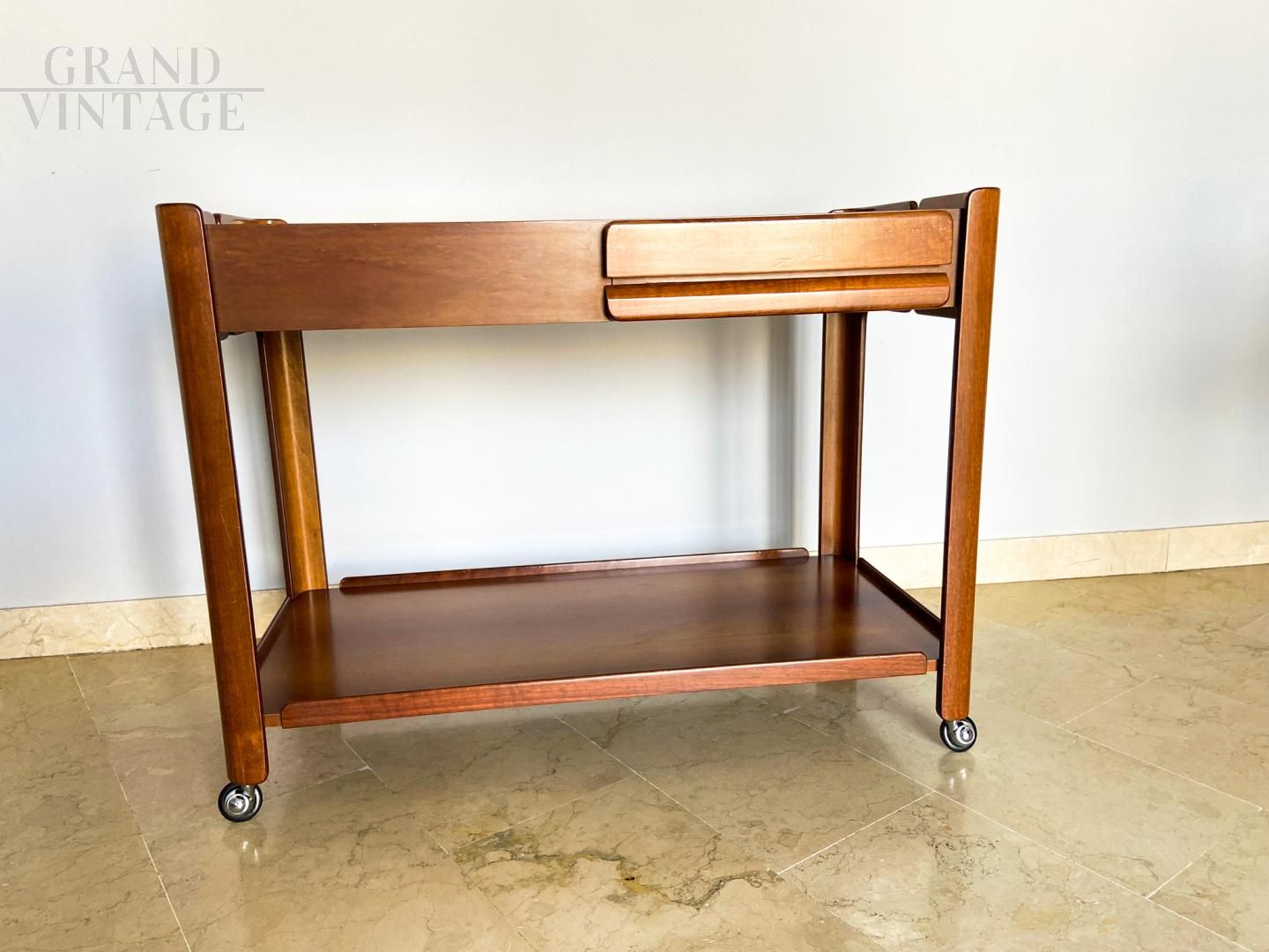 Tavolino carrello vintage in legno di noce con due cassetti, Italia anni '70. Il tavolino è in legno di noce piegato in 4 stratti di ottima fattura e di grande classe, con 4 ruote e un cassetto per lato, in ottimo stato di conservazione.