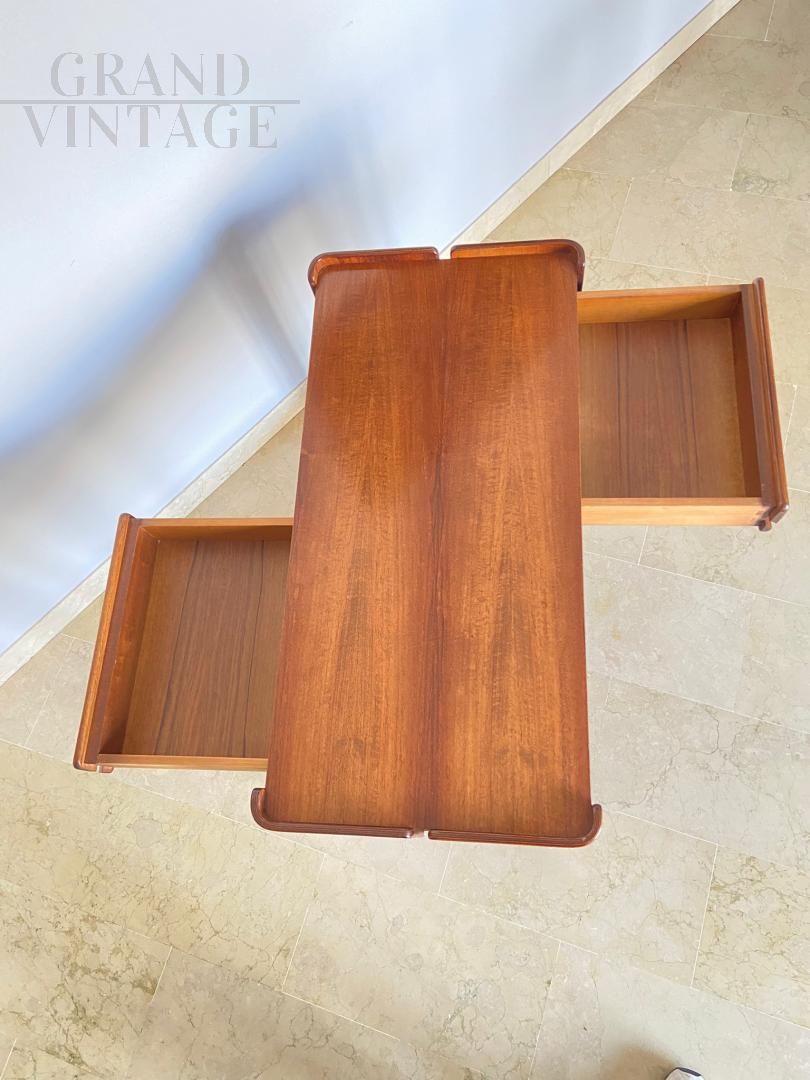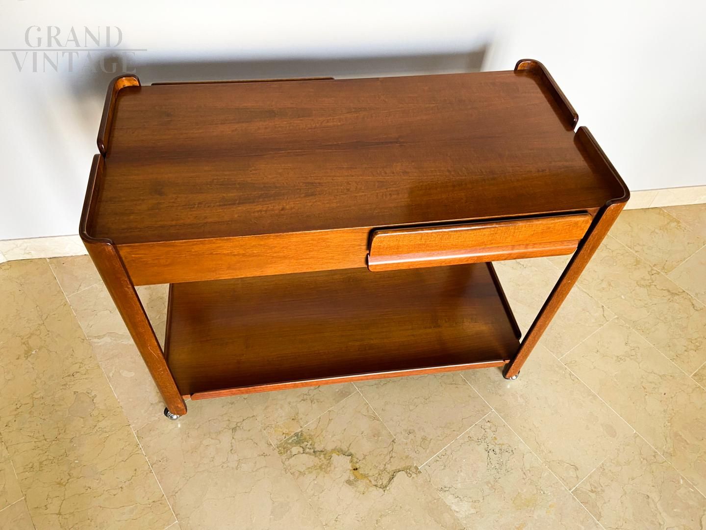 Tavolino carrello vintage in legno di noce con due cassetti, anni '70