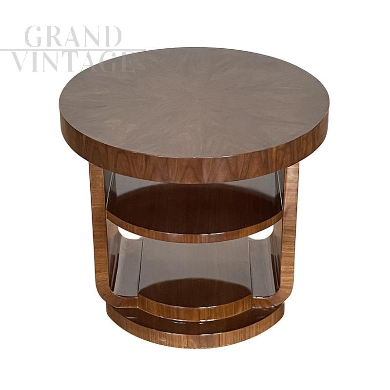 Tavolino rotondo in stile art déco in radica di noce con doppio piano.