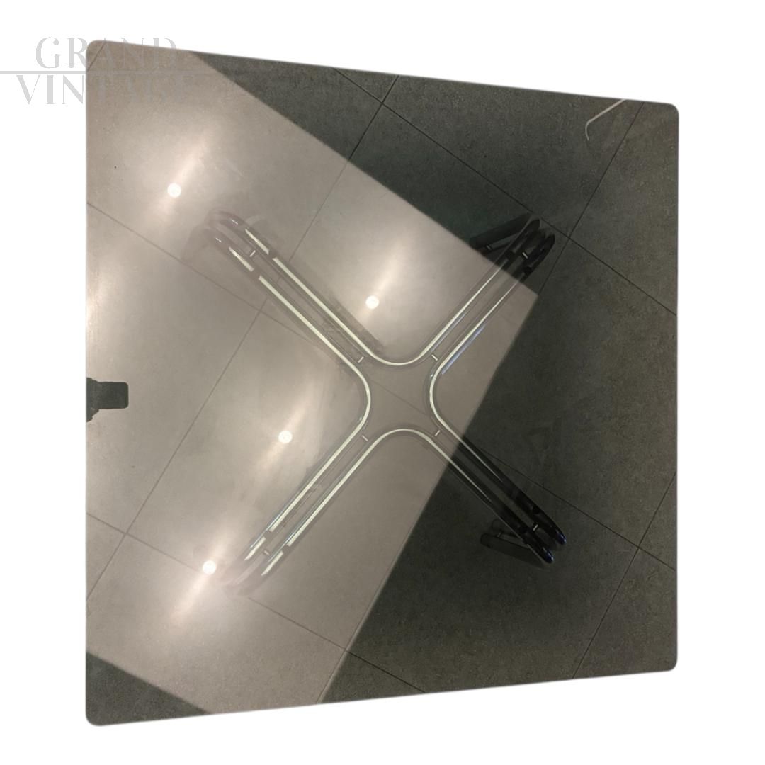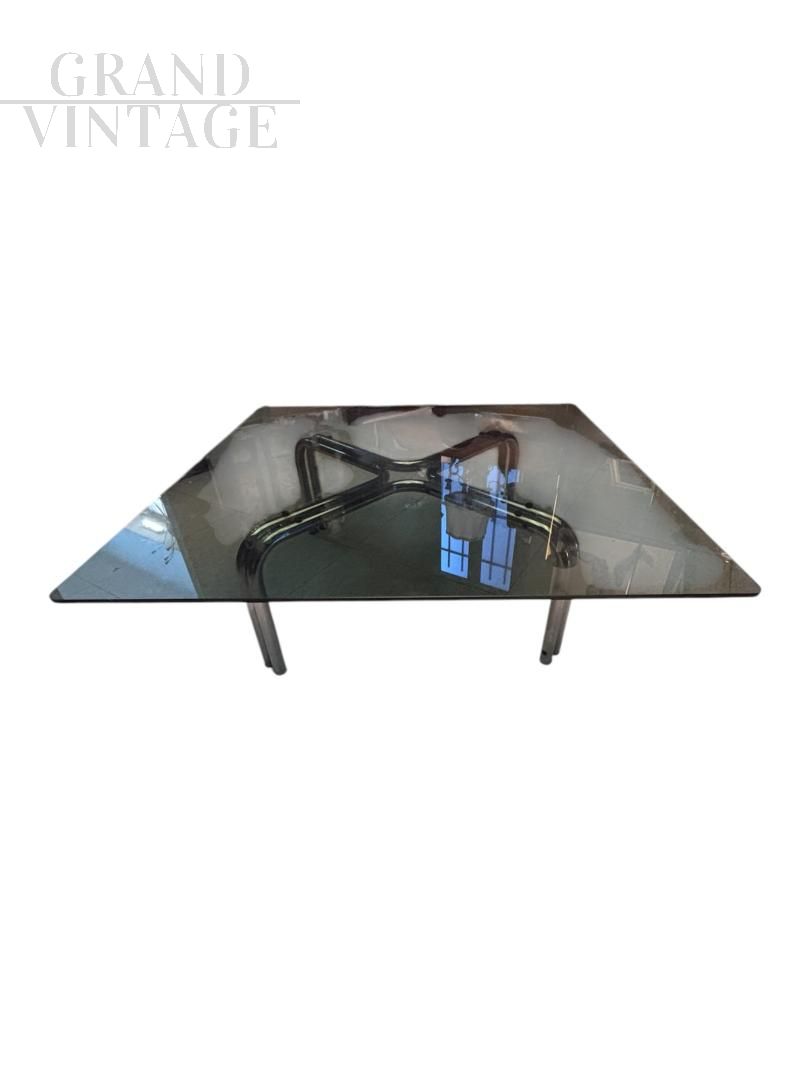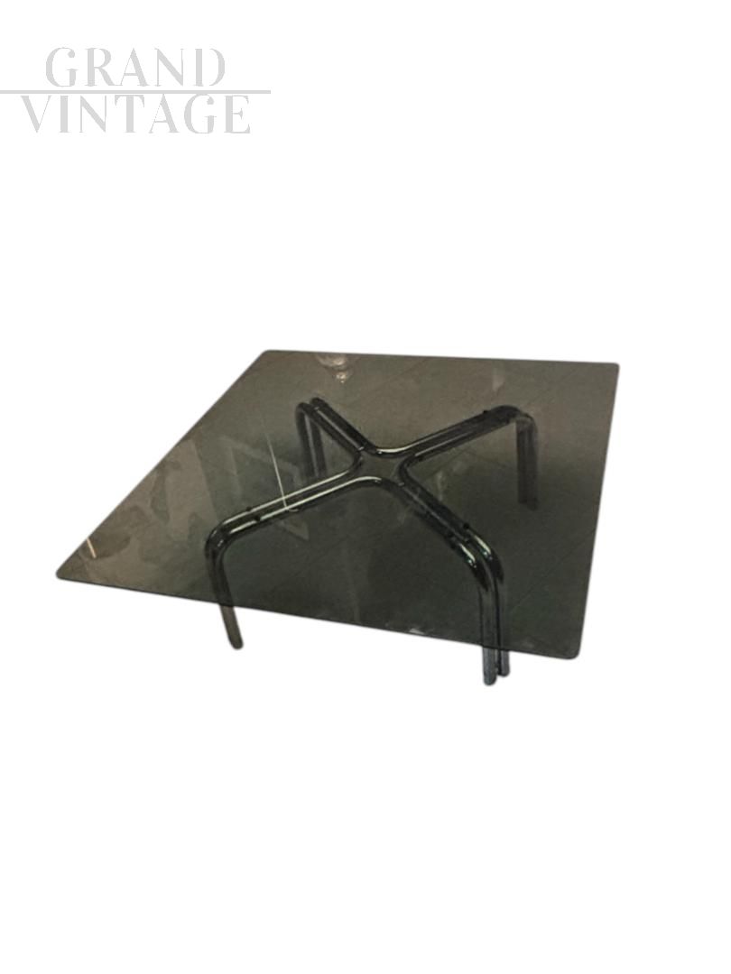 Tavolino in stile Gianfranco Frattini in acciaio e vetro, anni '70