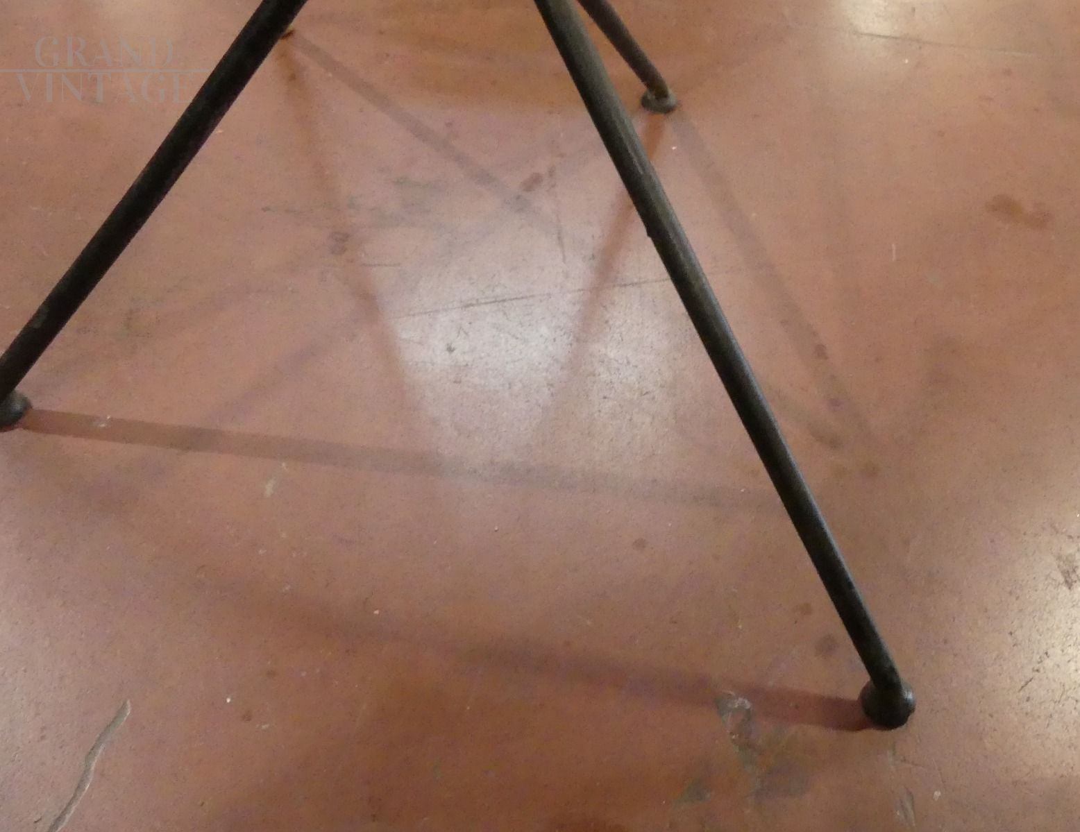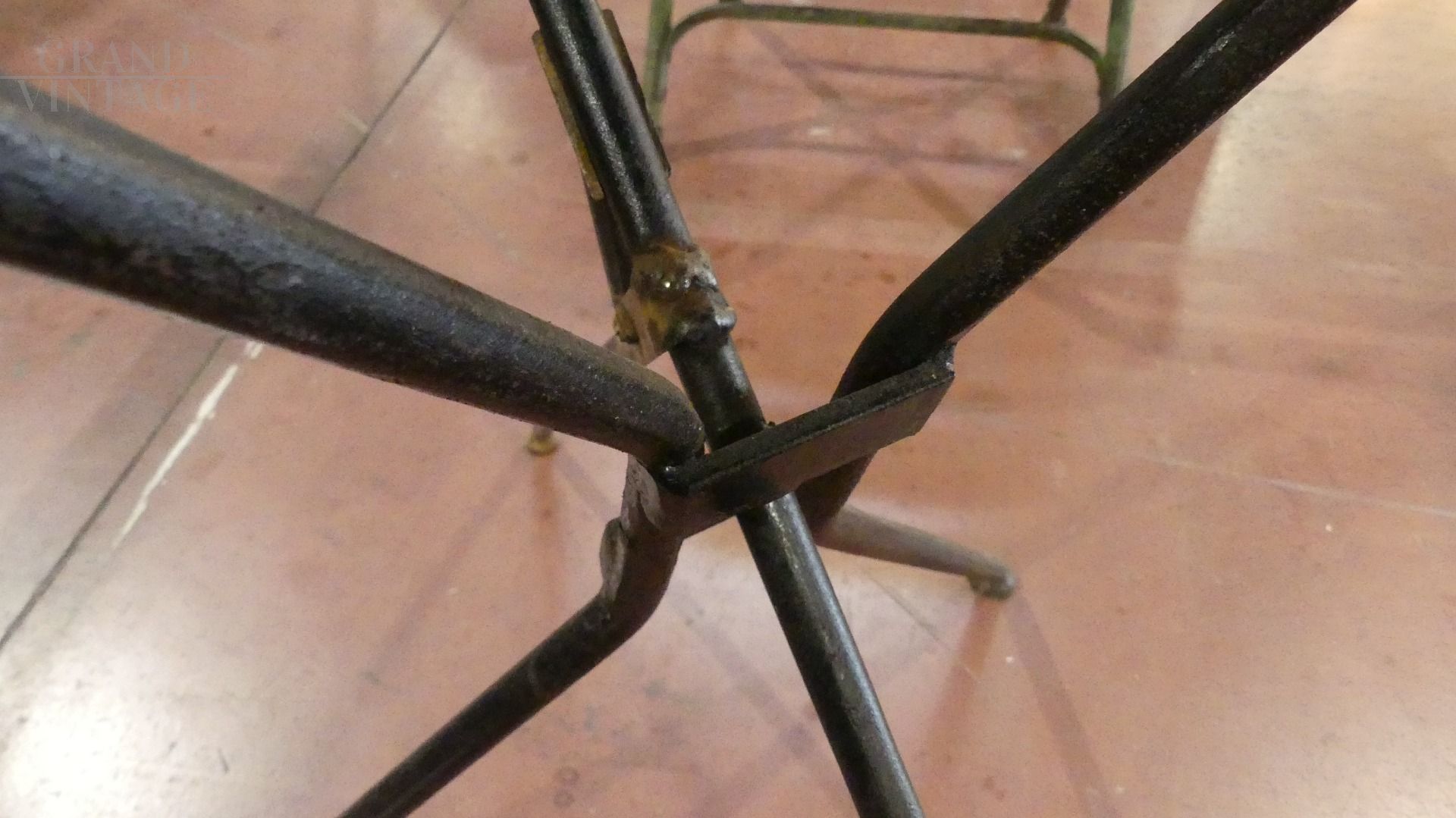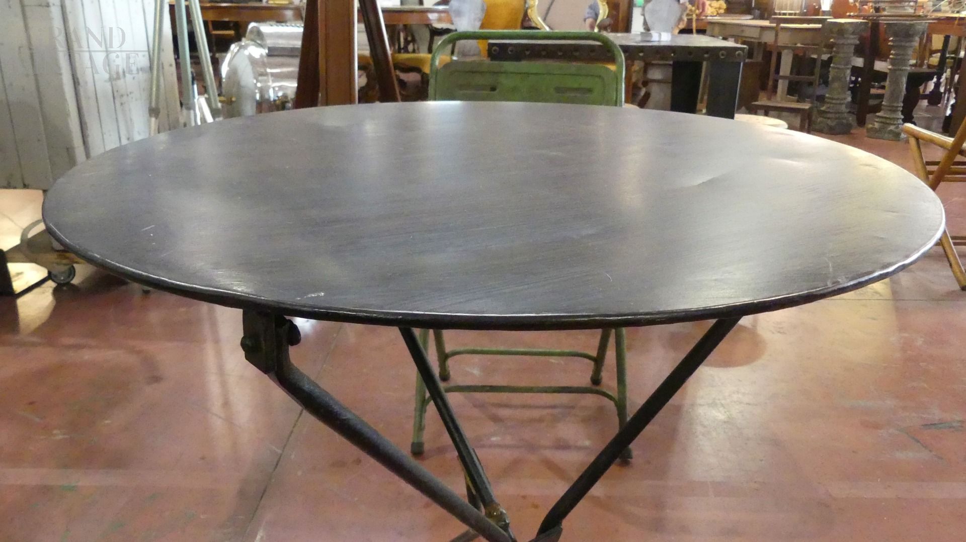 Tavolino richiudibile in ferro con piano rotondo, perfetto per arredare un giardino o un contesto industriale.