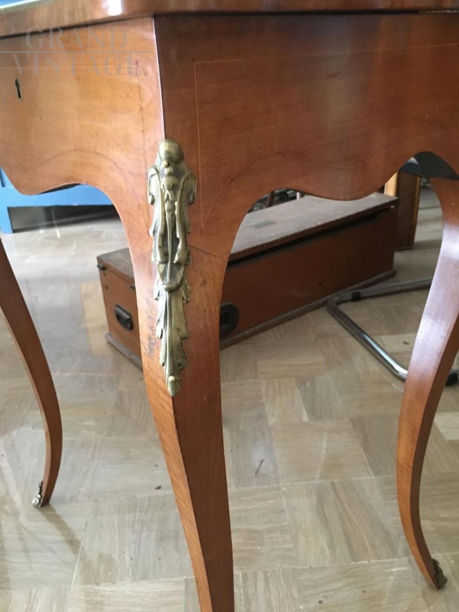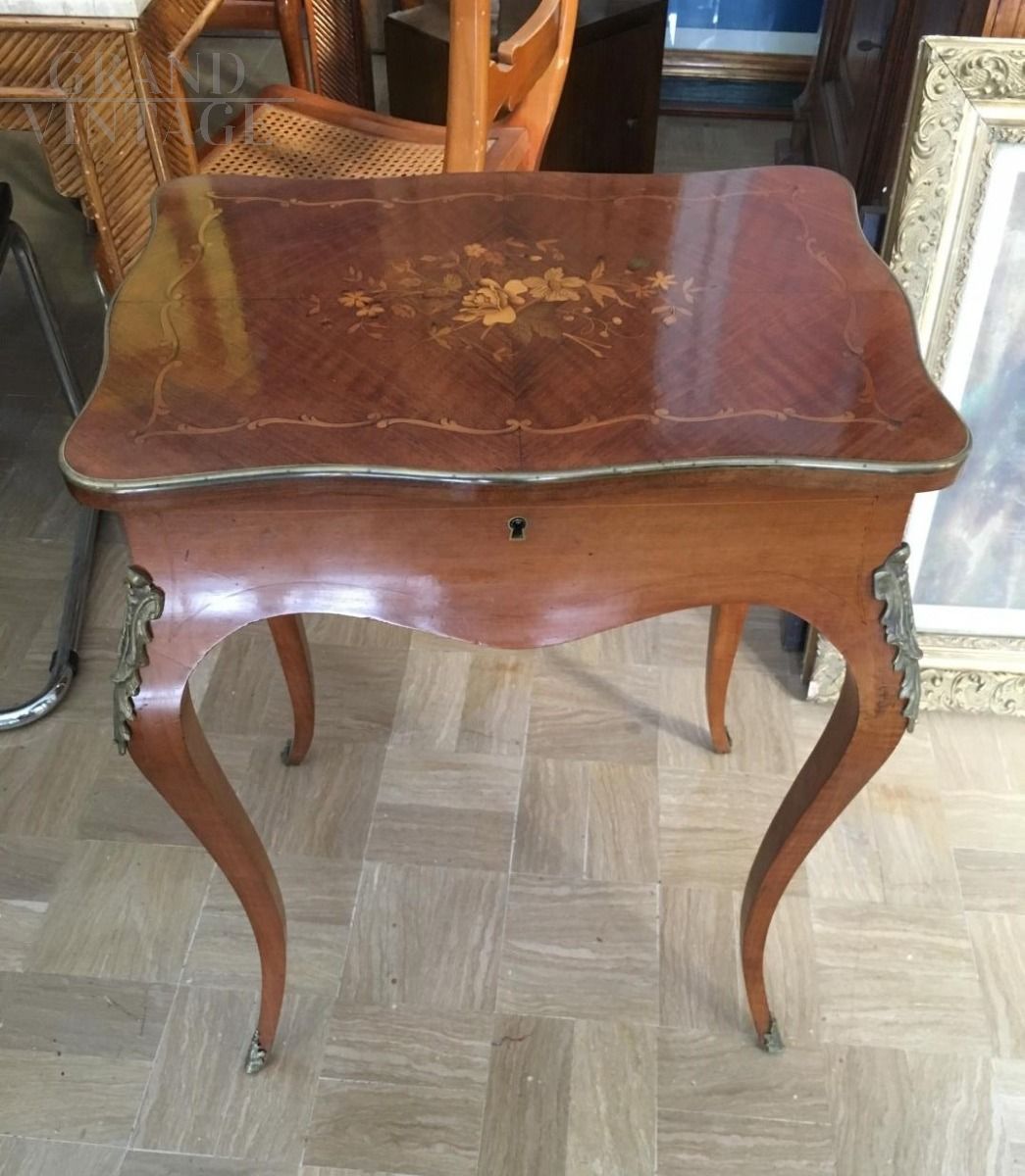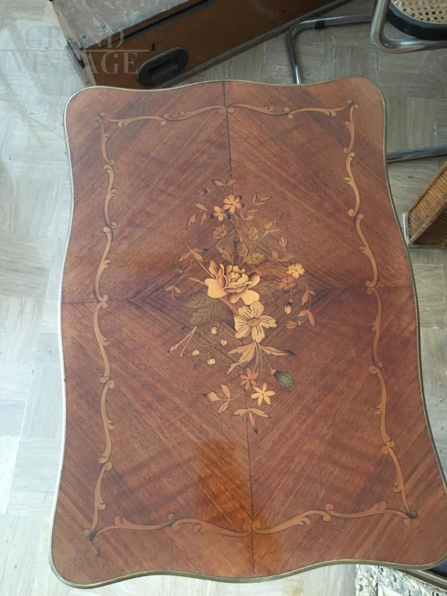 Tavolino intarsiato inmpiallacciato in noce, con piano finemente intarsiato. Manifattura francese, periodo fine '800.