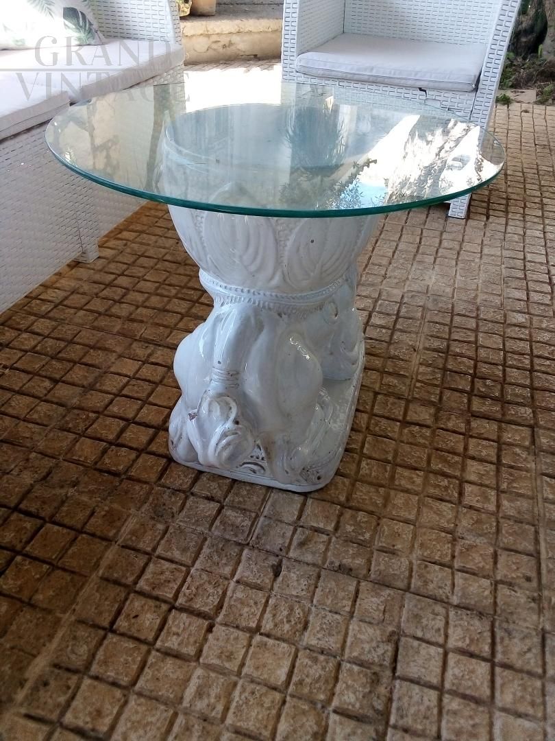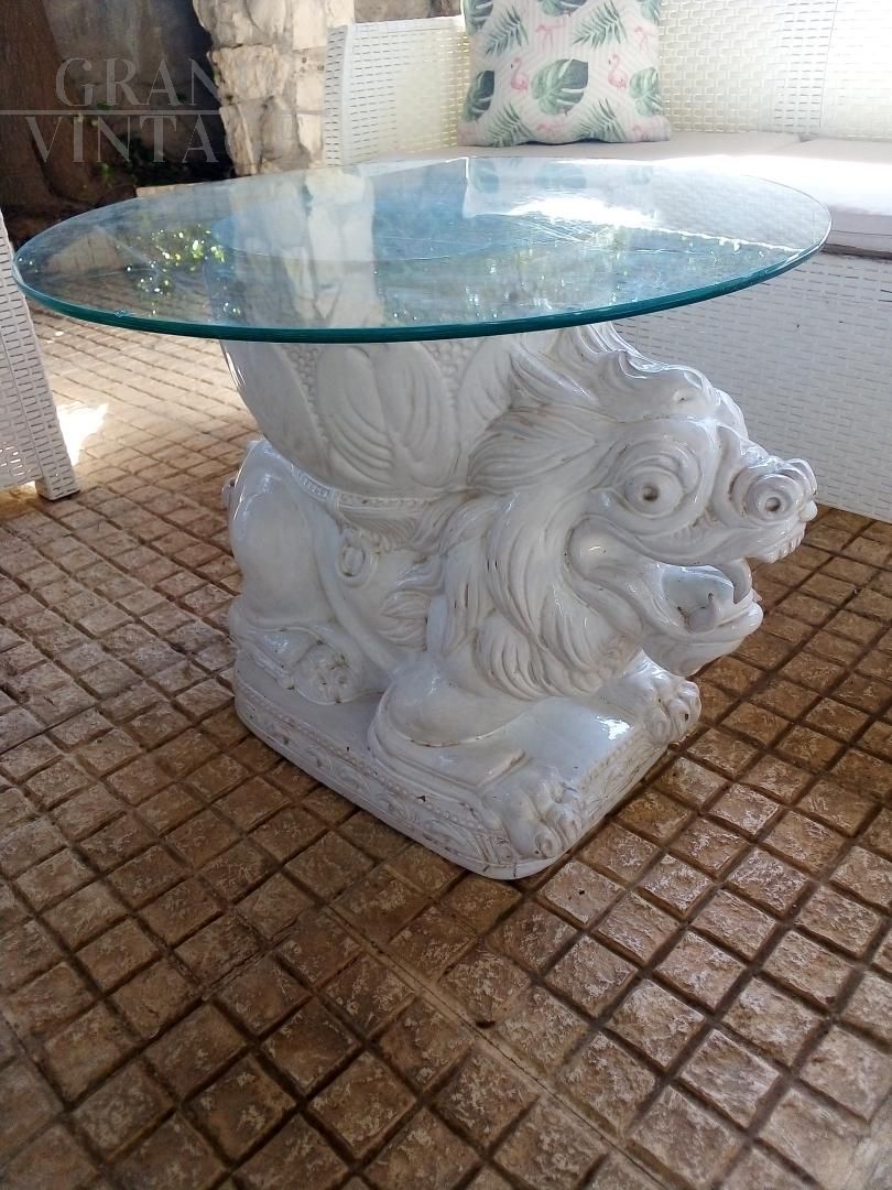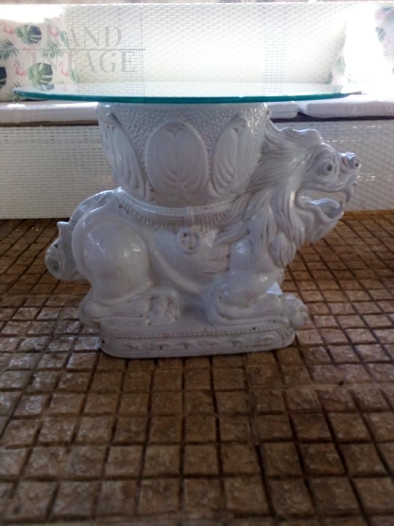 Tavolino vintage stile etnico con base di leone in ceramica bianca e piano in vetro