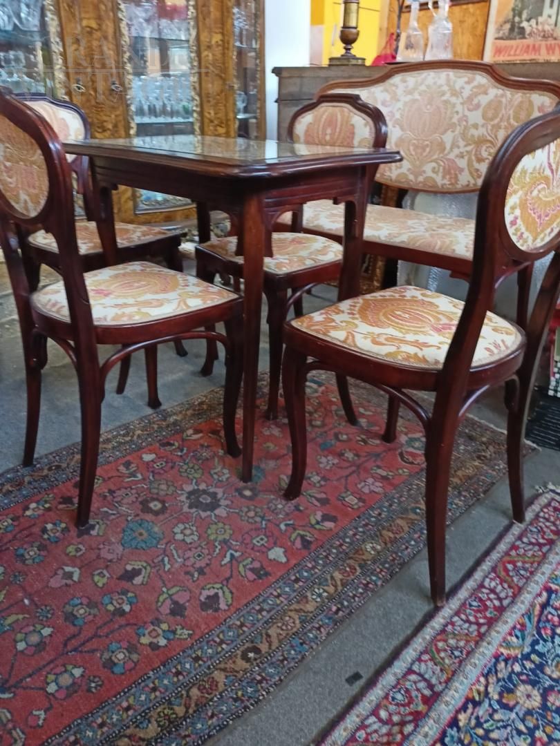 Tavolino Liberty Jugendstil, Vienna, produzione Jacob & Joseph Kohn in faggio curvato, originale e in perfetto stato, una vera rarità. Tavolino in perfette condizioni, tappezzeria, legno, stoffa, imbottitura. Misure tavolino: altezza 80 cm, piano 78 x 56 cm.