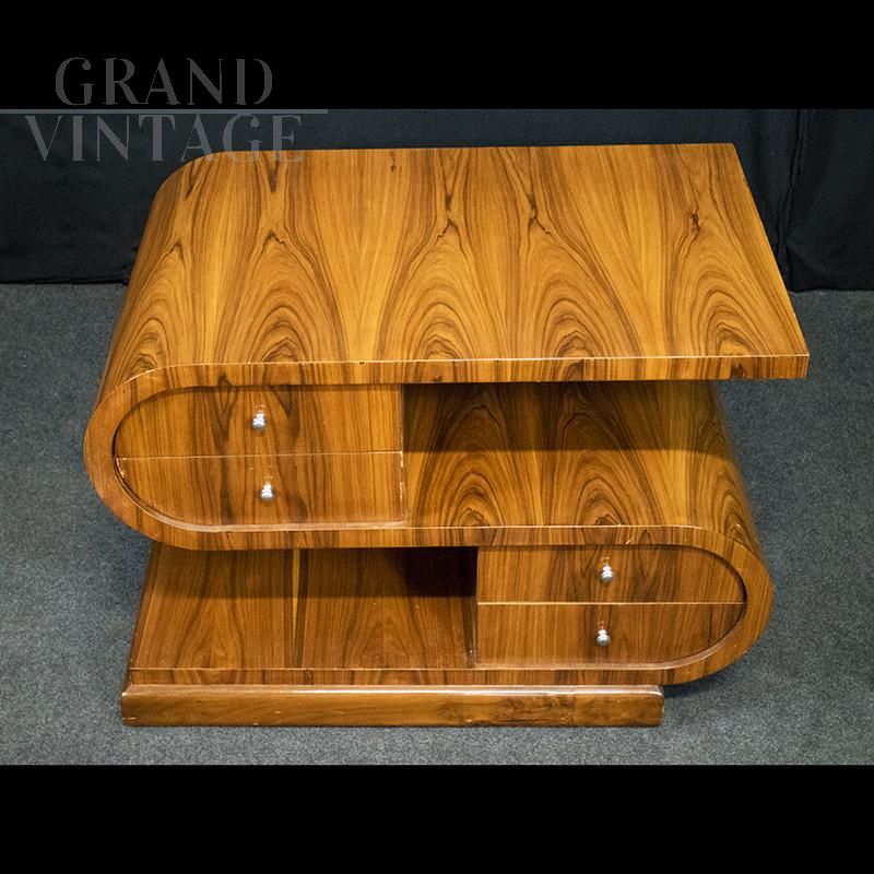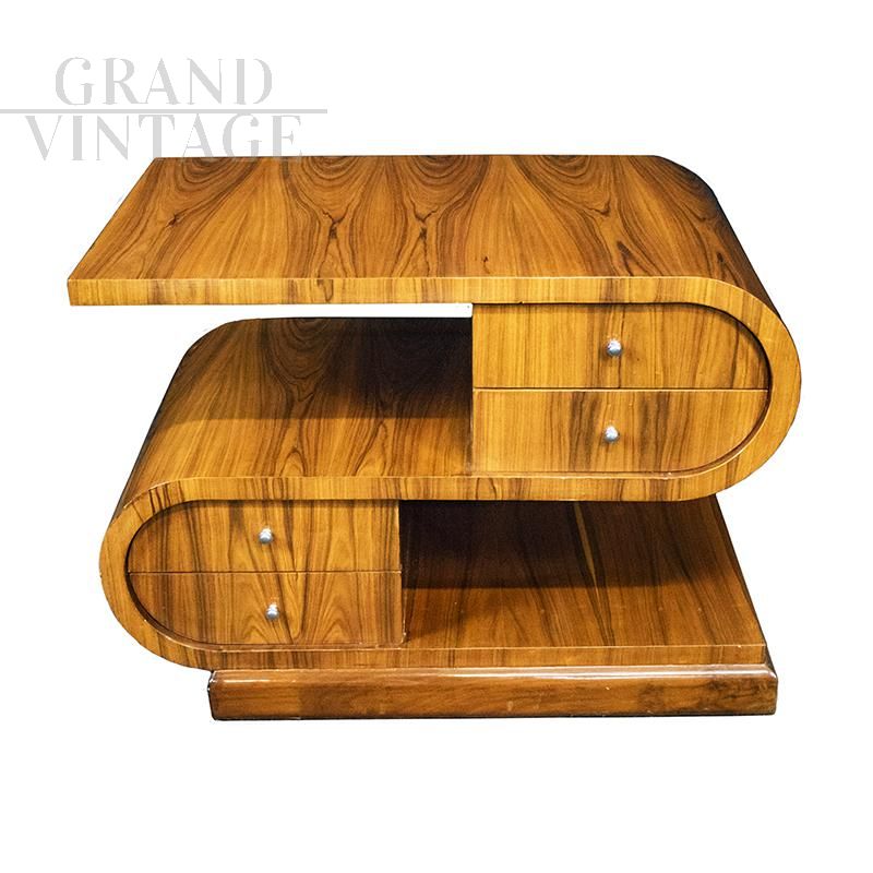 Tavolino, mobiletto o comodino bifacciale in stile Art Déco del XX secolo con una struttura di design in legno a forma di esse con 8 cassetti (4 cassetti per lato).