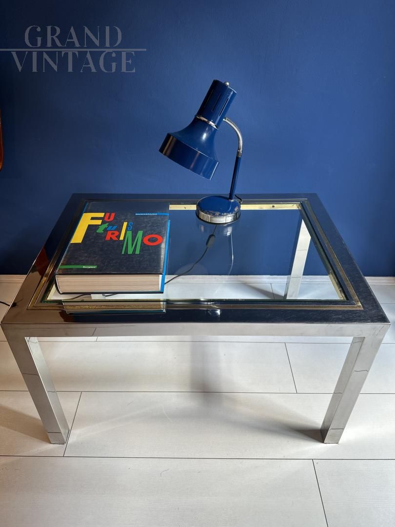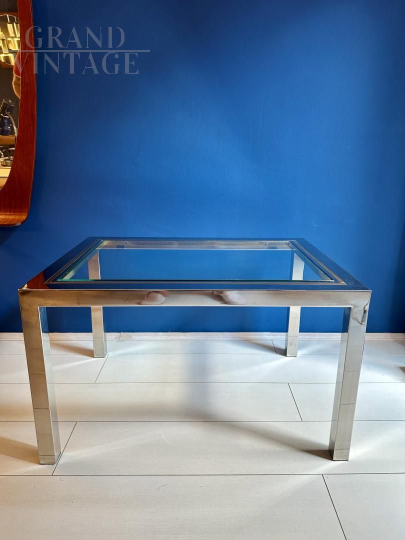 Tavolino vintage modernariato con struttura cromata con inserti in metallo dorato e piano in vetro incastrato nella cornice, Italia anni '70, attribuito allo stile di Romeo Rega. Il vetro è originale quindi presenta qualche naturale segno ma nessuna rottura.
