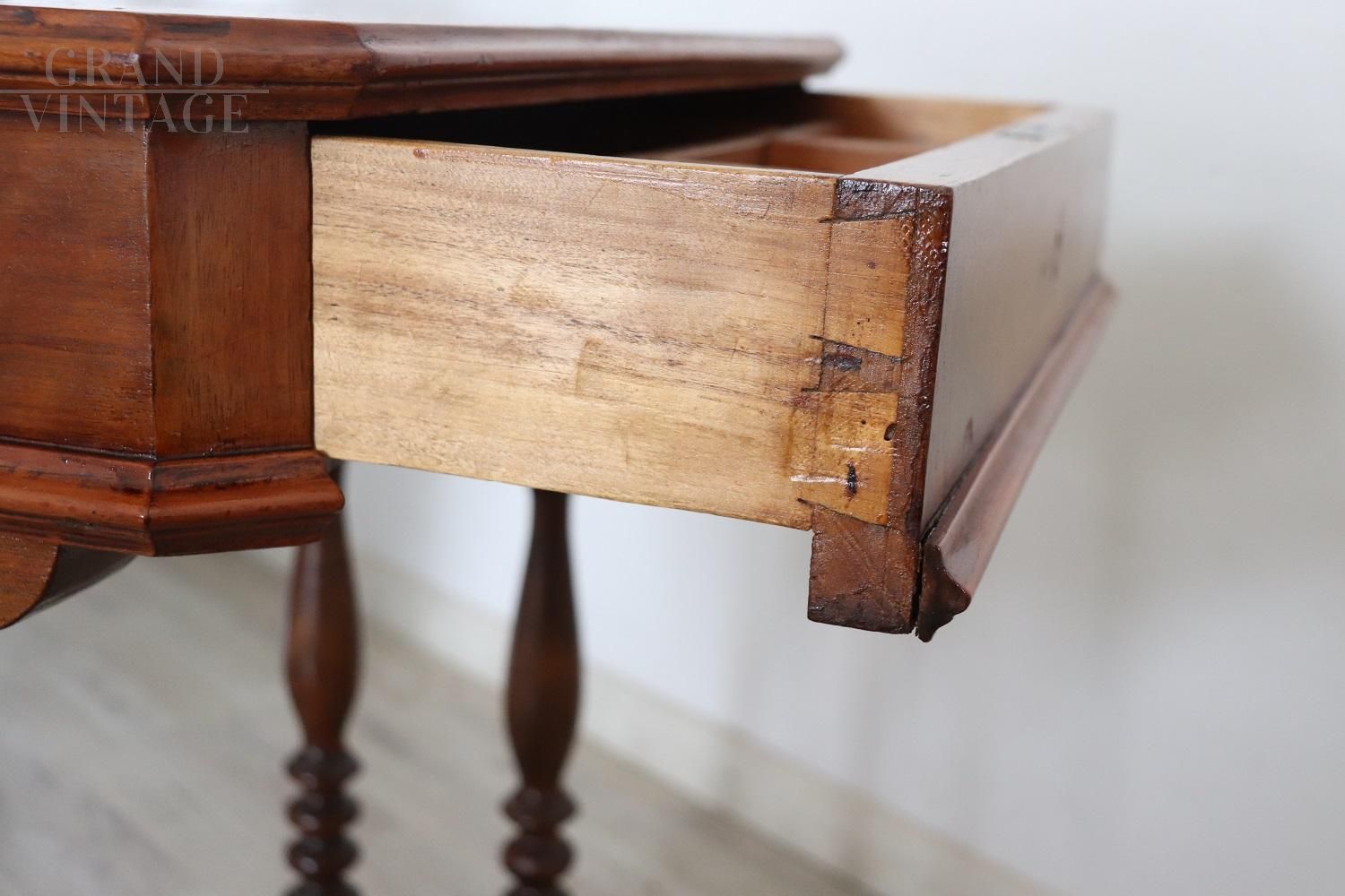 Elegante tavolino antico di epoca Luigi Filippo della metà del XIX secolo realizzato in legno di noce con raffinata tornitura nelle gambe. Sul fronte, un pratico cassetto dotato internamente di divisori che creano piccoli vani porta oggetti. Questo tavolino di piccole dimensioni ma molto elegante è perfetto per ogni ambiente della casa: salotto, ingresso o camera da letto. Ottime condizioni, possibili piccoli segni di usura a livello di finitura. Ottimo prezzo trattabile.