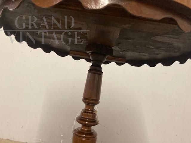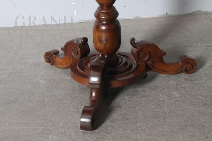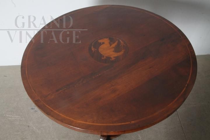 Tavolino rotondo antico di epoca Carlo X in noce intarsiato, Umbria 1840