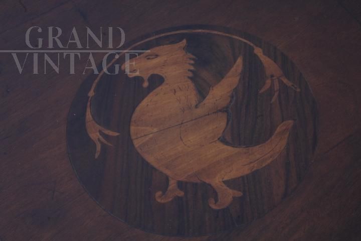 Antico e splendido tavolino antico rotondo in noce massello con drago intarsiato, di epoca Carlo X, Umbria 1840 circa. Di una raffinatezza importate, con piano in assi di noce intarsiato al centro con dragoncello e filettato sul bordo. Gamba centrale finemente tornita con terminale a tripode intagliati sul massello. Restaurato mantenendo la patina. Un oggetto raro da reperire!
