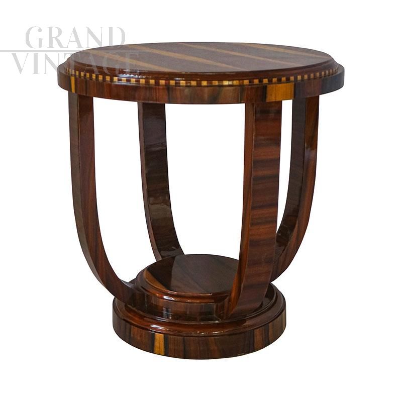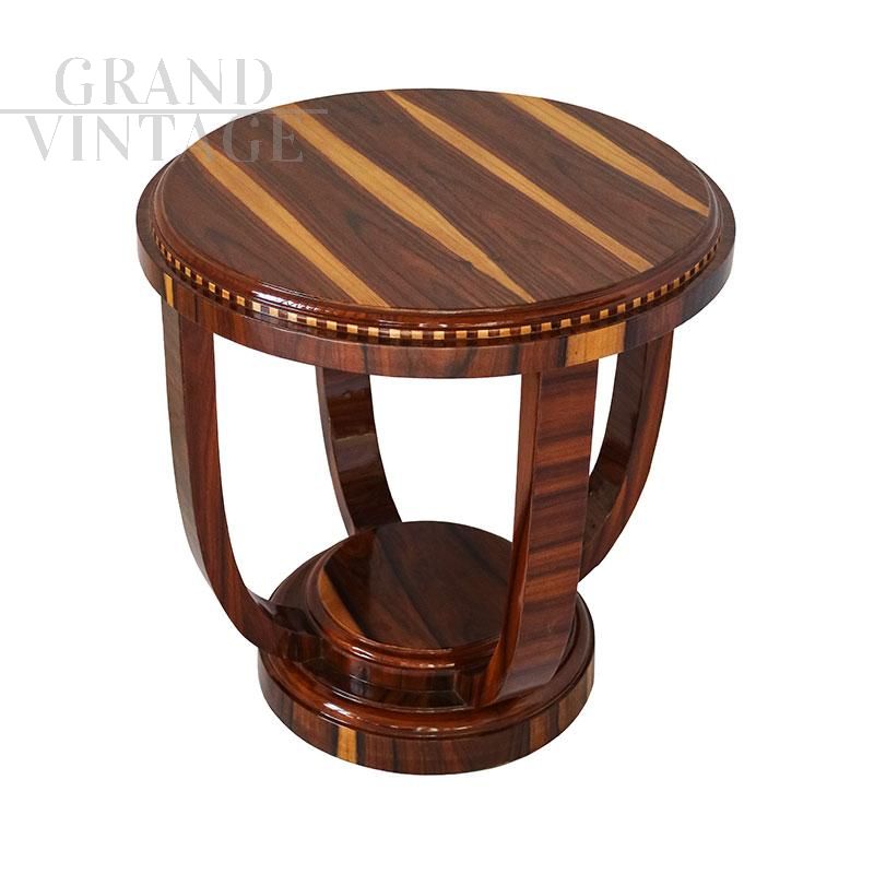 Tavolino basso rotondoin stile Art Déco impiallacciato in noce con bordo filettato in vari legni pregiati, basamento a gradini dove sono collegate quattro gambe curve. Venatura sulla base.