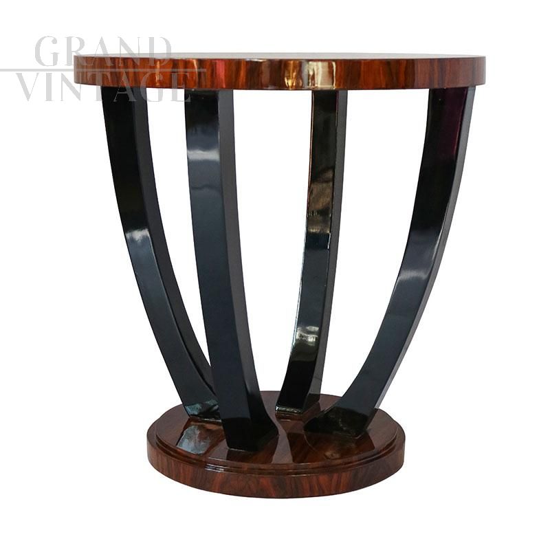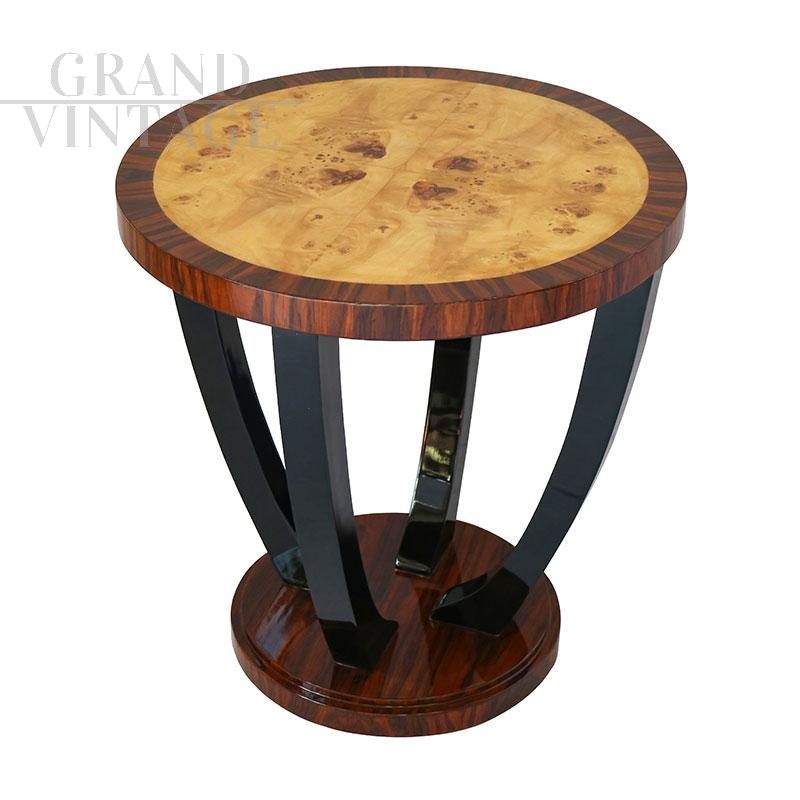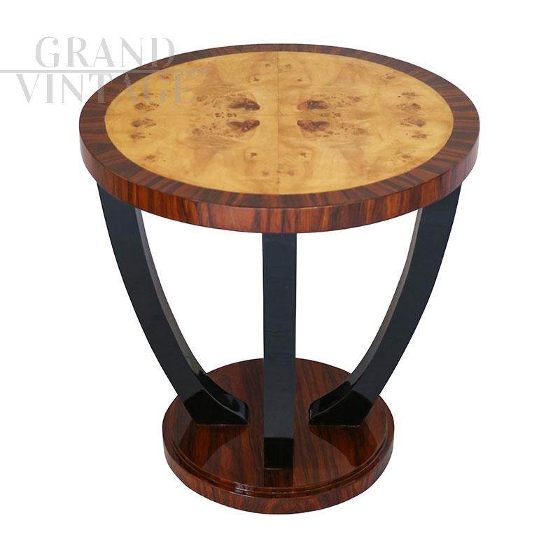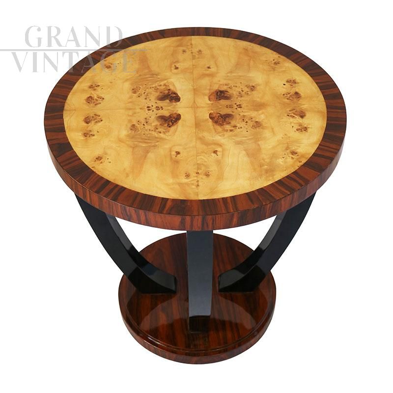 Tavolino rotondo in stile Art Déco in radica di betulla e noce