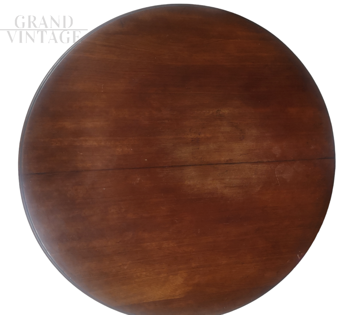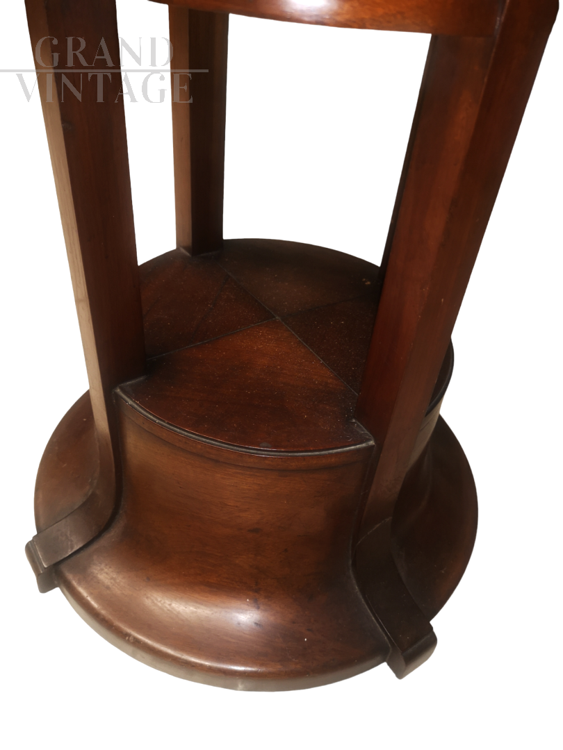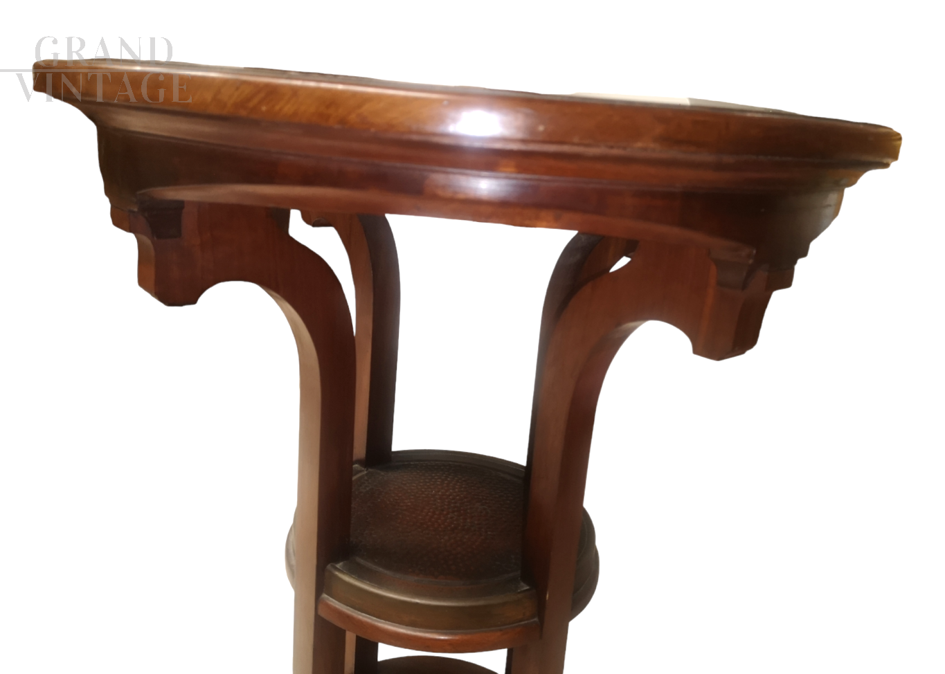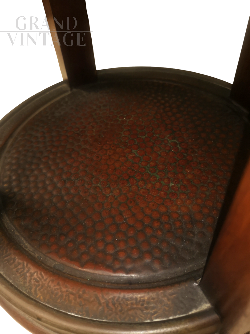 Bellissimo tavolino rotondo da appoggio Jugendstil austriaco anni '20 - '30, realizzato in legno di noce massello con due piani, dei quali il piano inferiore è completamente ricoperto di una lastra di rame martellato. Le 4 gambe stilizzate terminano verso l'alto con bei i riccioli. Elegante e con un grande fascino.