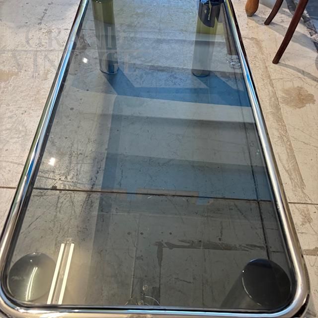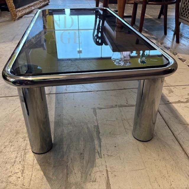 Tavolino Sesann di Gianfranco Frattini in metallo cromato e vetro fumé