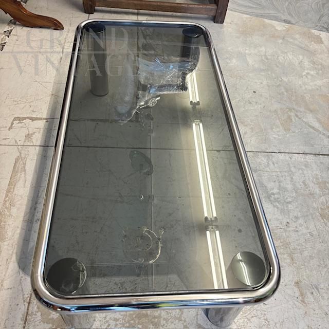 Tavolino da salotto Sesann attribuibile a Gianfranco Frattini per Cassina in metallo cromato con piano in vetro fumé, Italia anni '70.