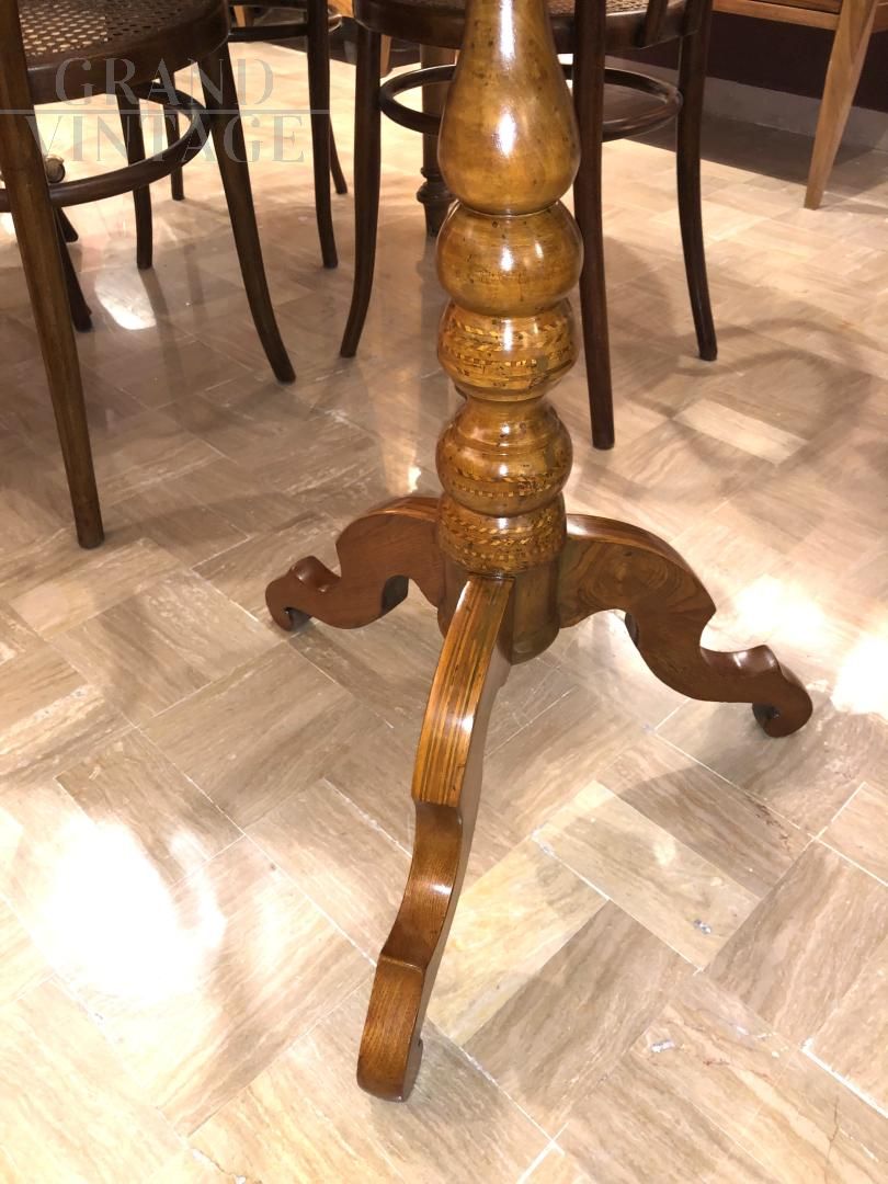 Elegante tavolino sorrentino lastronato in noce ed intarsiato riccamente con legni di varie essenze, figura centrale finemente incisa. In ottime condizioni, restaurato.