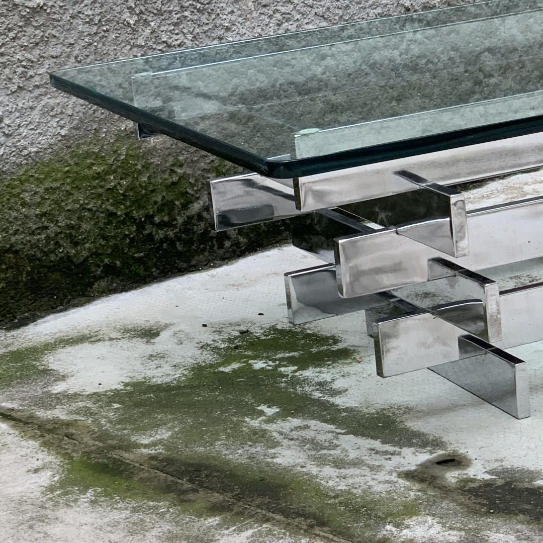 Un insolito e raro tavolino da caffè di David Hicks, Mod. "Tavolo Scultura". Struttura caratterizzata da pezzi metallici impilati e cromati, vetro temperato originale sul piano.