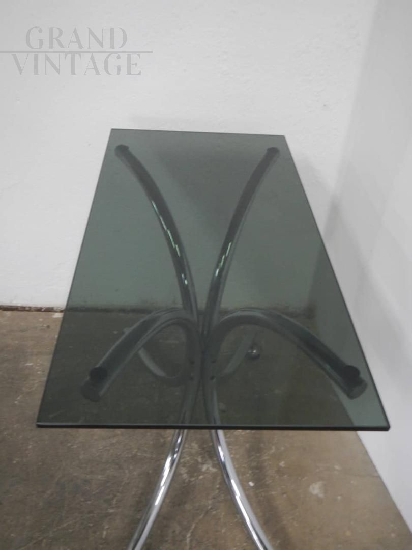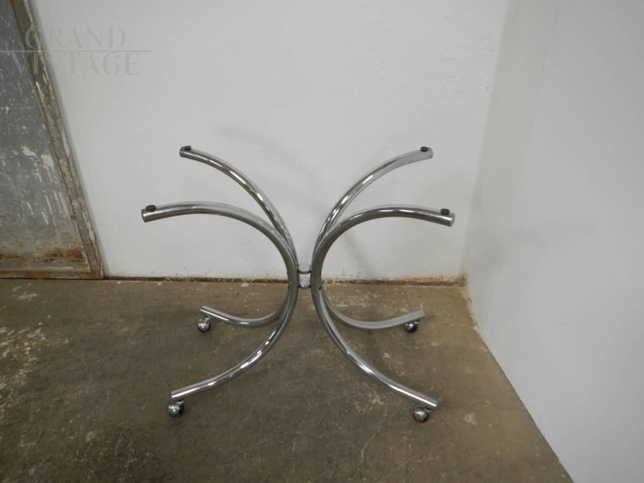 Tavolino vintage con base in metallo cromato con ruote originali e ripiano in vetro fumè verde, modernariato italiano anni '60.