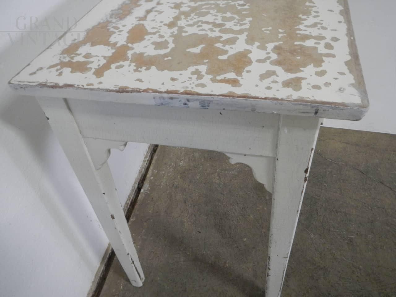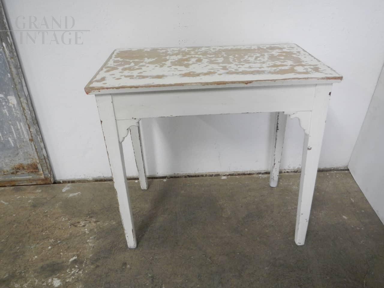 Tavolino vintage in abete laccato bianco con cassetto e piano in faesite trattato con vernice per mantenerne l'aspetto originale rendendo però il piano liscio al tatto. Buona la struttura.