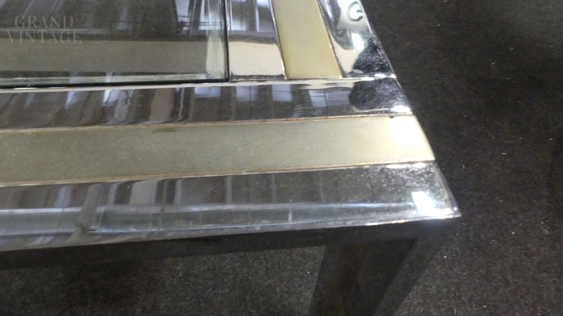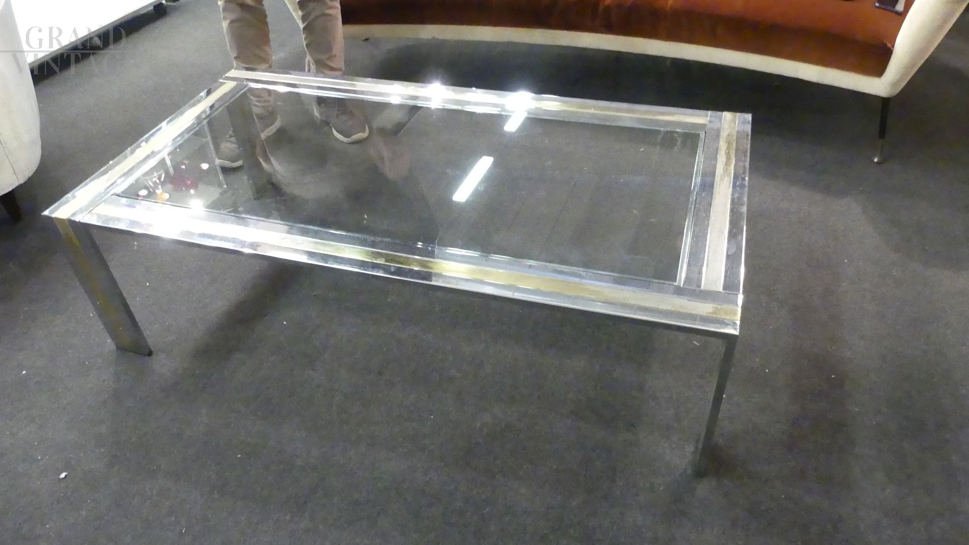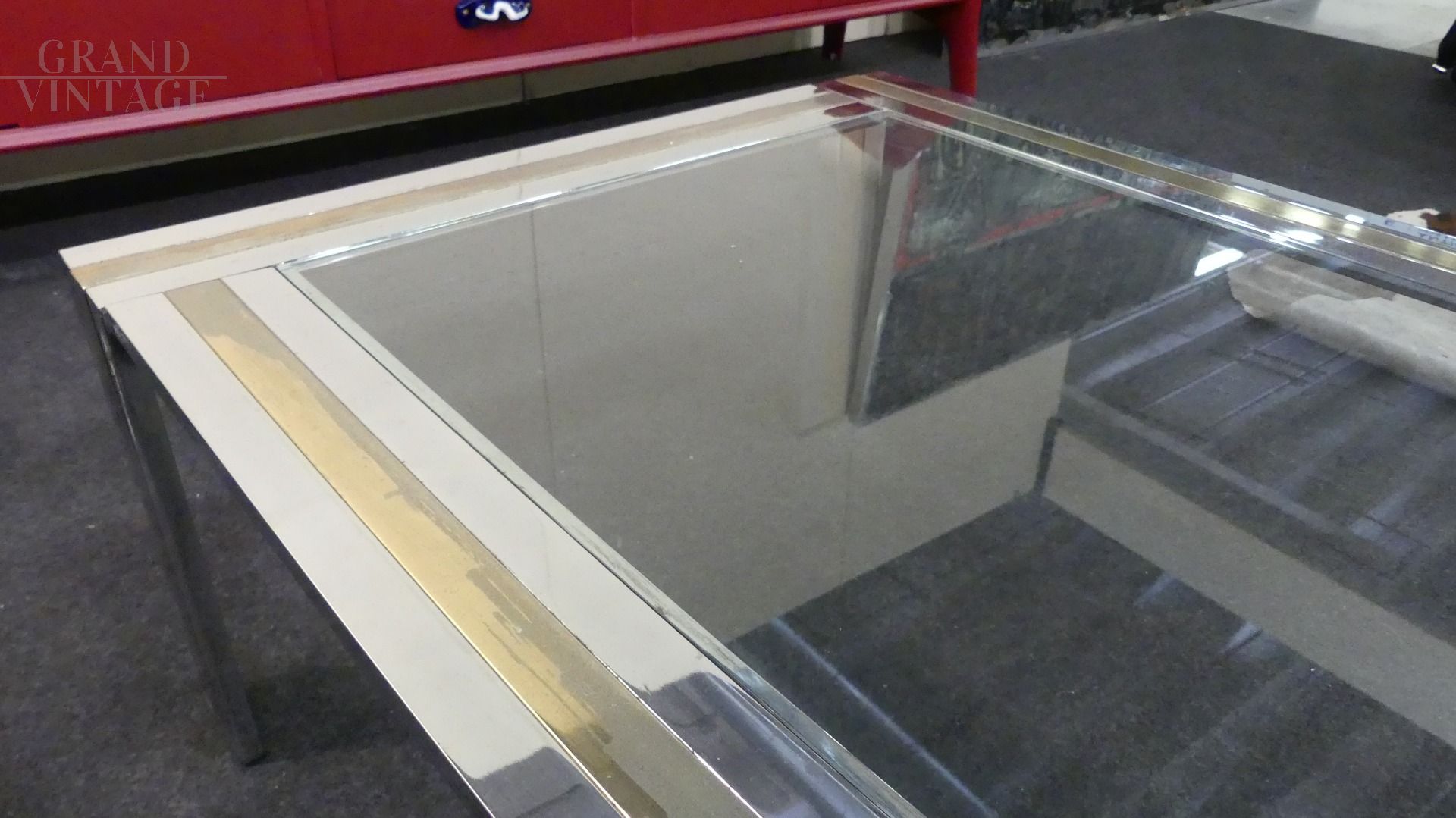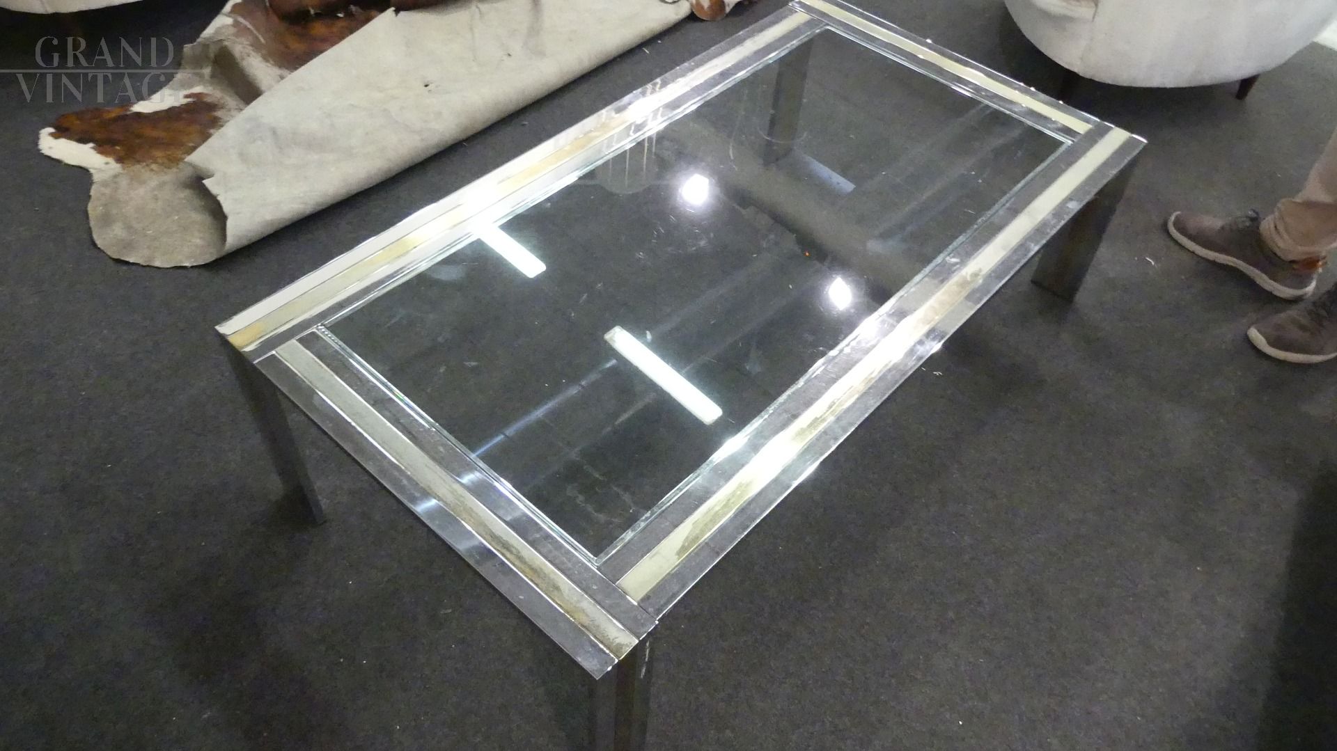 Tavolino vintage da caffè in metallo, con una caratteristica striscia in ottone ad impreziosire la cornice che racchiude il piano in cristallo originale anni '70. E' un tavolino da centro, un pezzo bellissimo anche mostrando i naturali segni del tempo.
