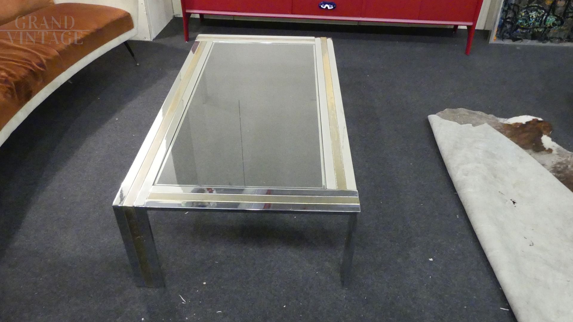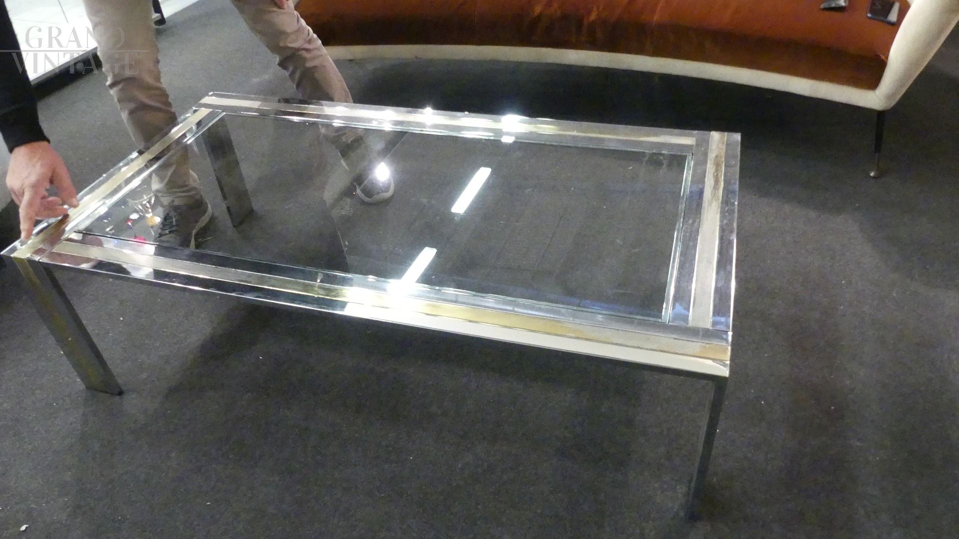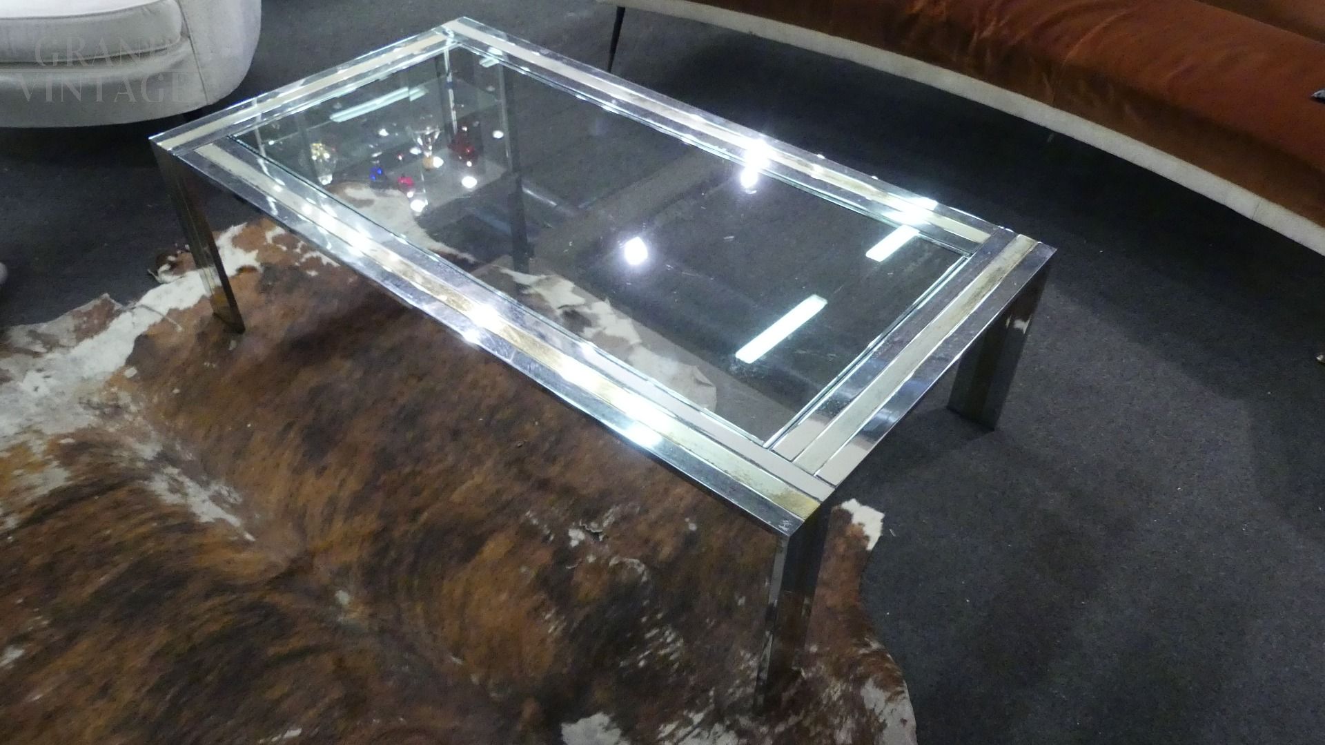 Tavolino vintage da caffè in metallo, con una caratteristica striscia in ottone ad impreziosire la cornice che racchiude il piano in cristallo originale anni '70. E' un tavolino da centro, un pezzo bellissimo anche mostrando i naturali segni del tempo.