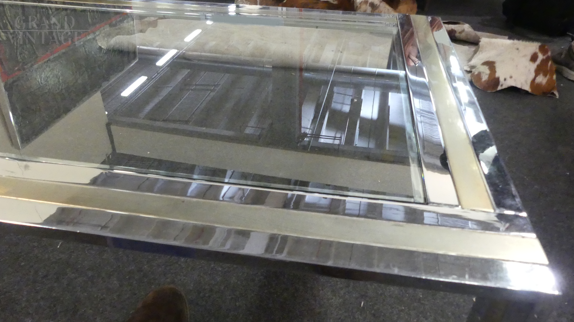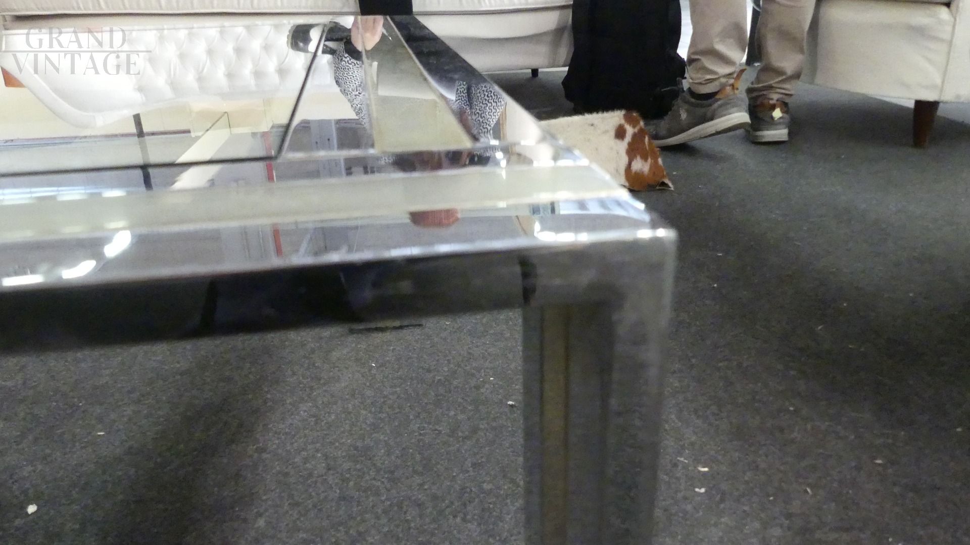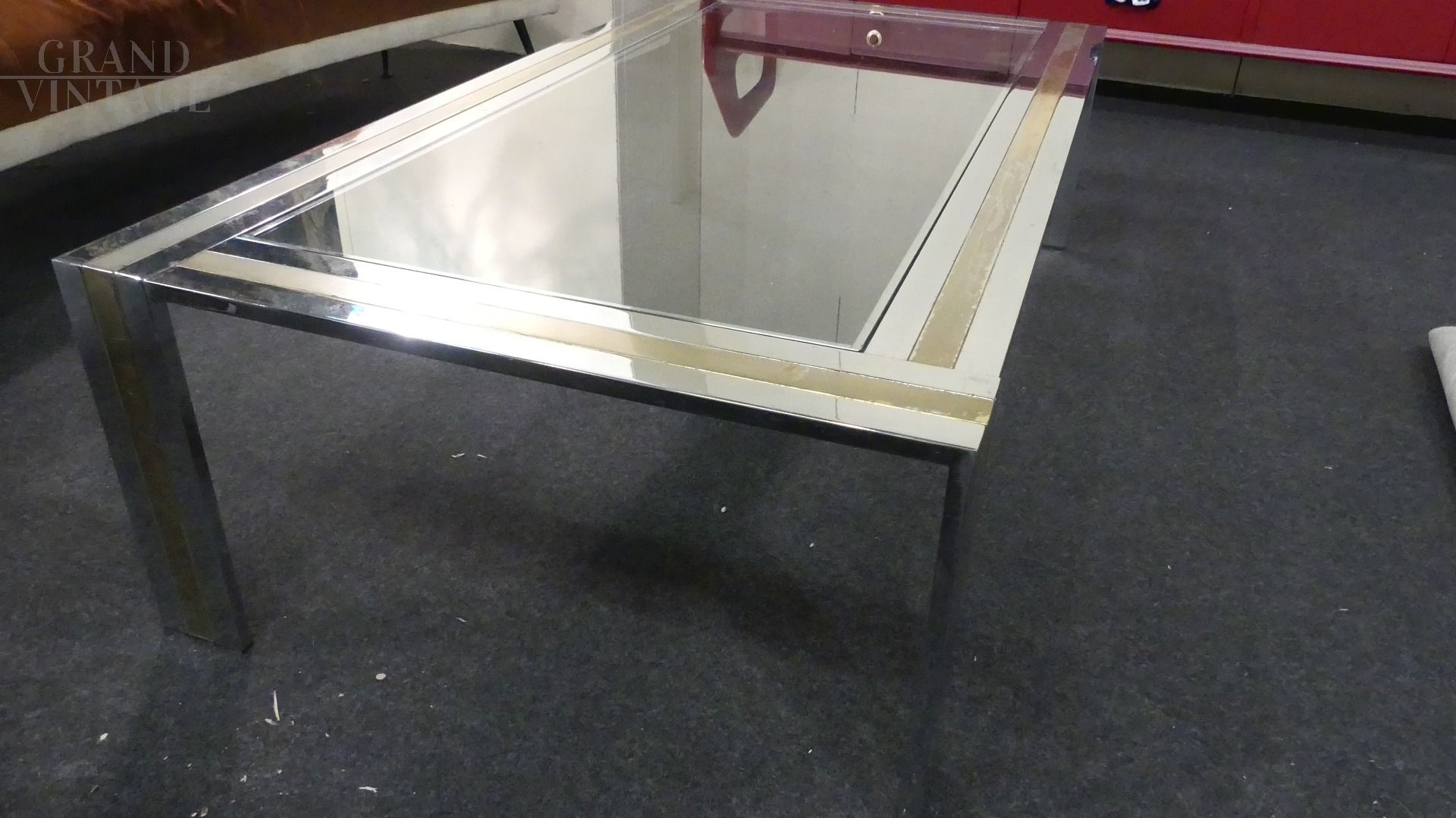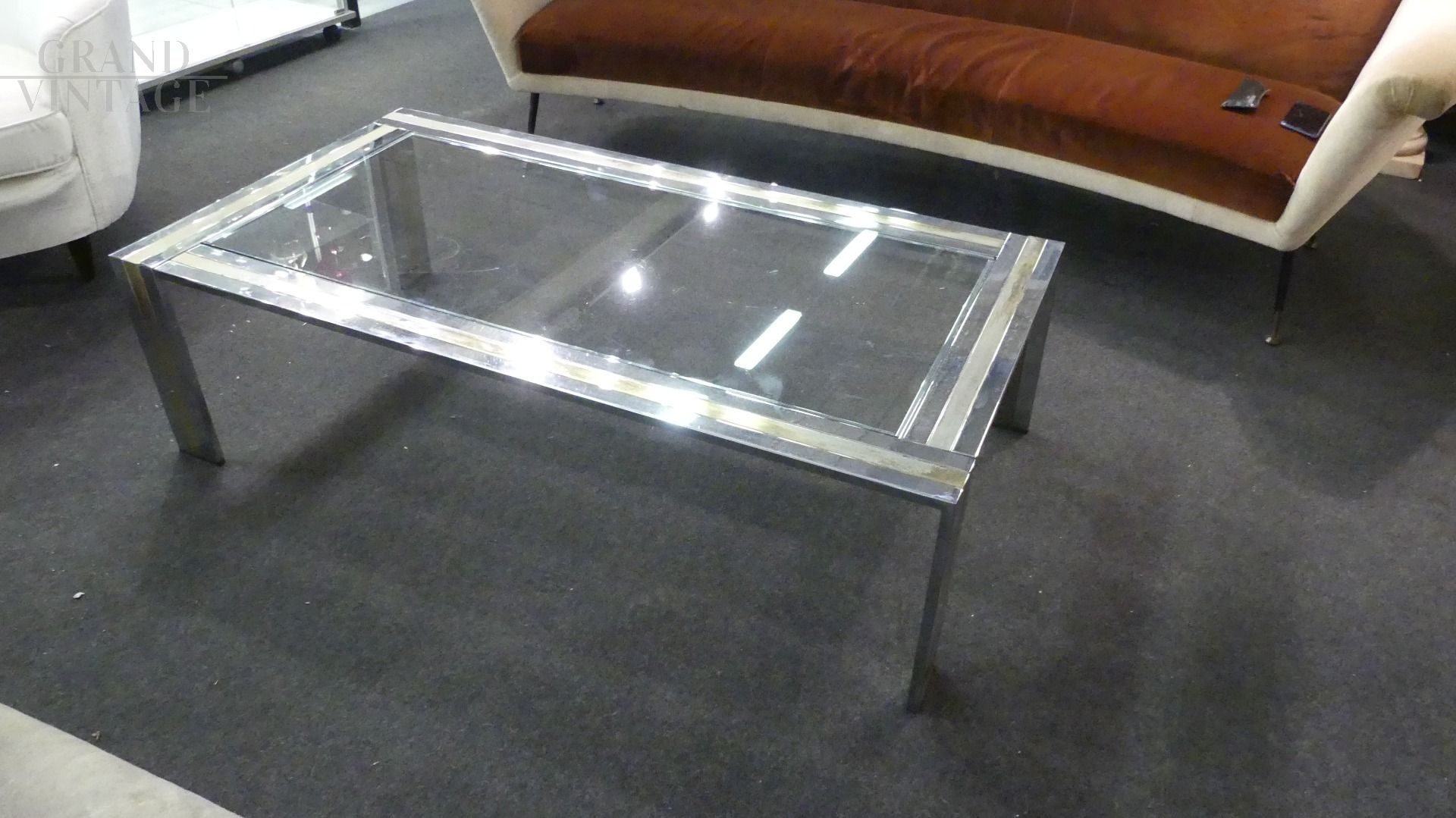 Tavolino vintage da caffè in metallo, con una caratteristica striscia in ottone ad impreziosire la cornice che racchiude il piano in cristallo originale anni '70. E' un tavolino da centro, un pezzo bellissimo anche mostrando i naturali segni del tempo.