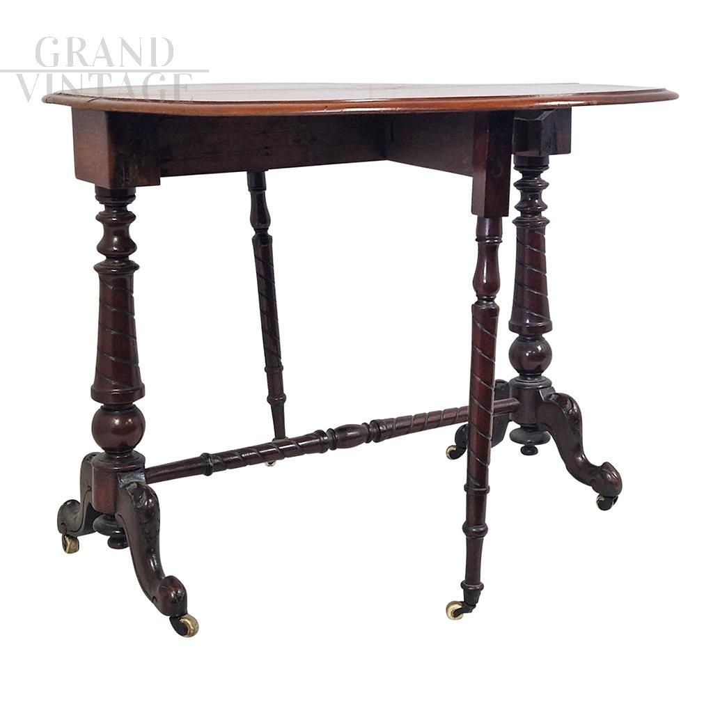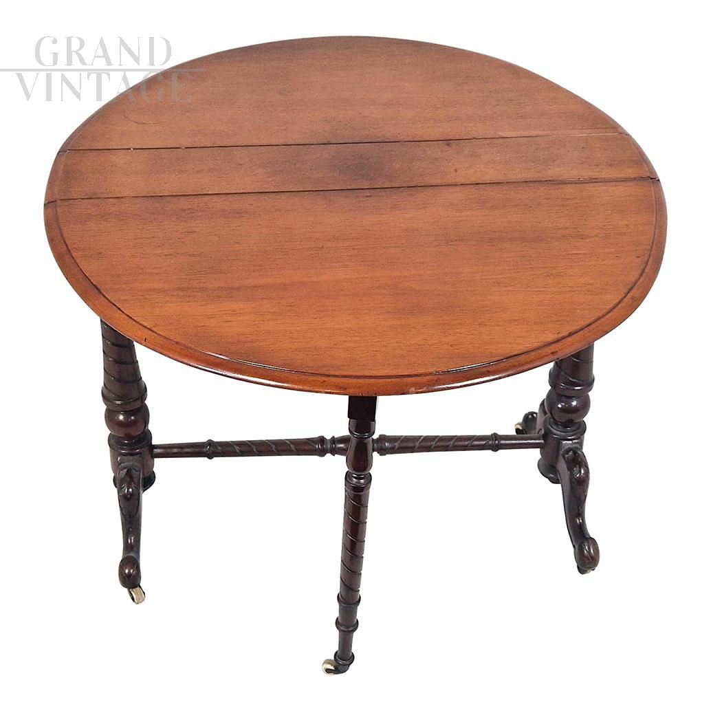 Tavolino inglese antico in stile Vittoriano con piano ovale in noce apribile grazie a delle bandelle laterali sostenute da due delle quattro gambe tornite raccordate da traversa con quadrato centrale, che ne permette lo spostamento grazie anche alle comode rotelline.