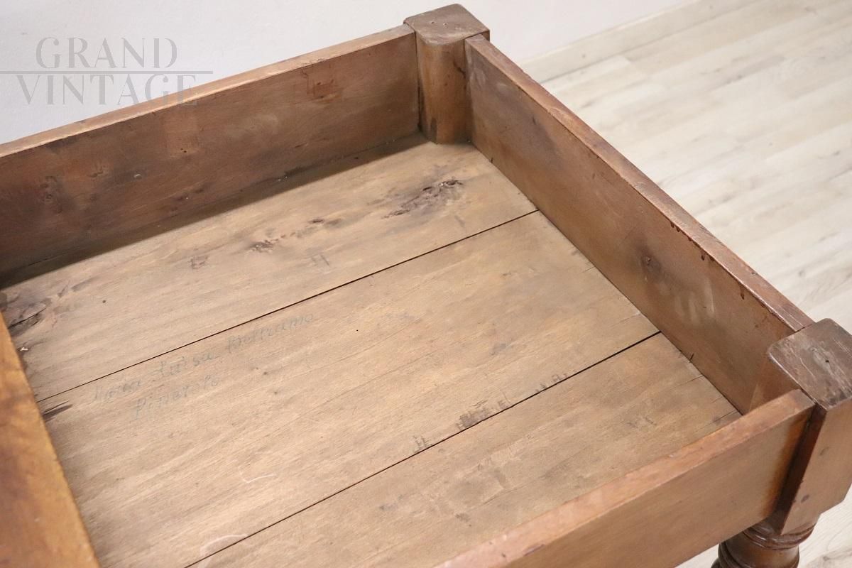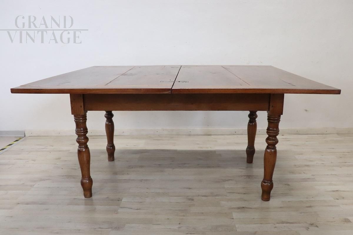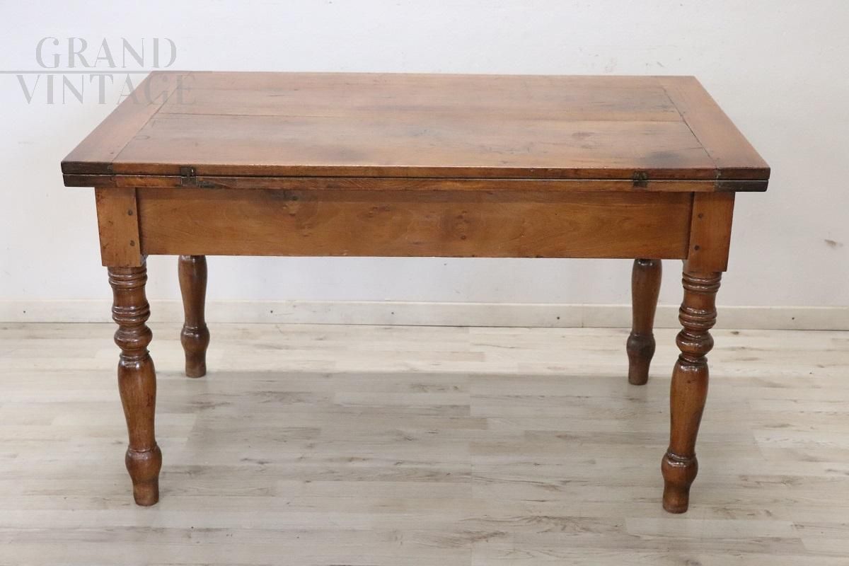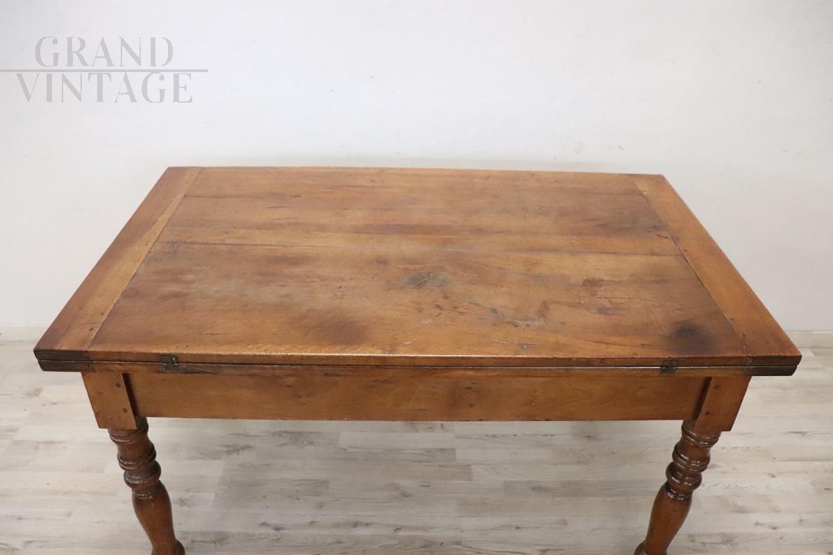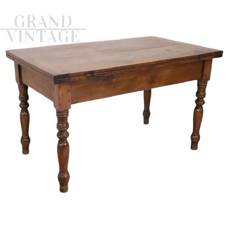 Squisito tavolo italiano antico, realizzato durante il periodo Luigi Filippo, a metà del XIX secolo. Conosciuto come “tavolo a libro” per il suo design unico, il piano si apre elegantemente come le pagine di un libro, raddoppiando di fatto la profondità e fornendo ampio spazio. Costruito in legno di noce massello, questo tavolo è robusto ed esteticamente gradevole, sostenuto da gambe ornate da raffinati dettagli di tornitura. Un’ulteriore caratteristica è l’ampio vano portaoggetti sotto il piano del tavolo, perfetto per riporre le tovaglie e vari oggetti da cucina. il meccanismo di apertura di facile utilizzo consente anche a una sola persona di espandere senza sforzo il tavolo quando hai ospiti a tavola. Quando è aperto le dimensioni sono 160x 135. Prezzo trattabile.