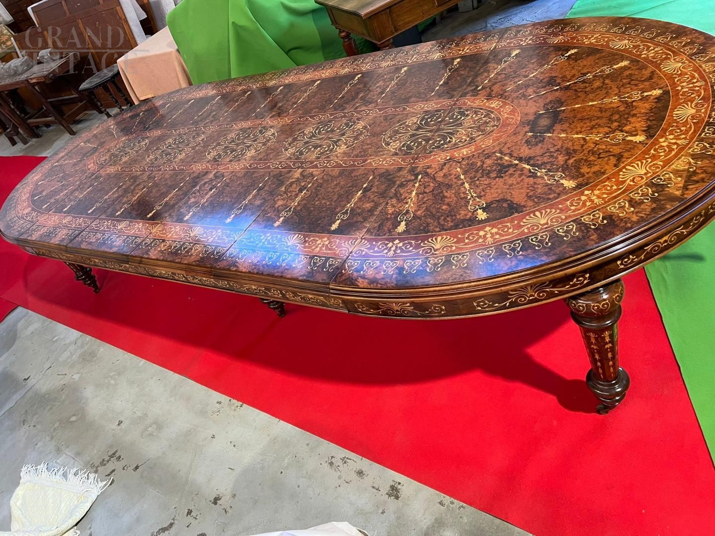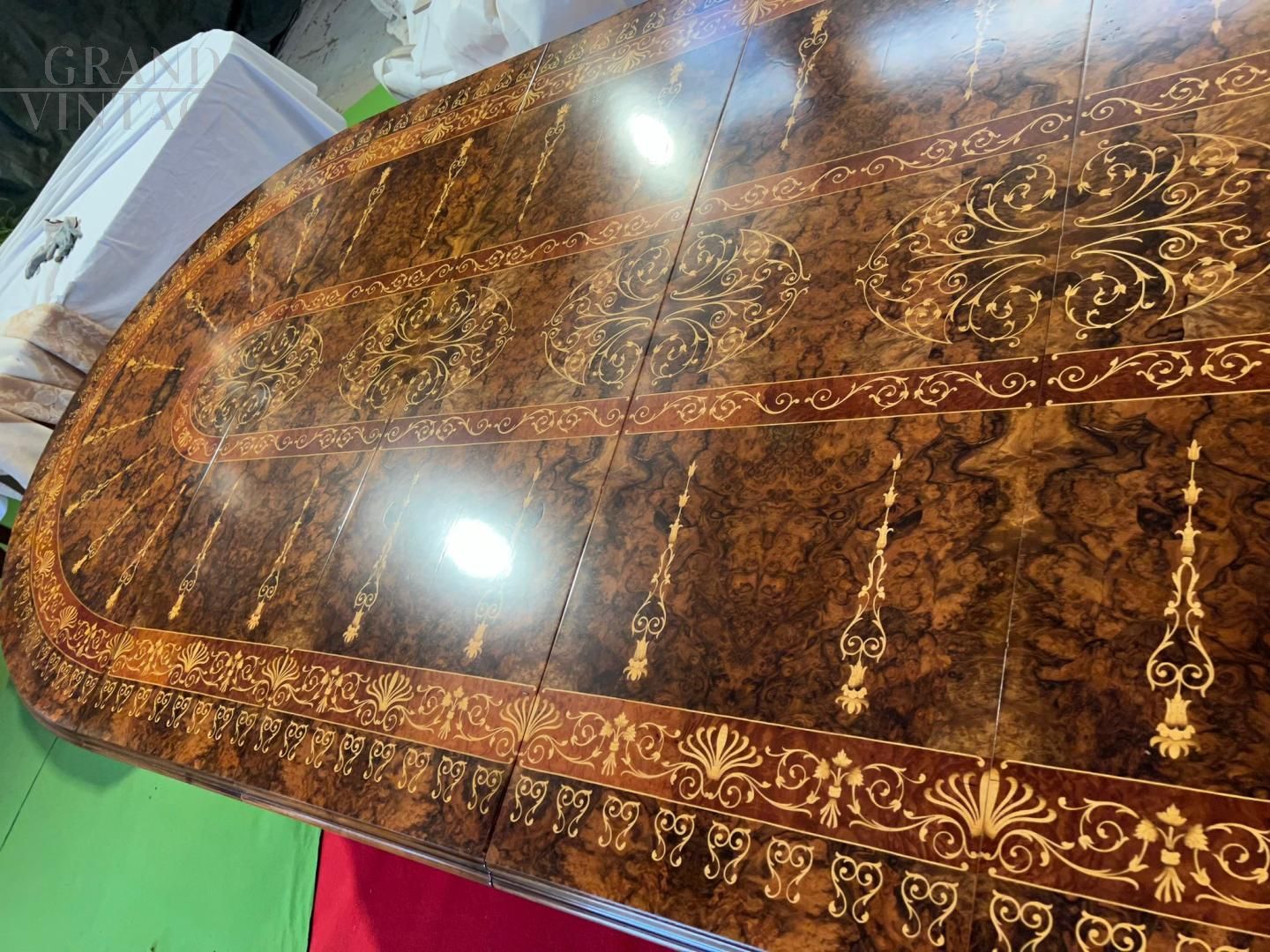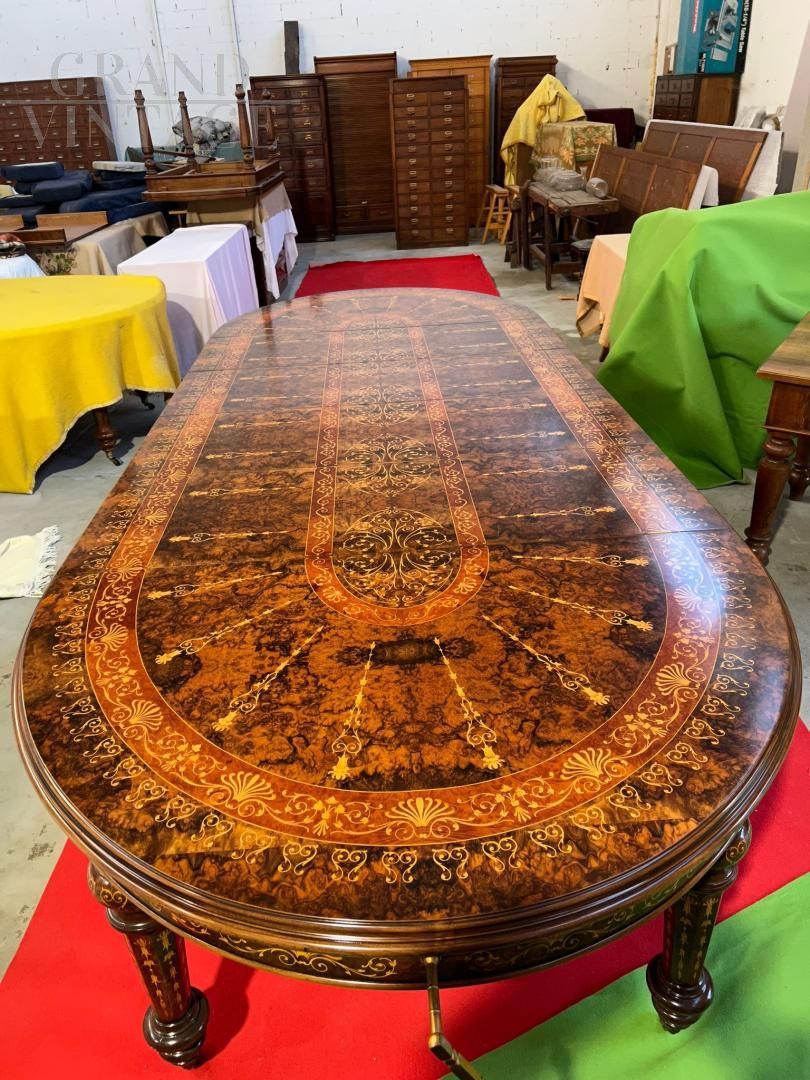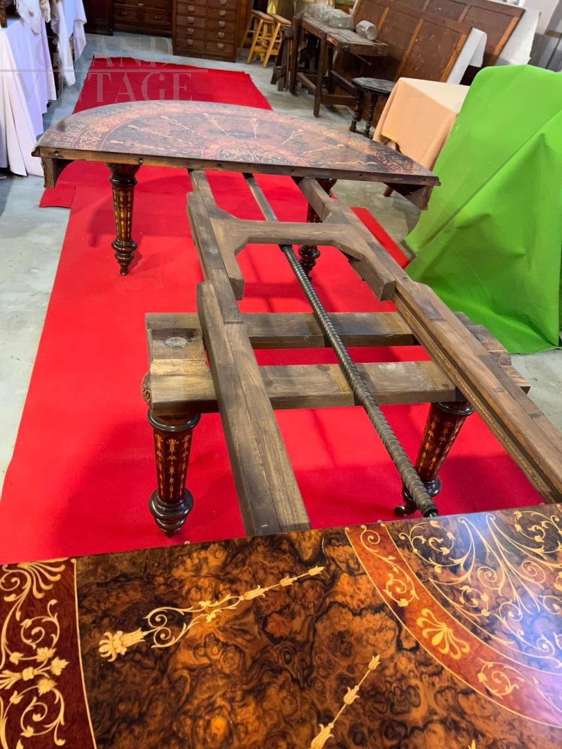 Stupendo tavolo antico allungabile a manovella in radica di noce con superbi intarsi a motivi floreali e geometrici in legno di bosso, radica di tuja, acero, acanto, frassino e rovere, proveniente da una importante Villa Palladiana.