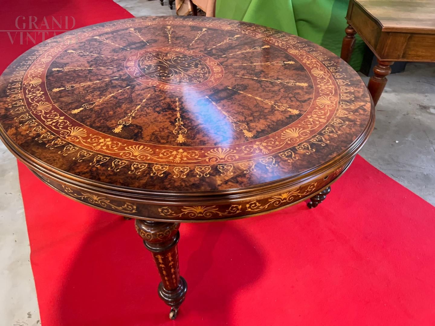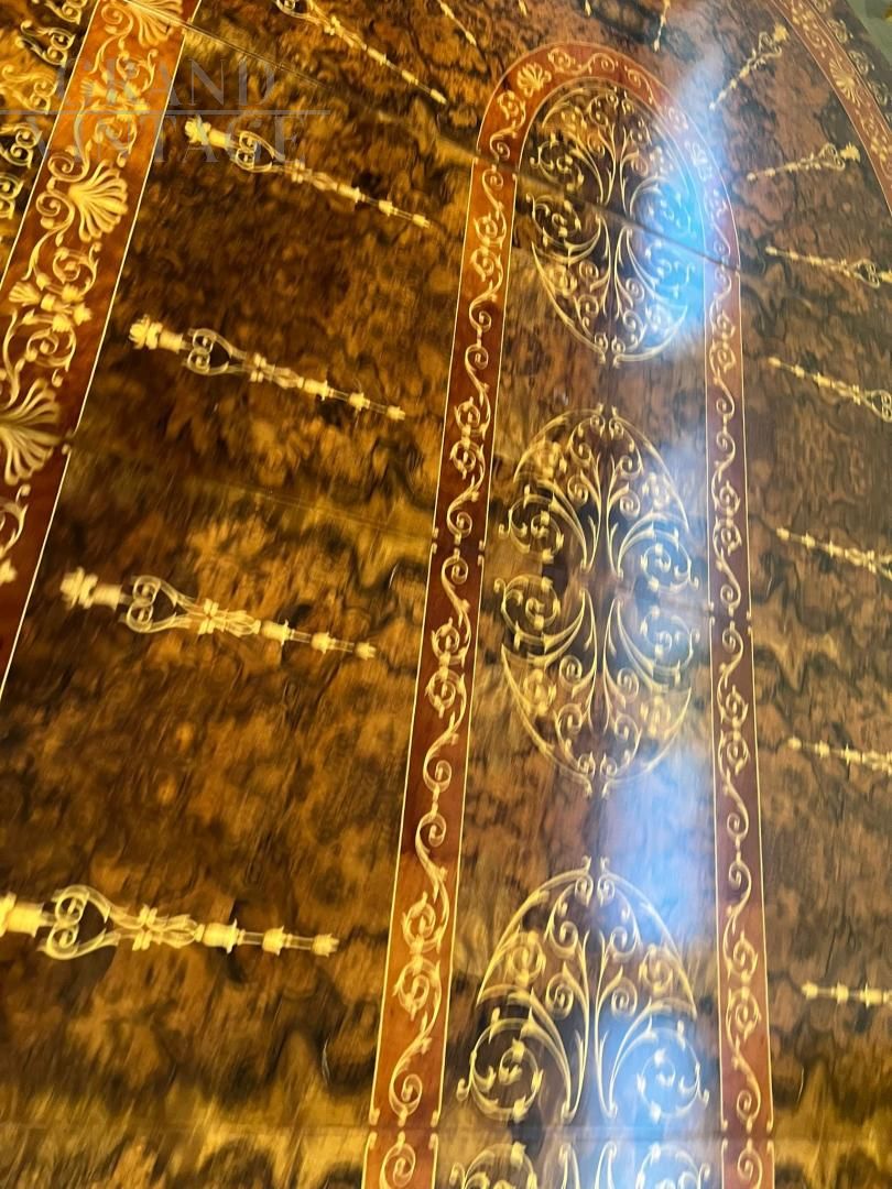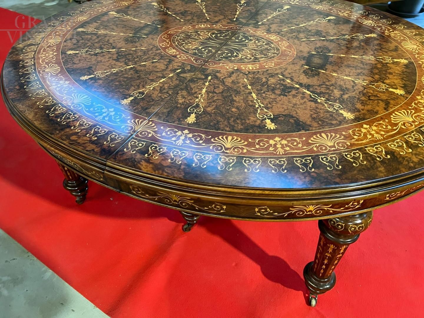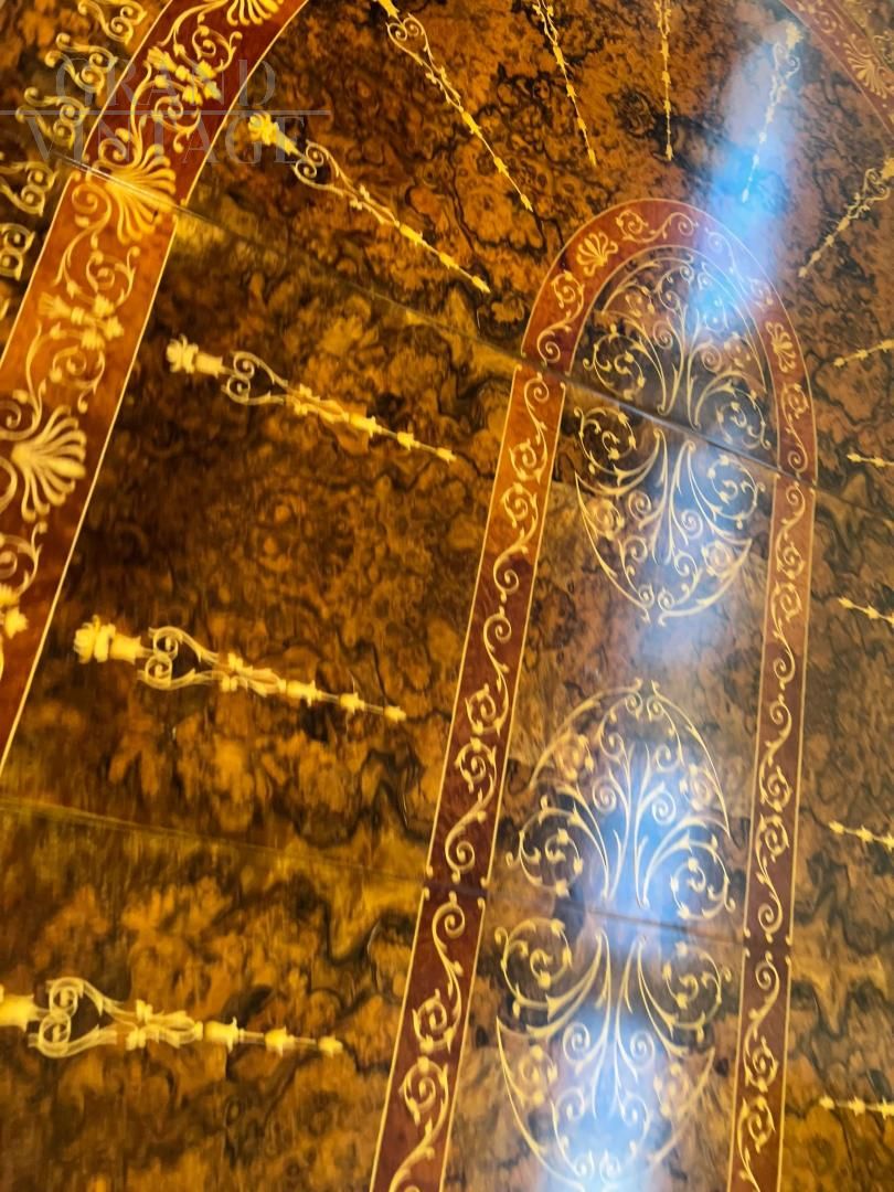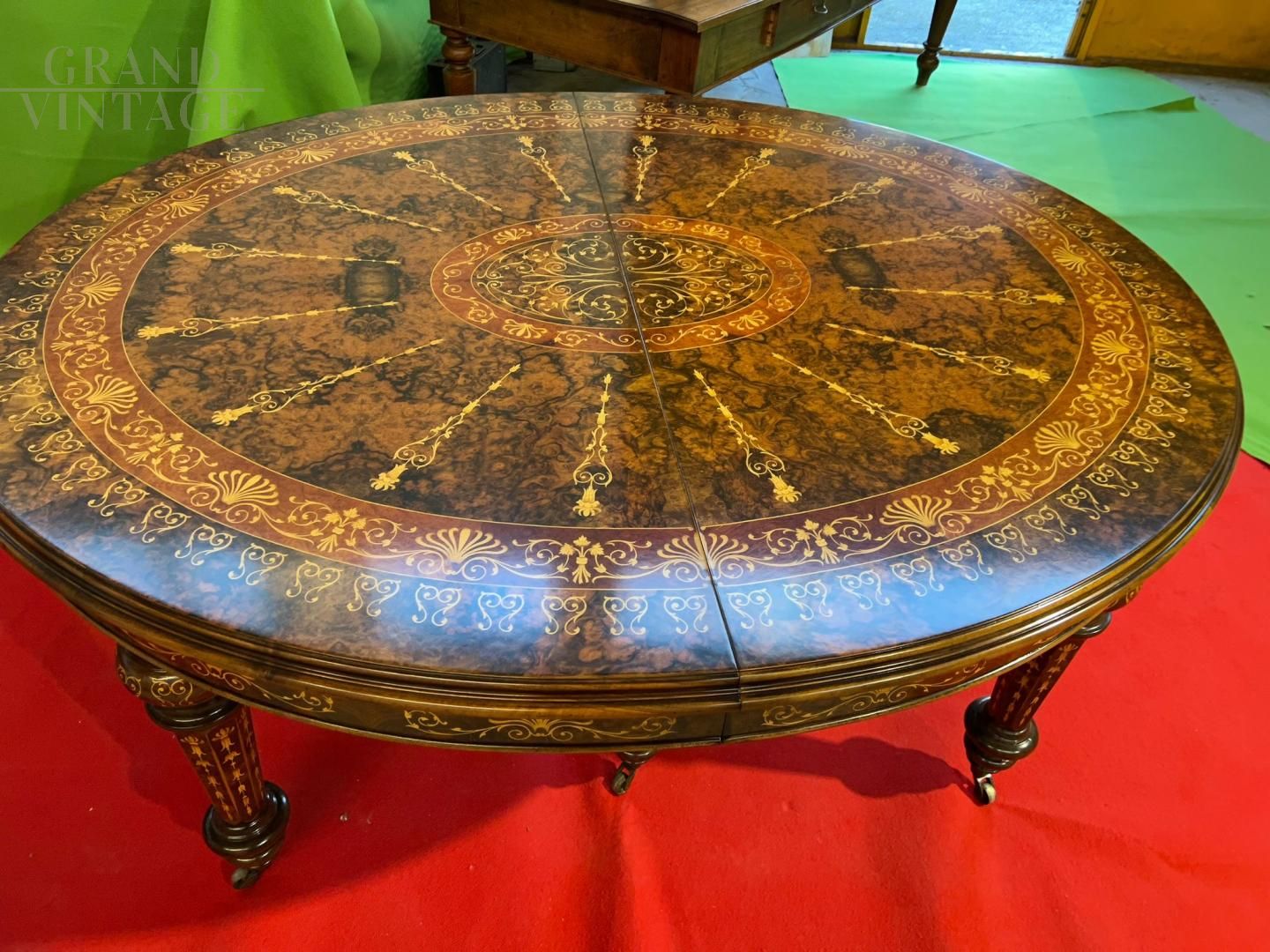 Stupendo tavolo antico allungabile a manovella in radica di noce con superbi intarsi a motivi floreali e geometrici in legno di bosso, radica di tuja, acero, acanto, frassino e rovere, proveniente da una importante Villa Palladiana.