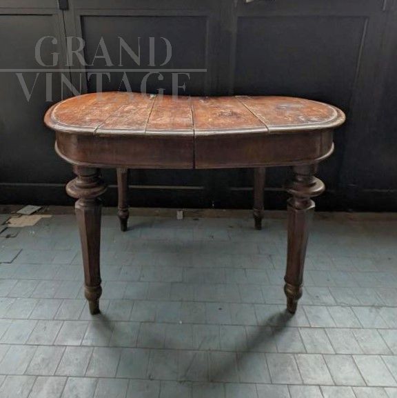 Tavolo antico allungabile con piano ovale, necessita di un restauro e ha una prolunga di estensione mancante.
