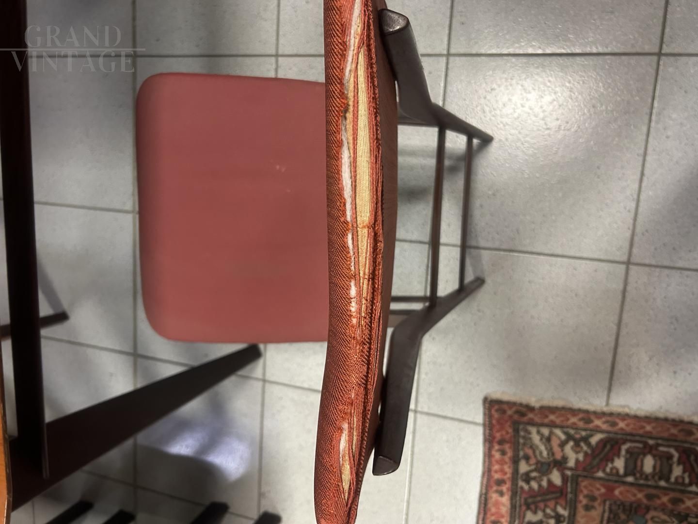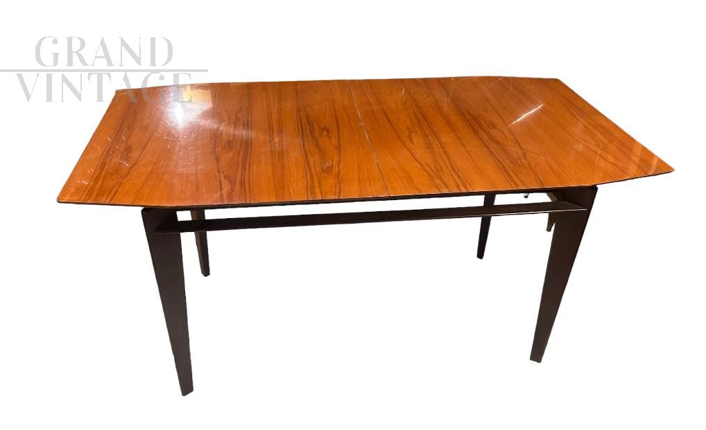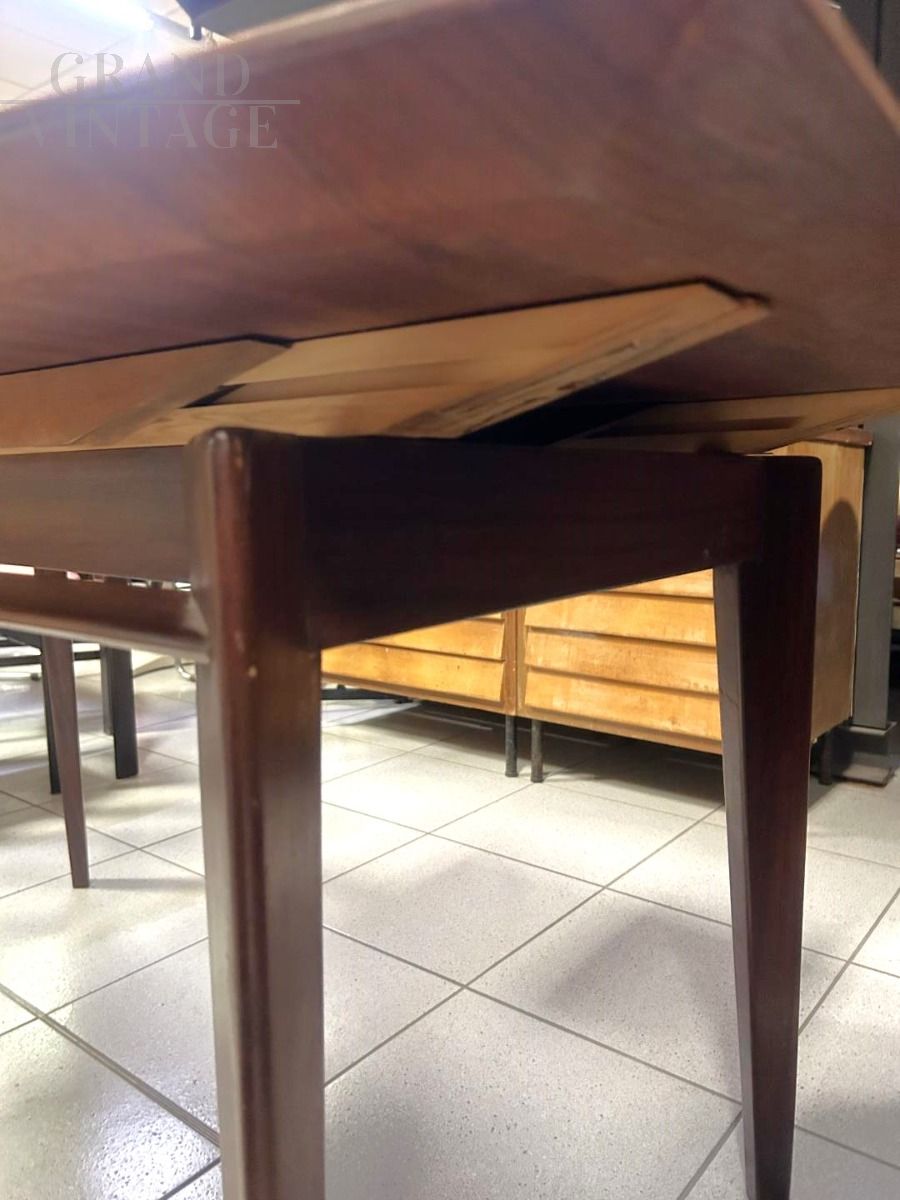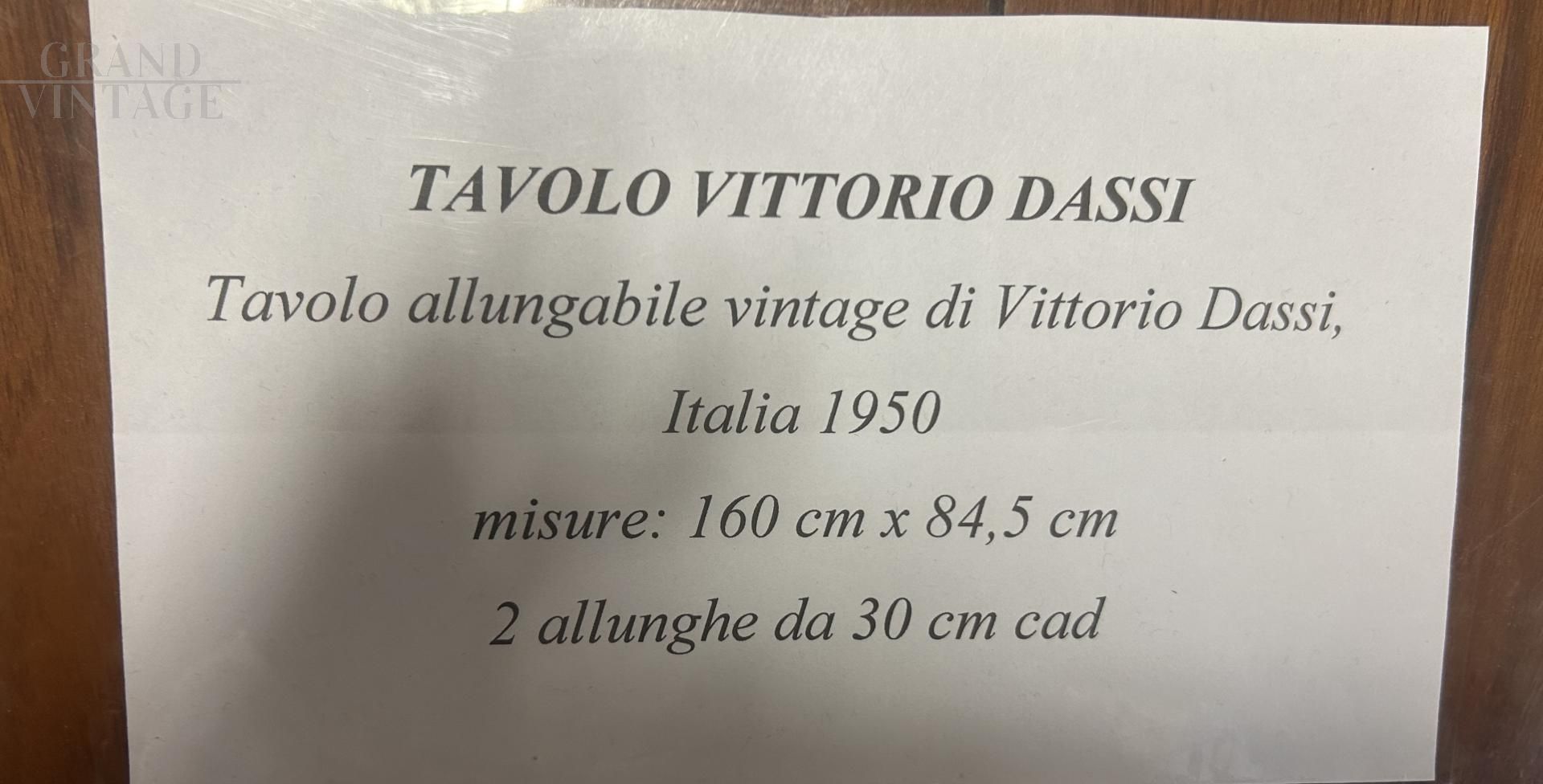 Tavolo allungabile design di Vittorio Dassi completo di 4 sedie, modernariato italiano anni '50. In buono stato con le naturali tracce del tempo, in particolarele sedie sono strutturalmente in ordine, ma il tessuto va sostituito, come da foto, mentre struttura e imbottitura sono perfette.