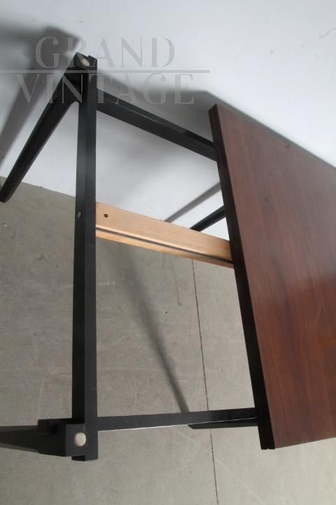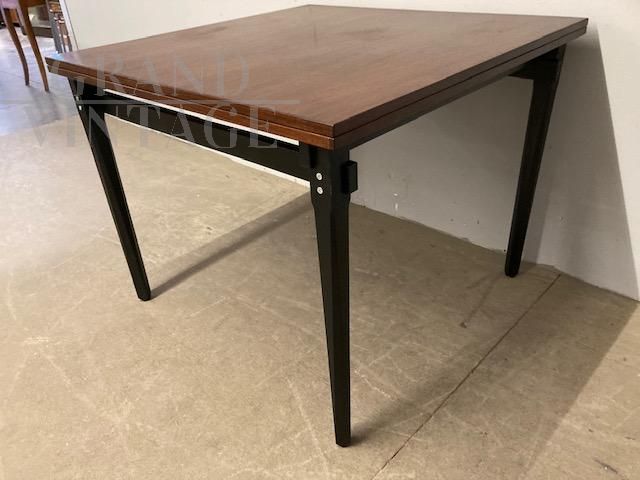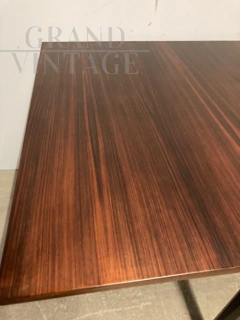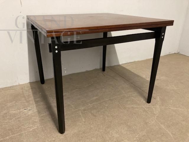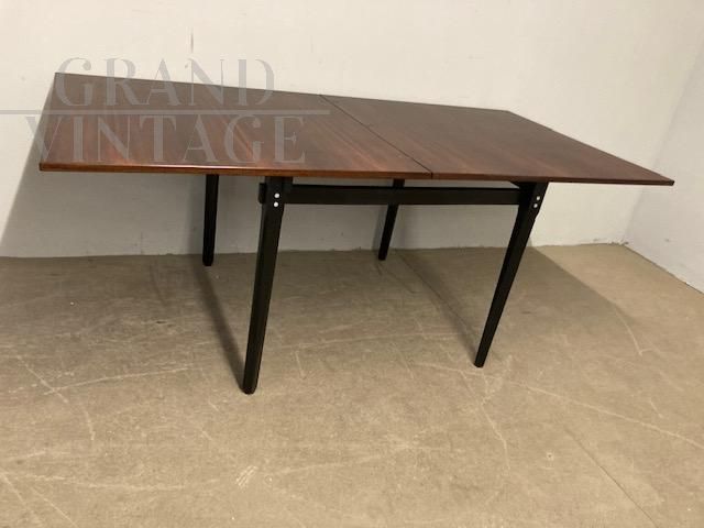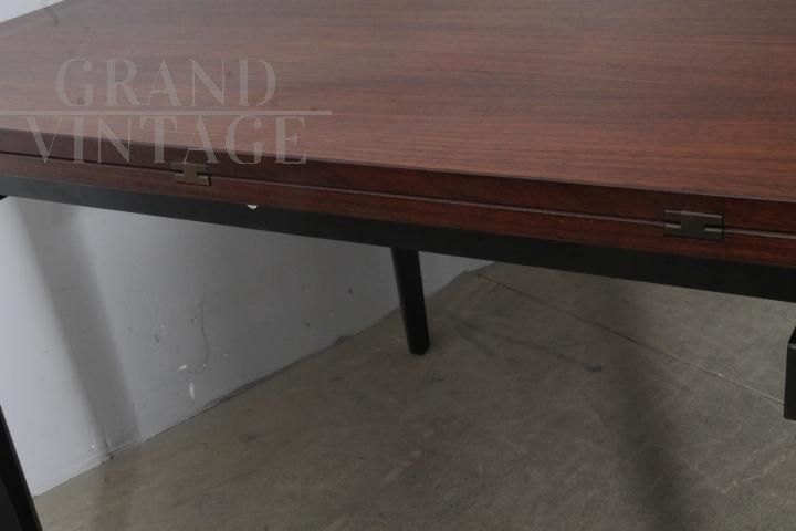 Tavolo allungabile design mid-century anni '60 dalla linea semplice, con piano in legno di palissandro di grande e gambe laccate nere, perfetto per gli stili scandinavo e rustico. Il piano si allunga e raddoppia la sua lunghezza. Restaurato mantenendo il vissuto, presenta piccoli segni del tempo trattandosi di un oggetto originale.