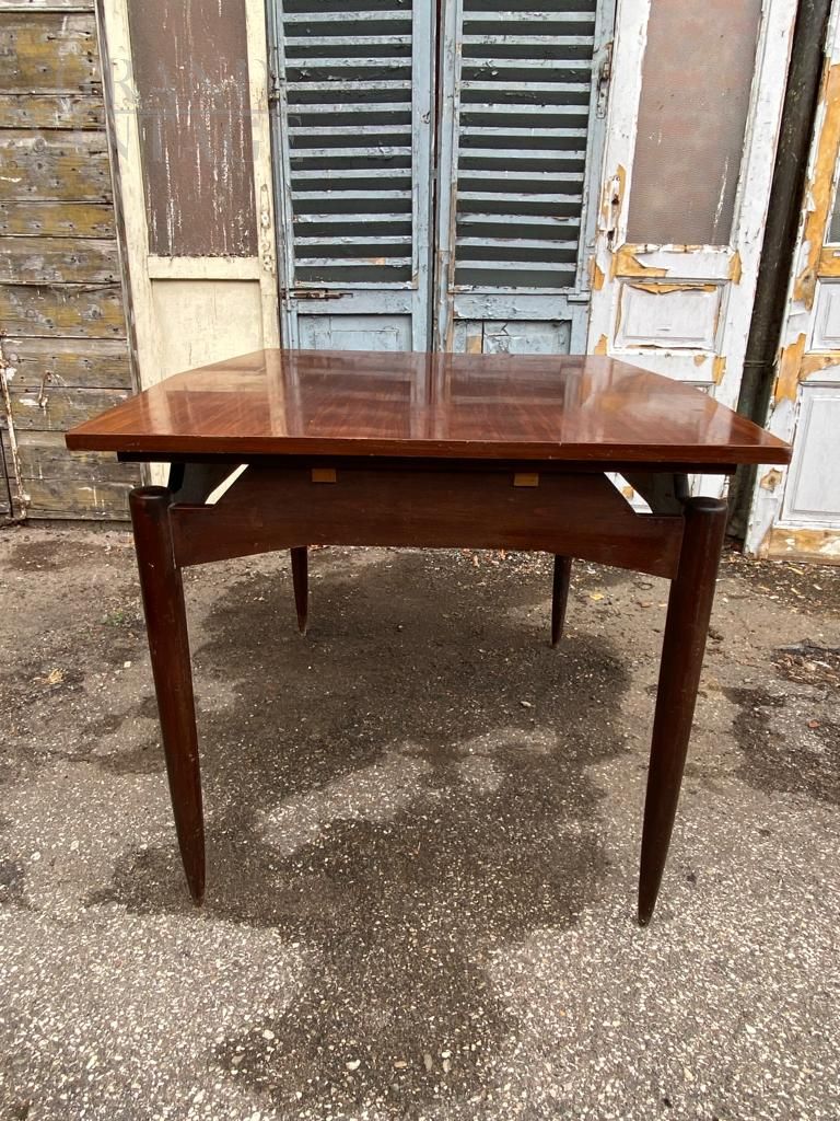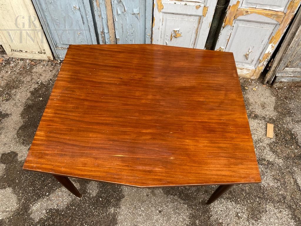 Tavolo allungabile vintage mid-century dal design scandinavo in legno di palissandro con particolare piano di forma esagonale, dalla linea sobria ed elegante.