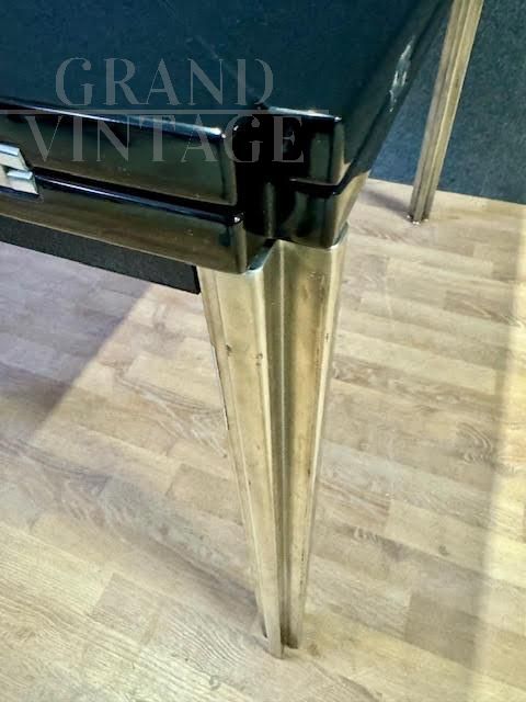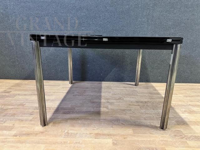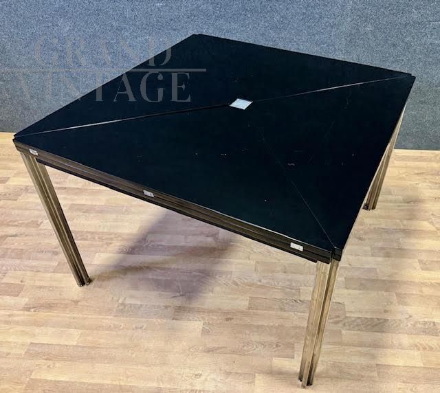 Tavolo da pranzo con struttura in metallo e piano quadrato in legno laccato, espandibile tramite rotazione su perno centrale e apertura delle alette su tutti e quattro i lati. Modello T92, Designer Eugenio Gerli e Mario Cristiani, Produttore Tecno, Anno 1960.