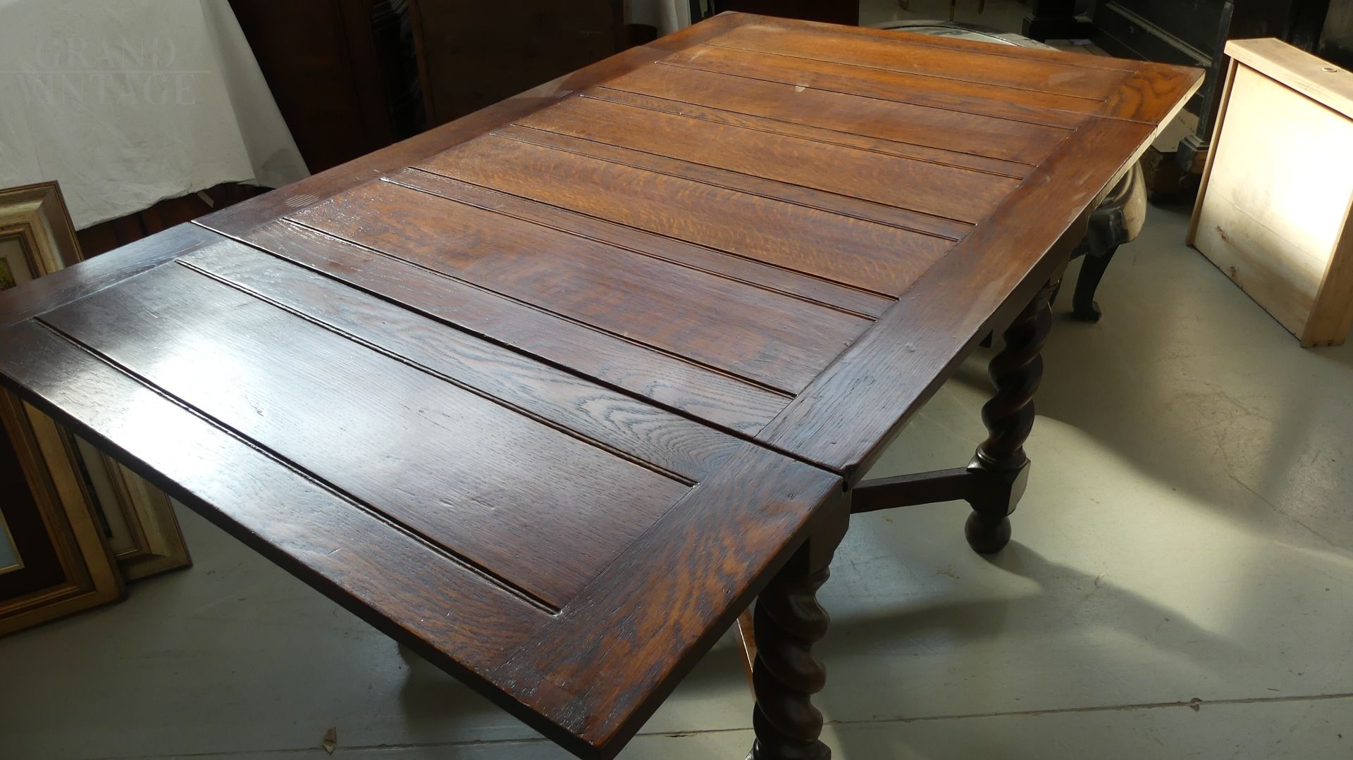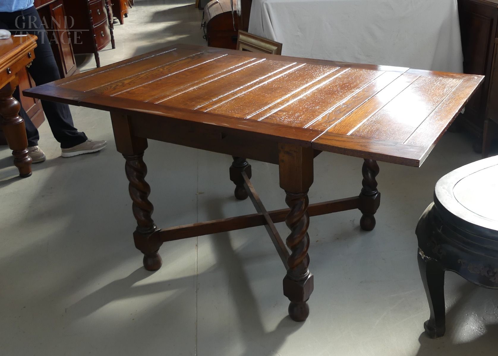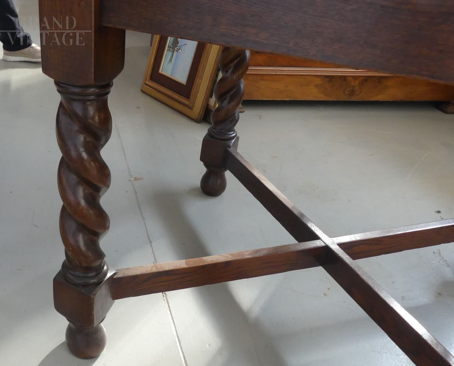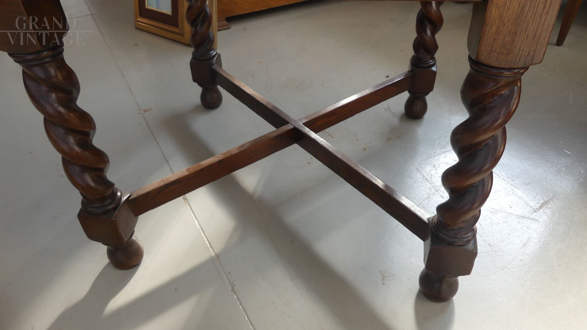 Tavolo vintage Inglese allungabile in legno di rovere, anni '50, con gambe elegantemente tornite unite da una crociera centrale. In buone condizioni, le misure indicate sono del tavolo aperto.