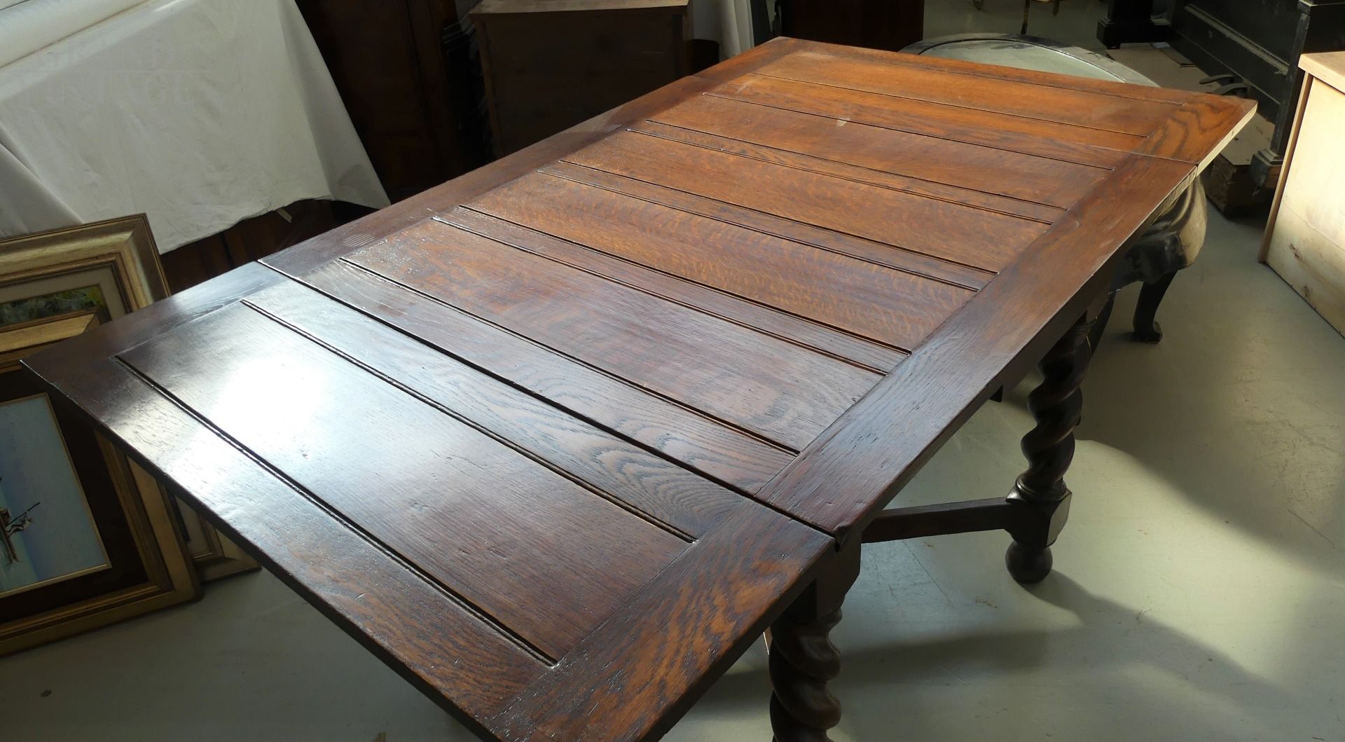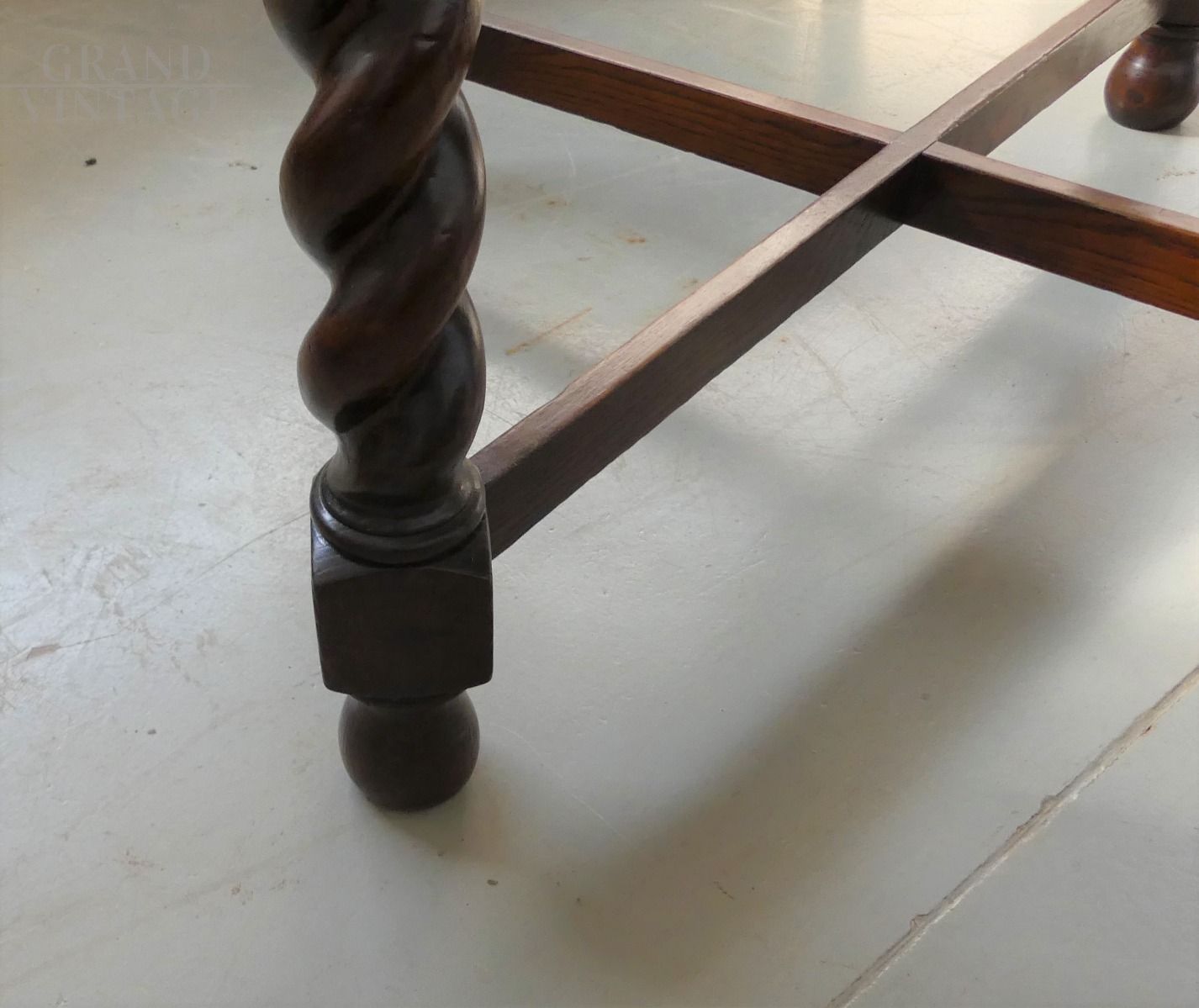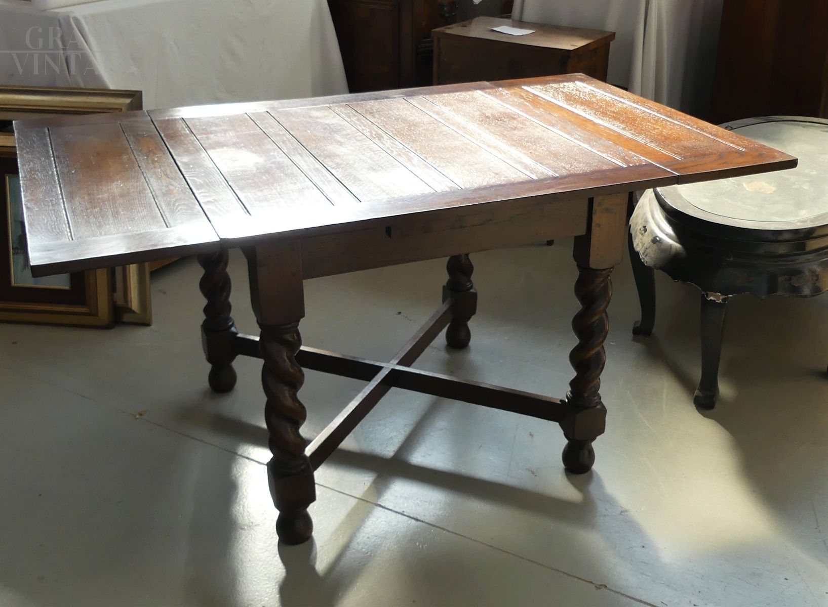 Tavolo vintage Inglese allungabile in legno di rovere, anni '50, con gambe elegantemente tornite unite da una crociera centrale. In buone condizioni, le misure indicate sono del tavolo aperto.