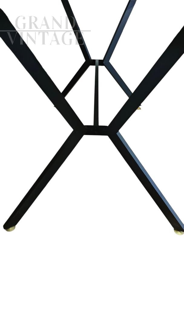 Bel tavolo di modernariato italiano con struttura in ferro nero con puntali in ottone e piano in cristallo arancione, dove lo stile industriale si fonde con il mid-century di classe.