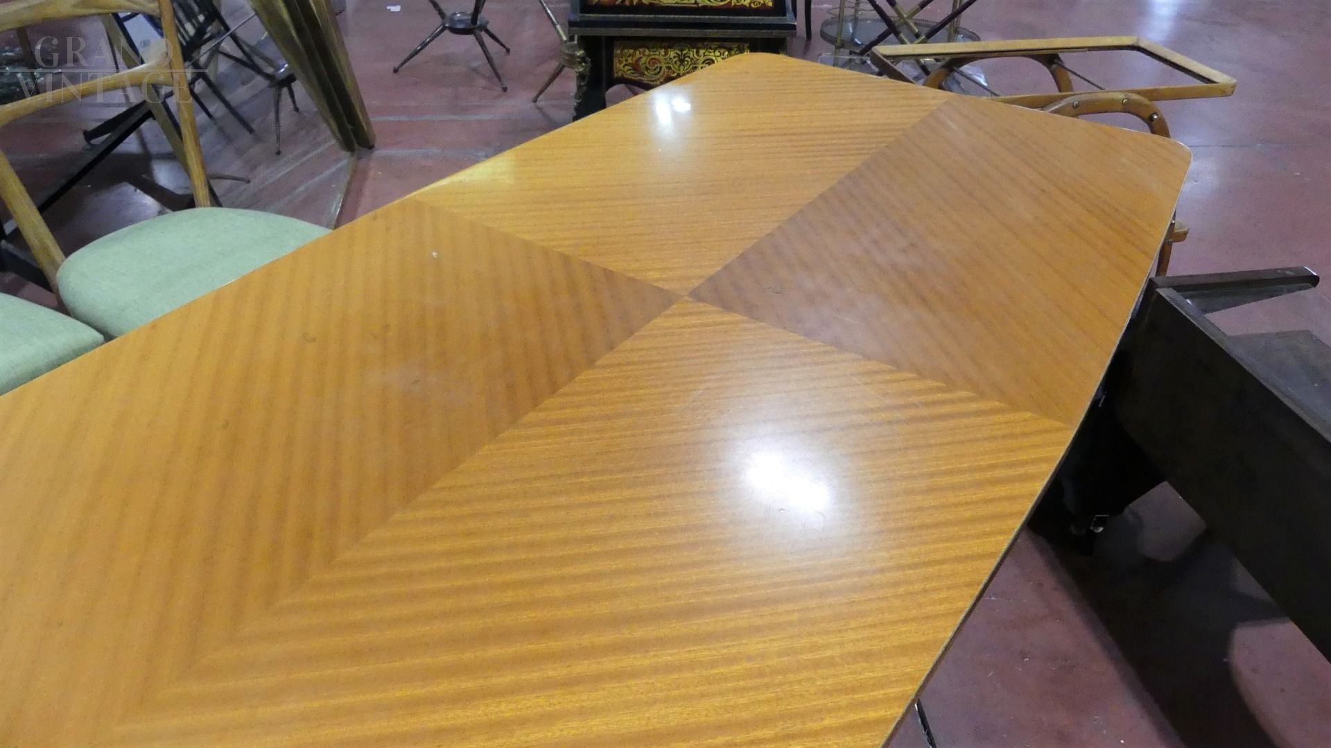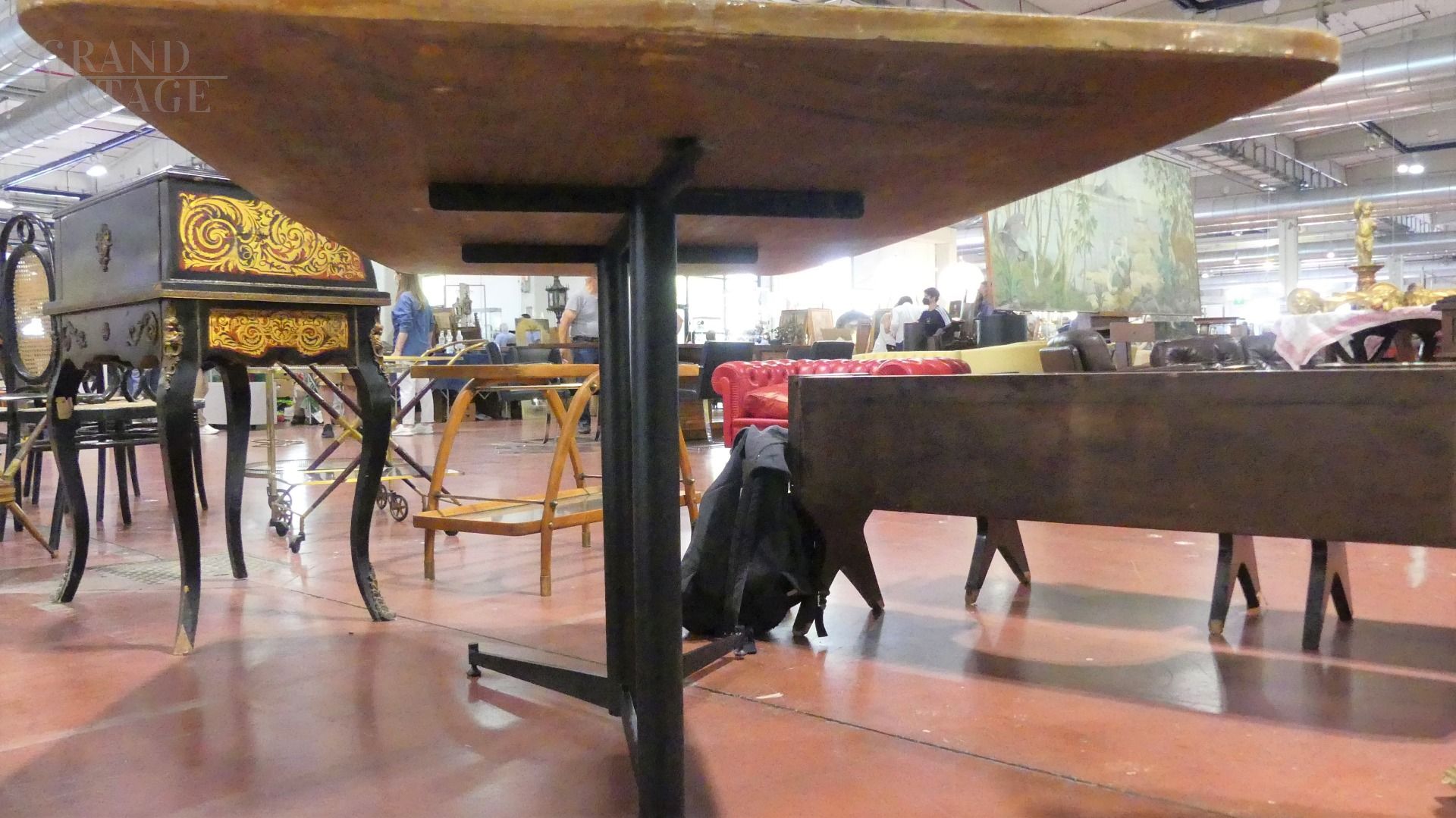 Tavolo vintage anni '70 con un bel piano in legno di noce disposto a creare un bellissimo effetto geometrico, struttura in ferro laccato nero e piedini regolabili in ottone.