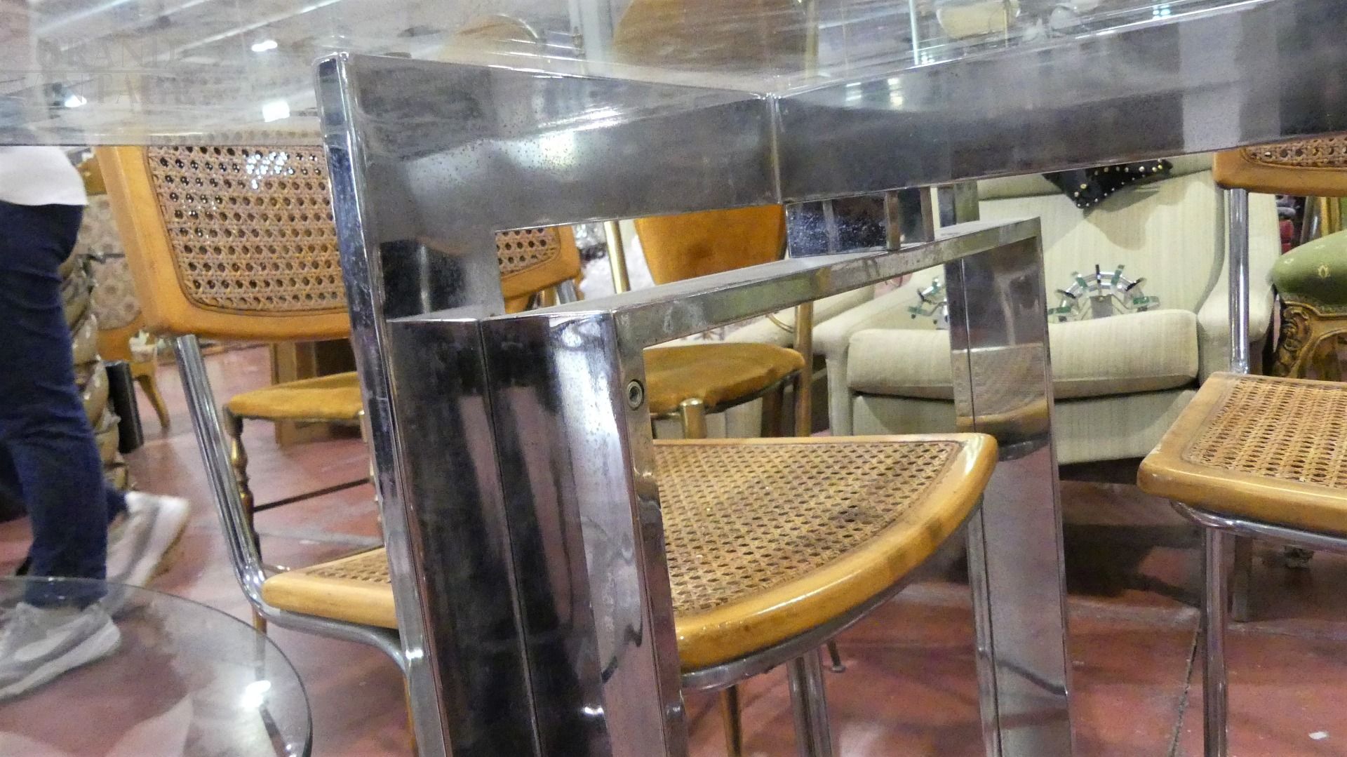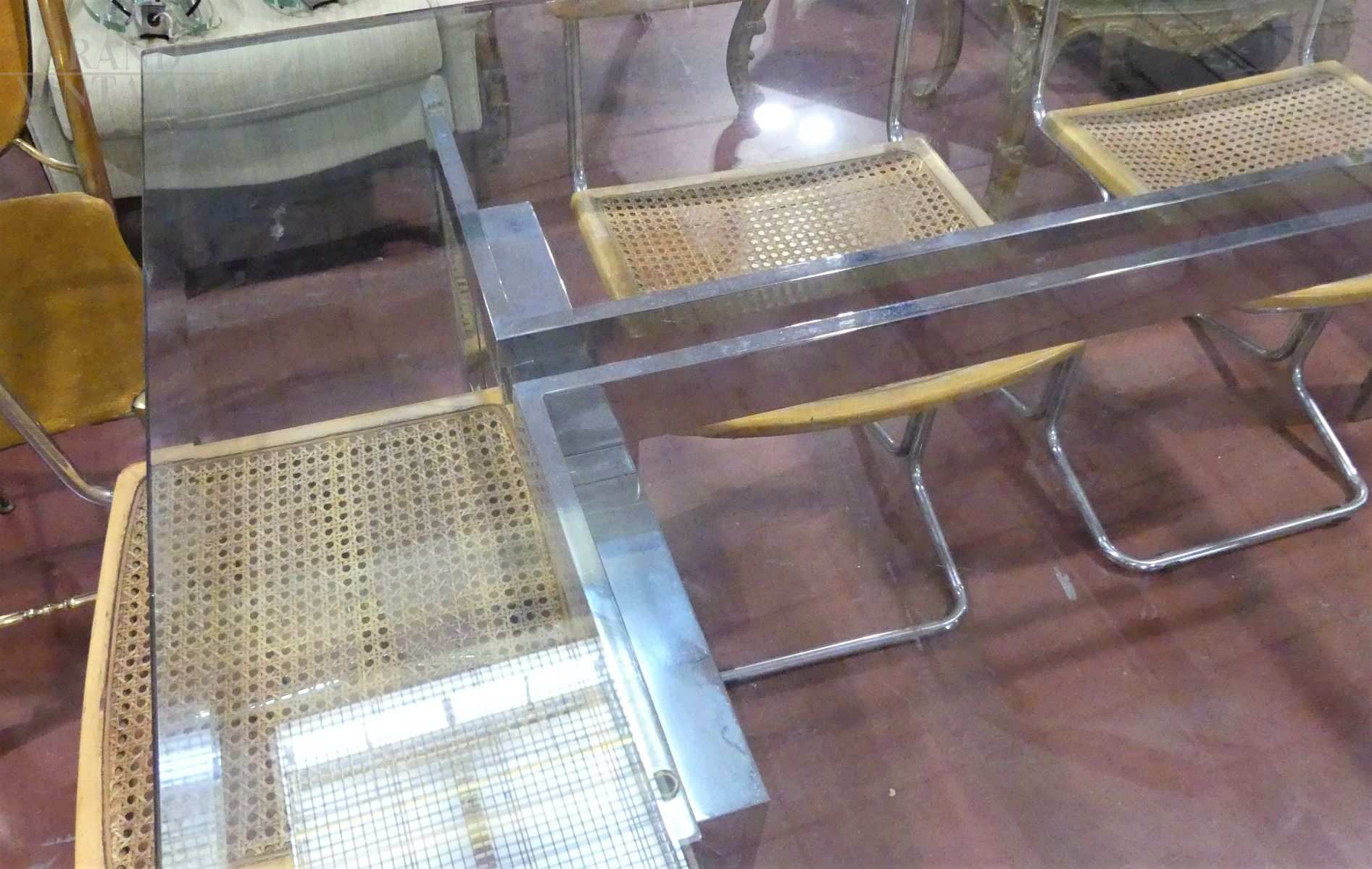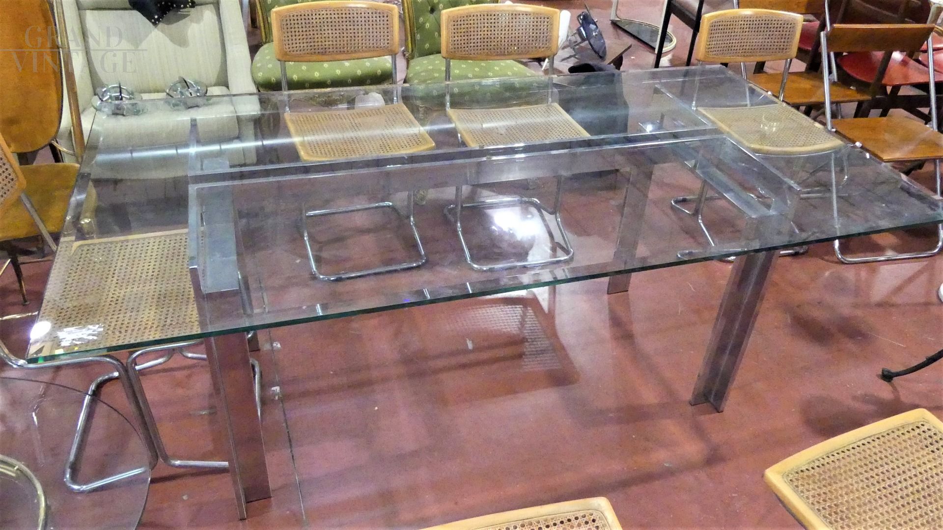 Tavolo vintage anni '70 con base in acciaio e piano in vetro, misure del piano 180 x 95 cm, altezza al piano 73 cm.