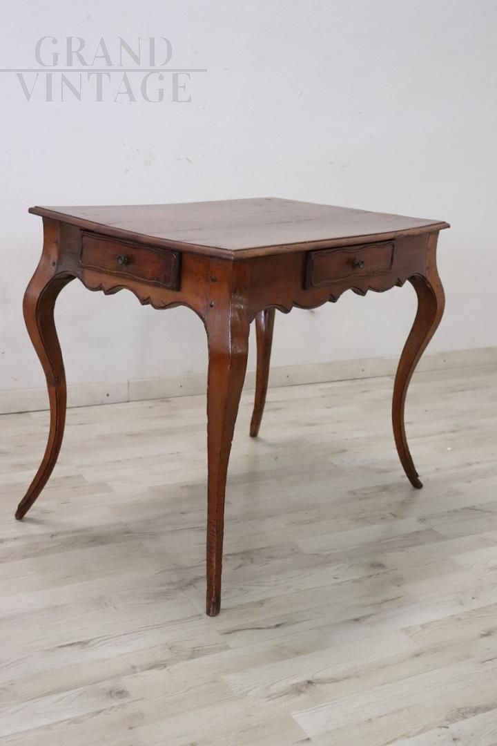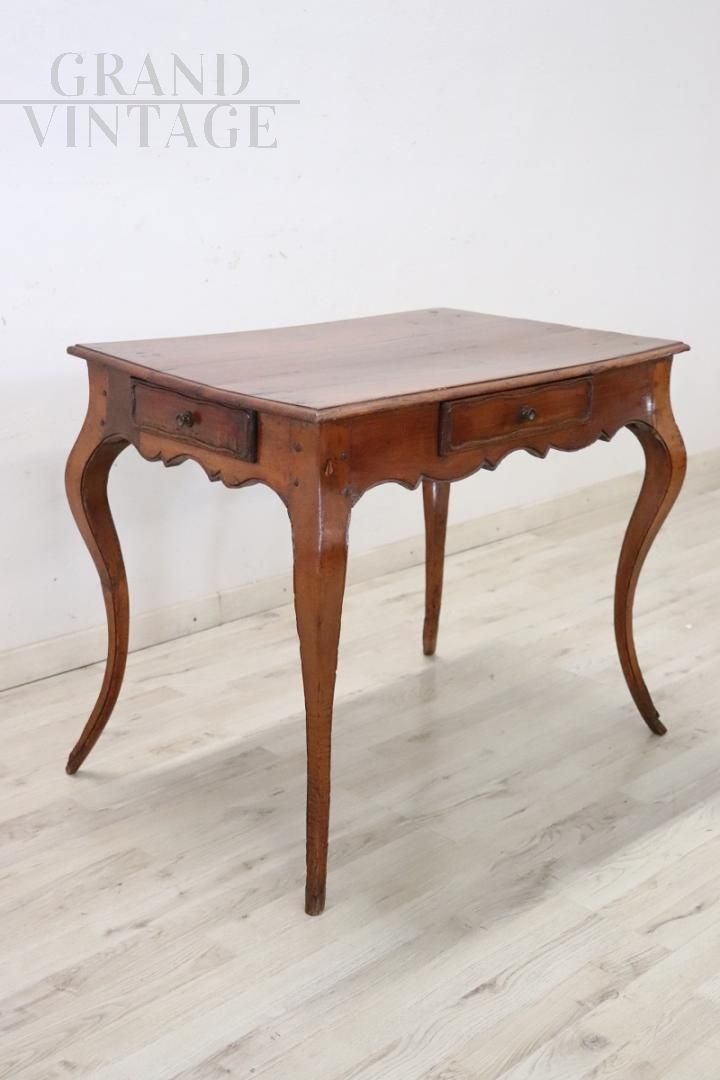 Questo splendido tavolo italiano, risalente al periodo Luigi XV del XVIII secolo, è un esempio eccezionale di maestria degli ebanisti italiani. Realizzato in legno massello di ciliegio, il tavolo unisce perfettamente fascino rustico e stile raffinato. Le gambe elegantemente sinuose ad encabriolè e la fascia mossa sotto al piano sono caratteristiche distintive di questa epoca, conferendo al tavolo un’estetica armoniosa e senza tempo. Ogni dettaglio è curato con precisione su tutti i lati, garantendo un fascino visivo da qualsiasi angolazione lo si osservi e la possibilità di posizionarlo anche a centro stanza. Il tavolo è dotato di un cassetto su ciascun lato, ideale per riporre piccoli oggetti senza compromettere l’estetica complessiva. Ottime condizioni, prezzo trattabile.